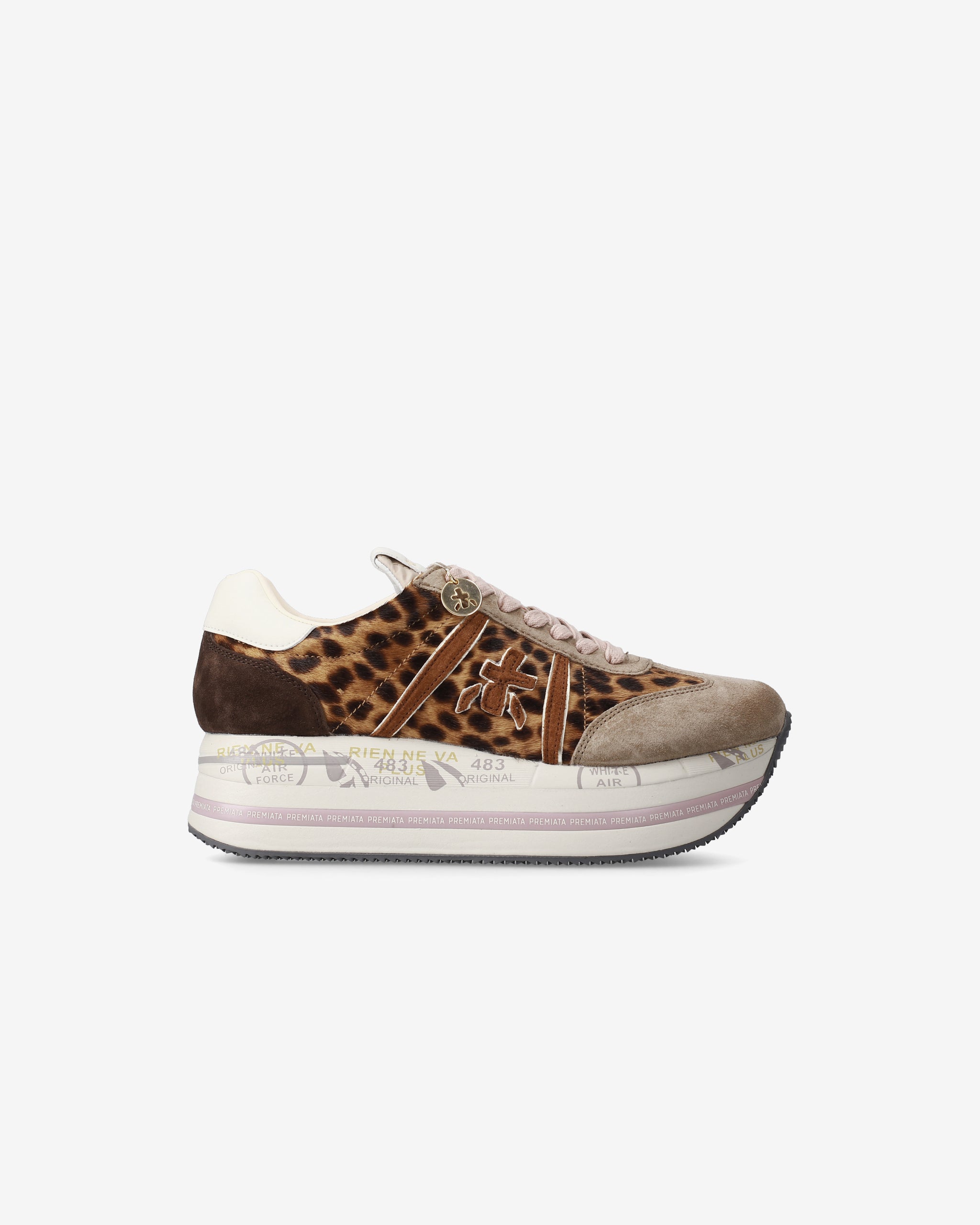 Beth with all-leopard upper in soft leather, with spots in warm tones that create a wild and refined effect. Elegant and striking silhouette.