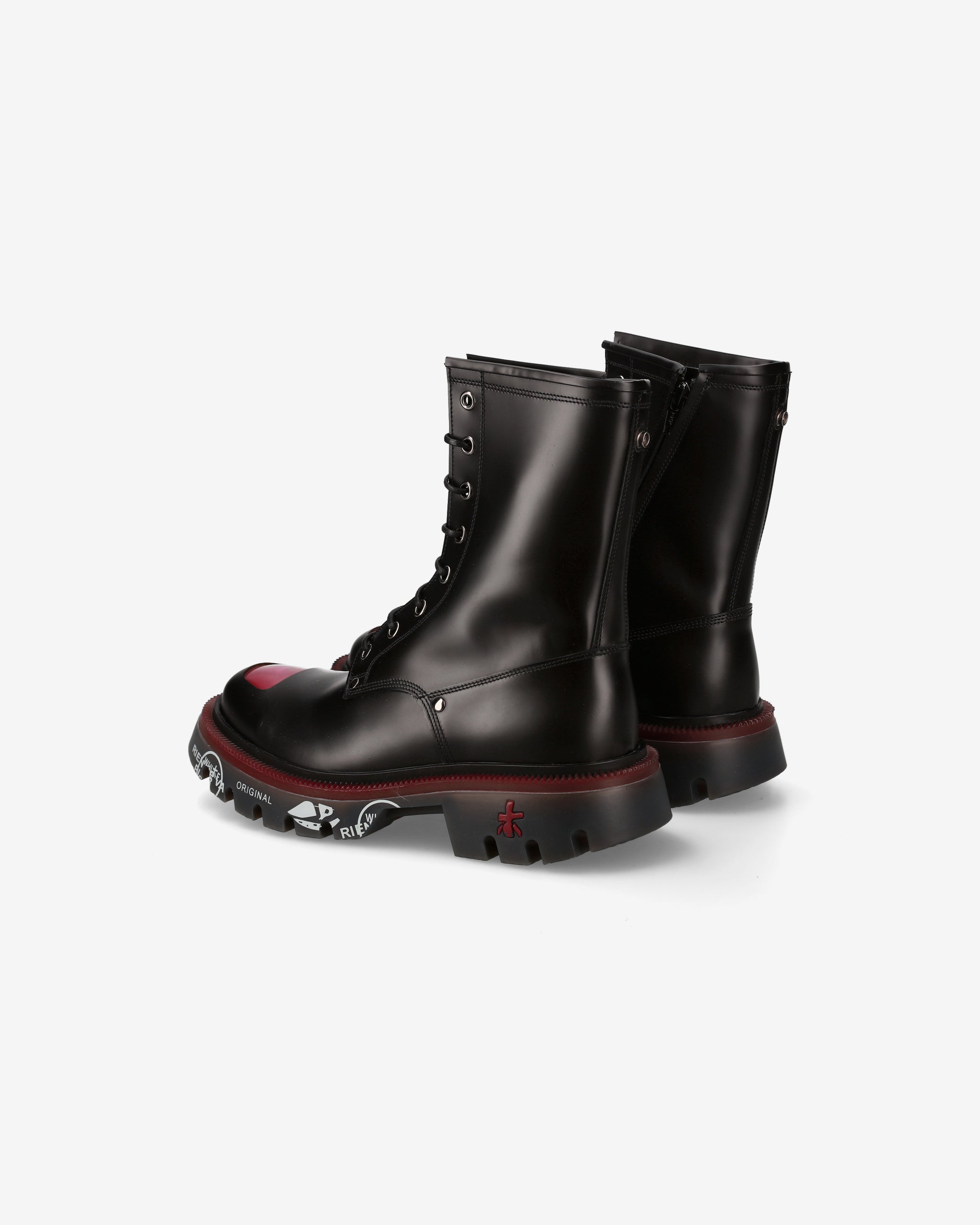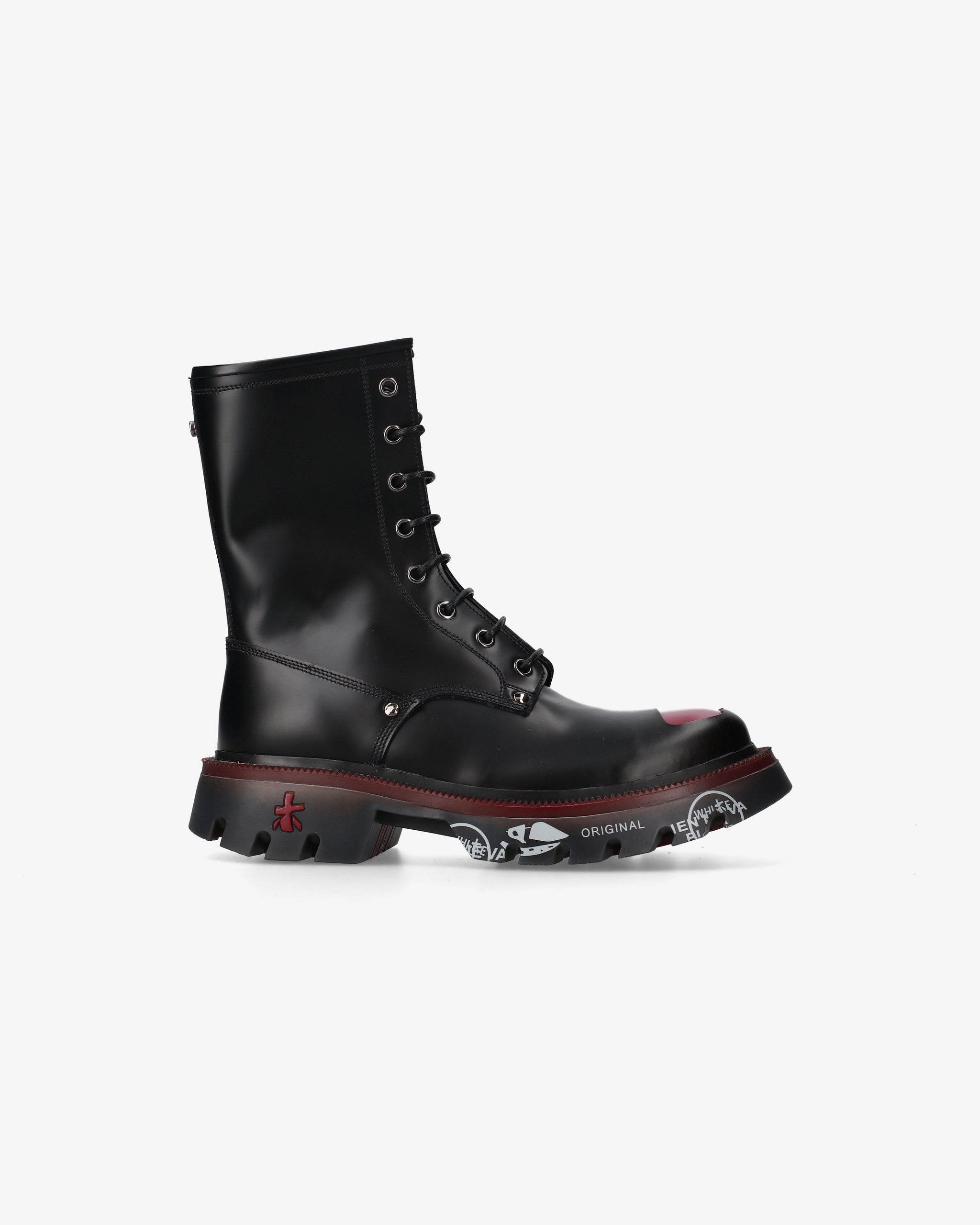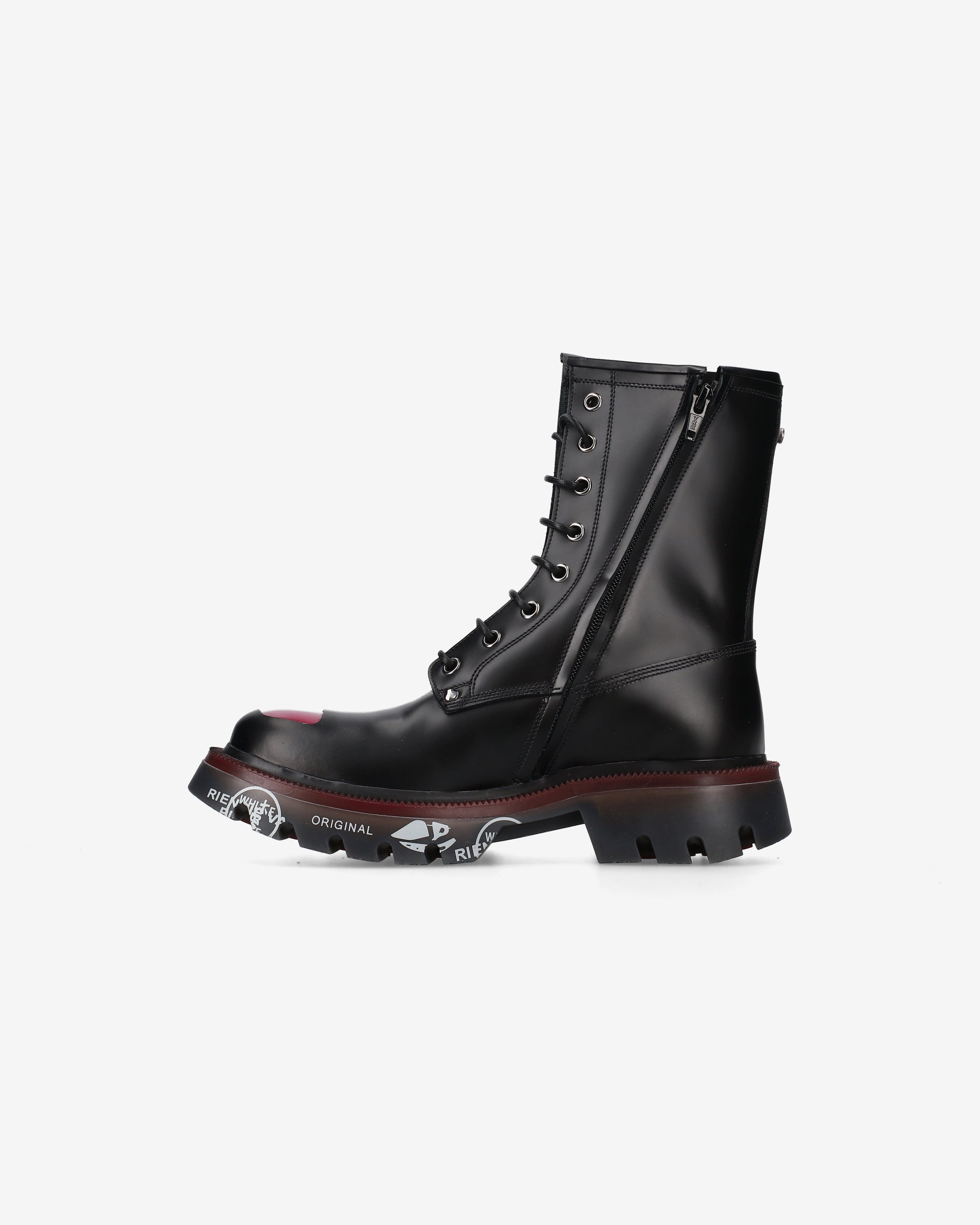 Black abrasivato amphibian with ABS toe cap and contrasting burgundy welt. A mix of polished elegance and bold details, inspired by London's underground aesthetic.