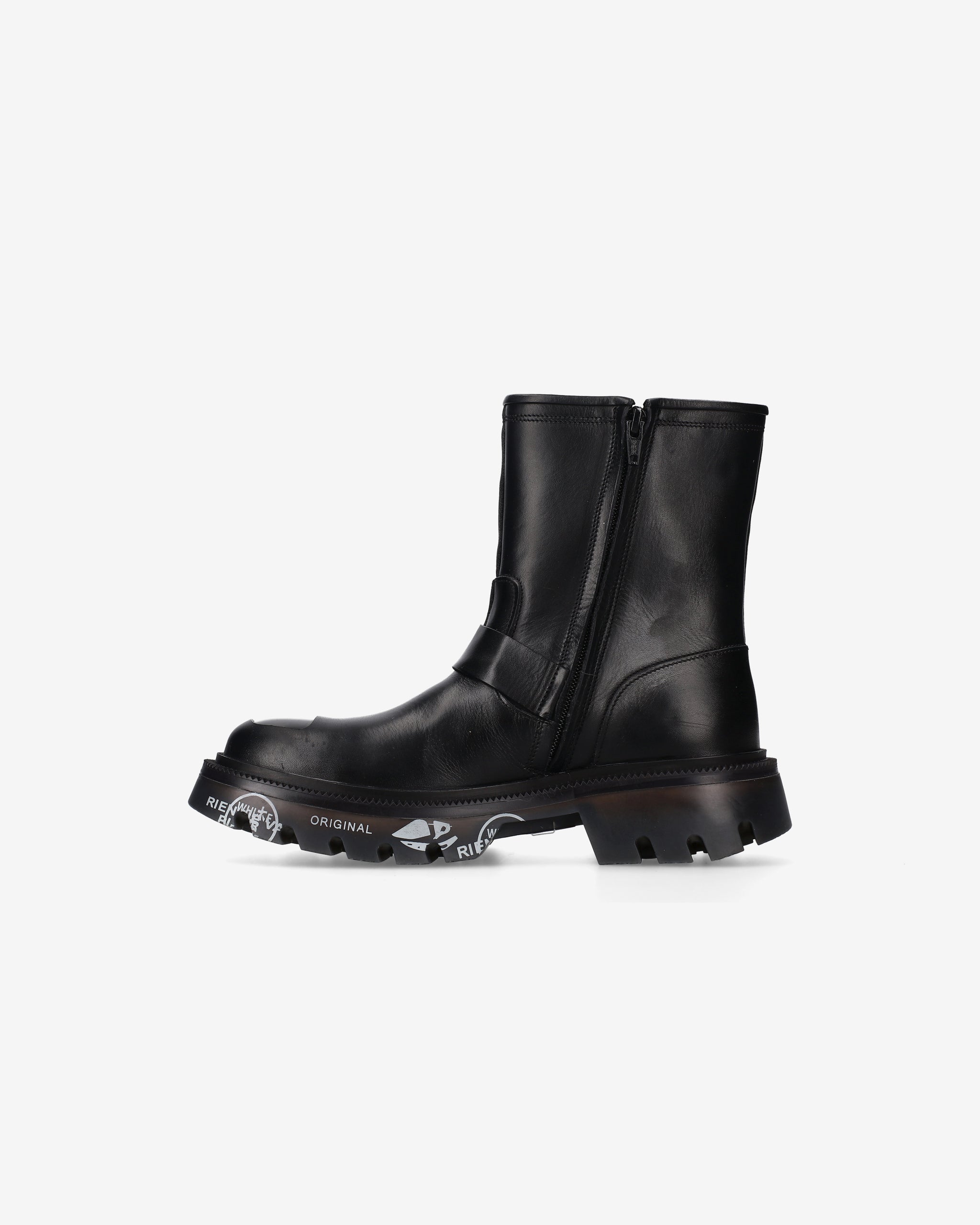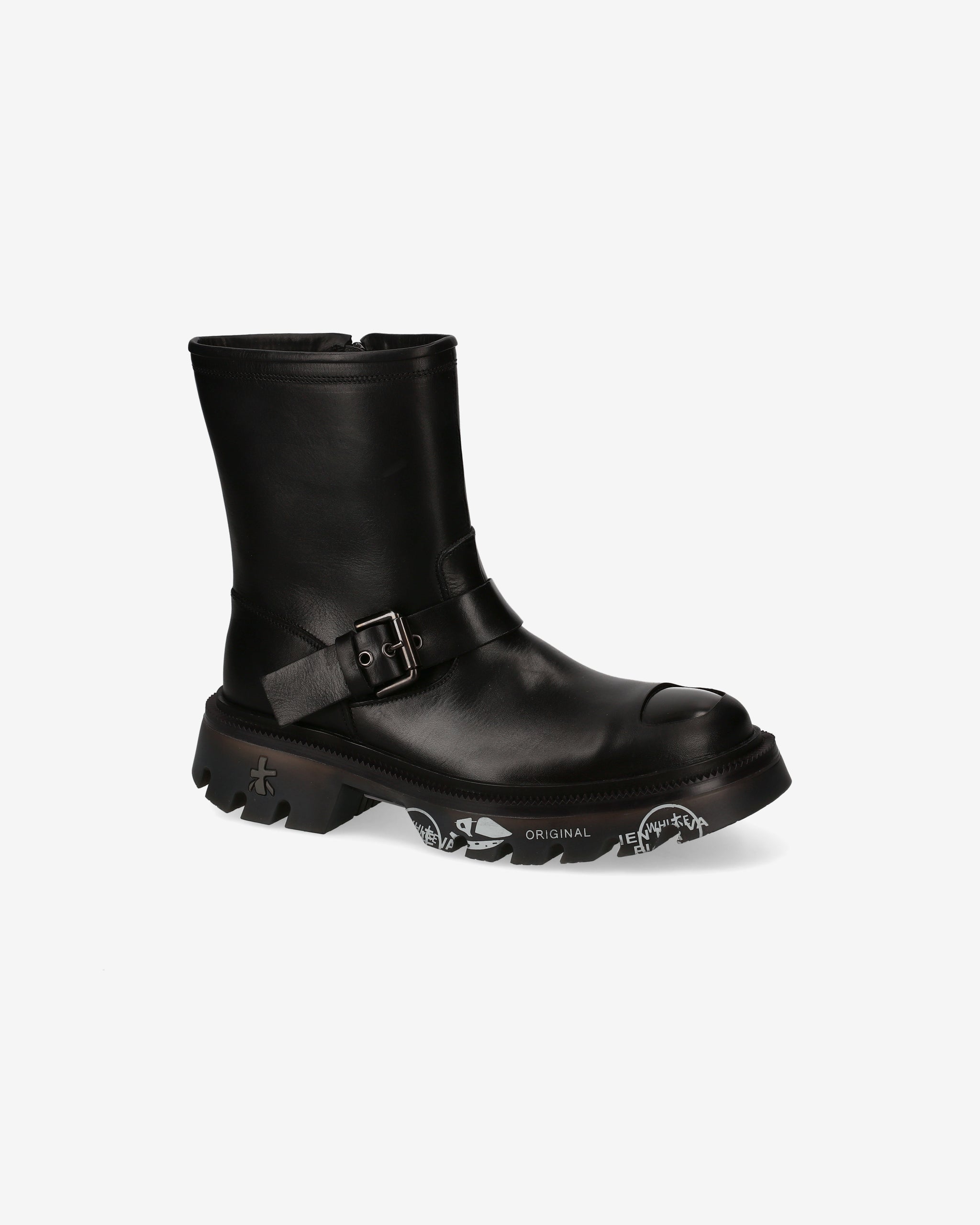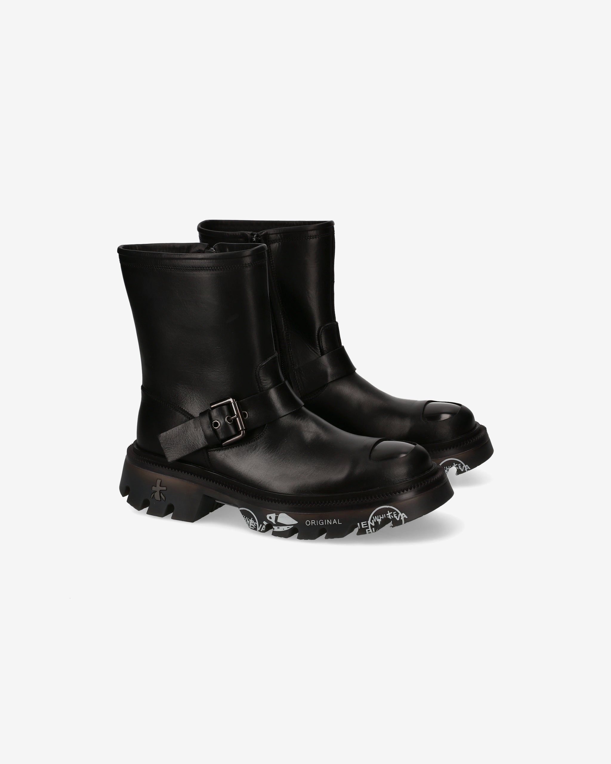 Calf leather biker with ABS toe cap and matching bottom. Strong lines and sturdy materials for an essential, gritty look inspired by London's underground aesthetic.