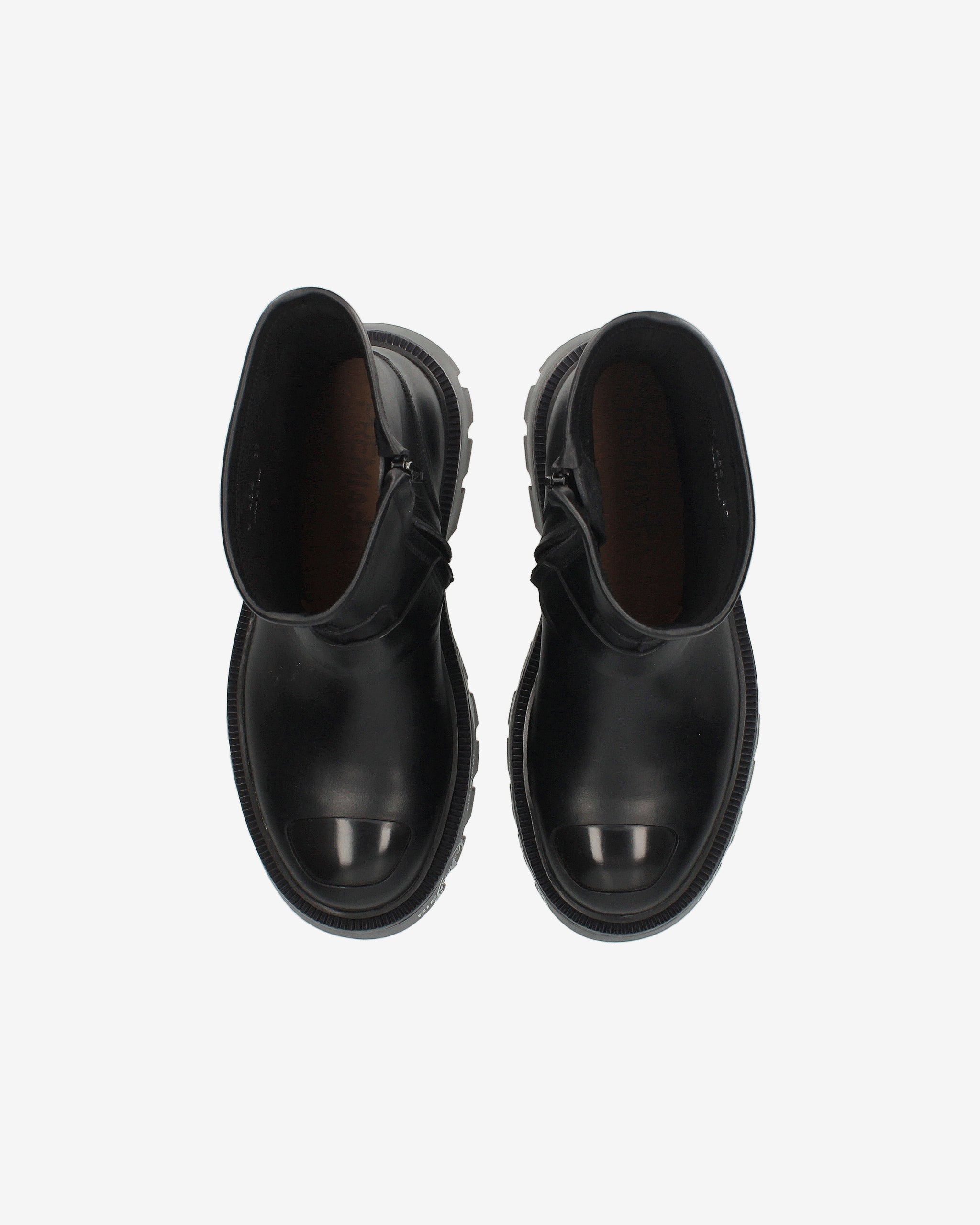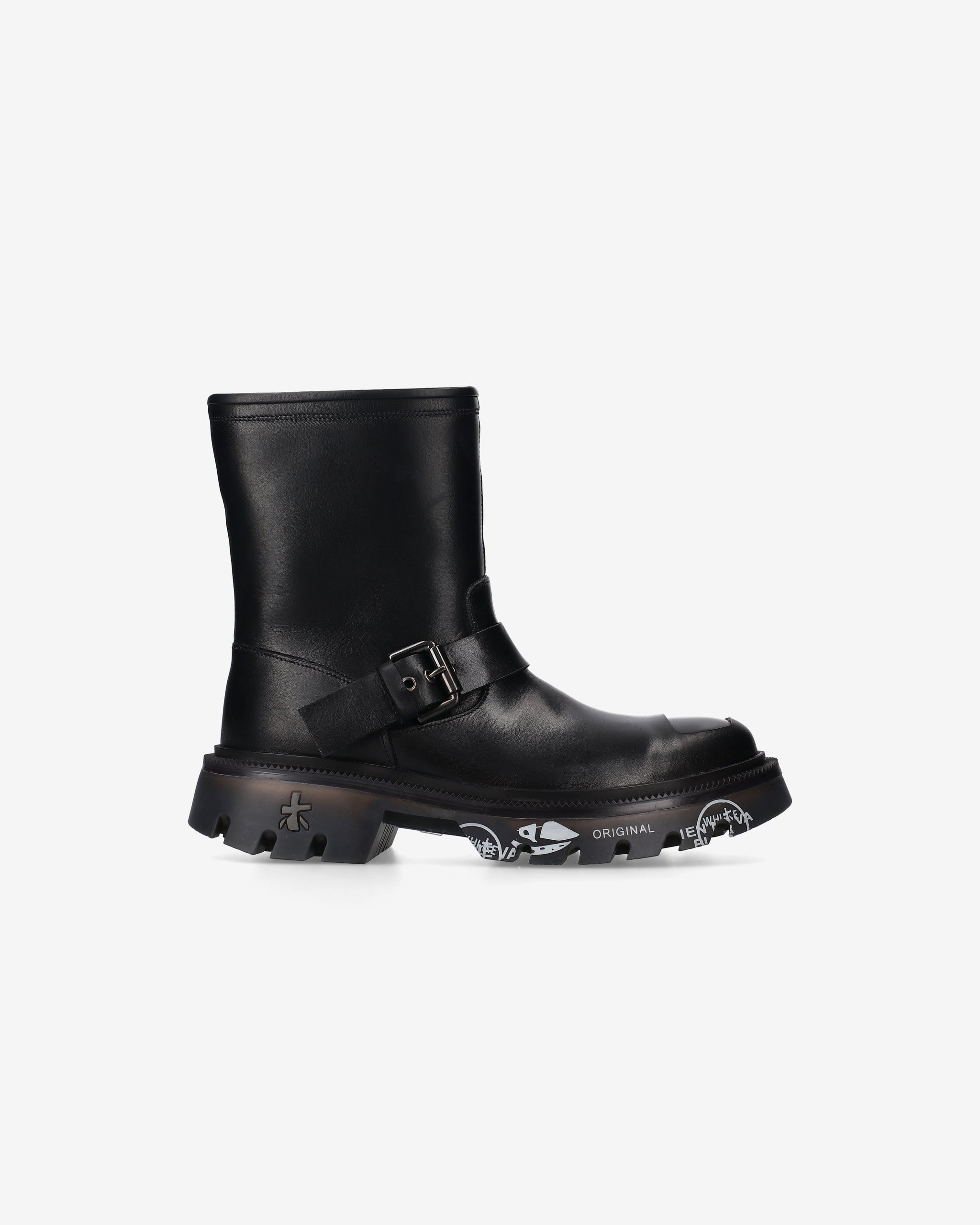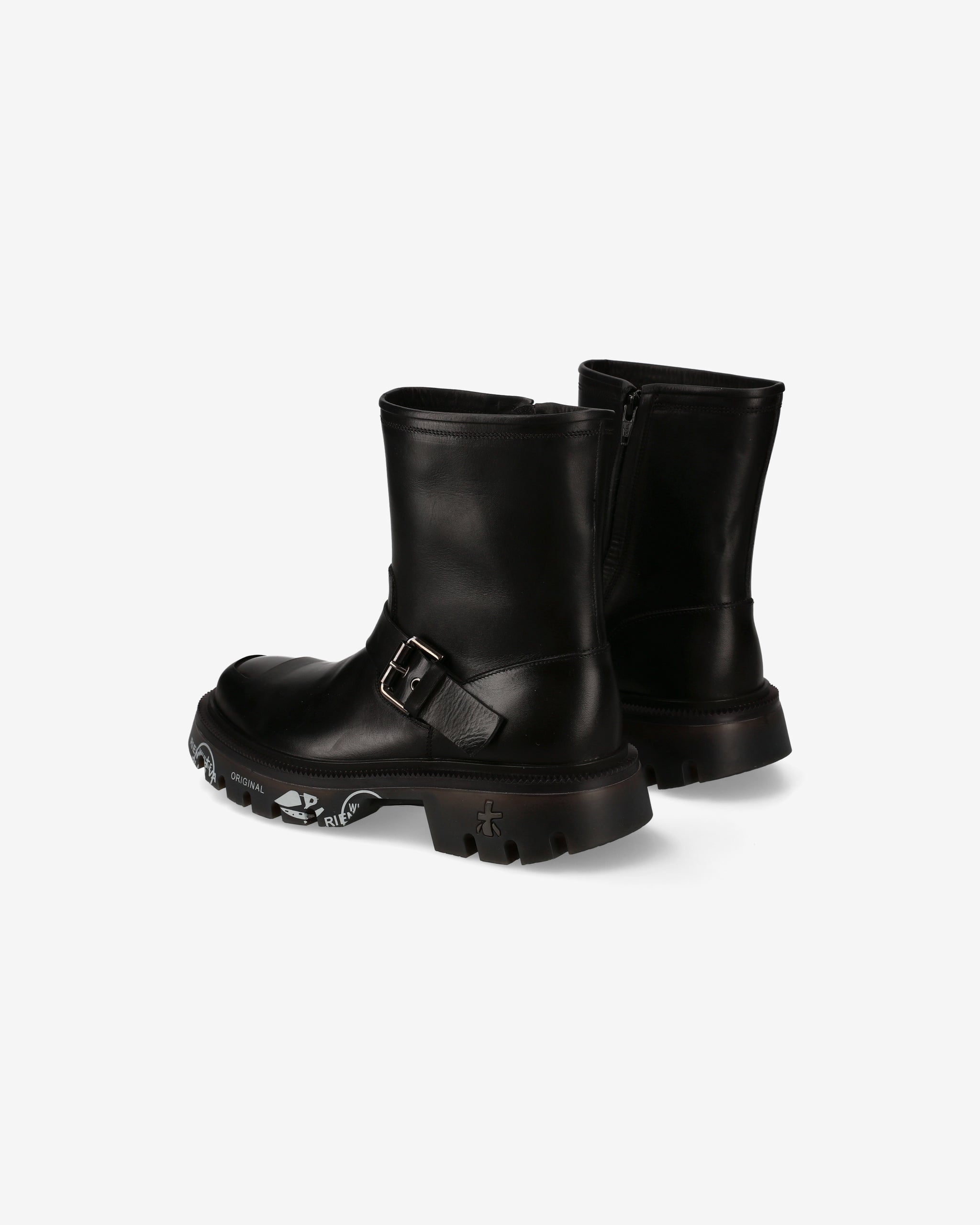 Calf leather biker with ABS toe cap and matching bottom. Strong lines and sturdy materials for an essential, gritty look inspired by London's underground aesthetic.