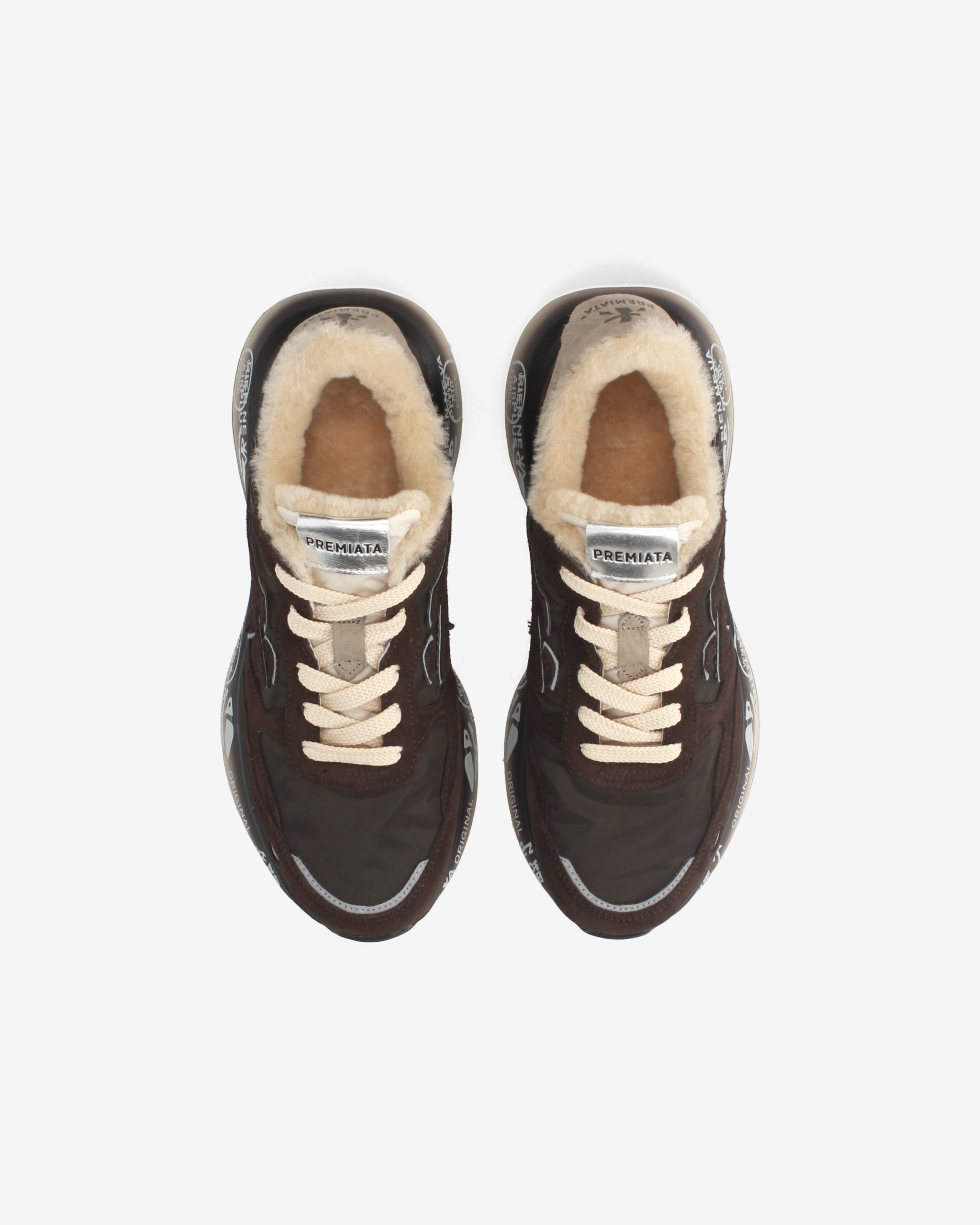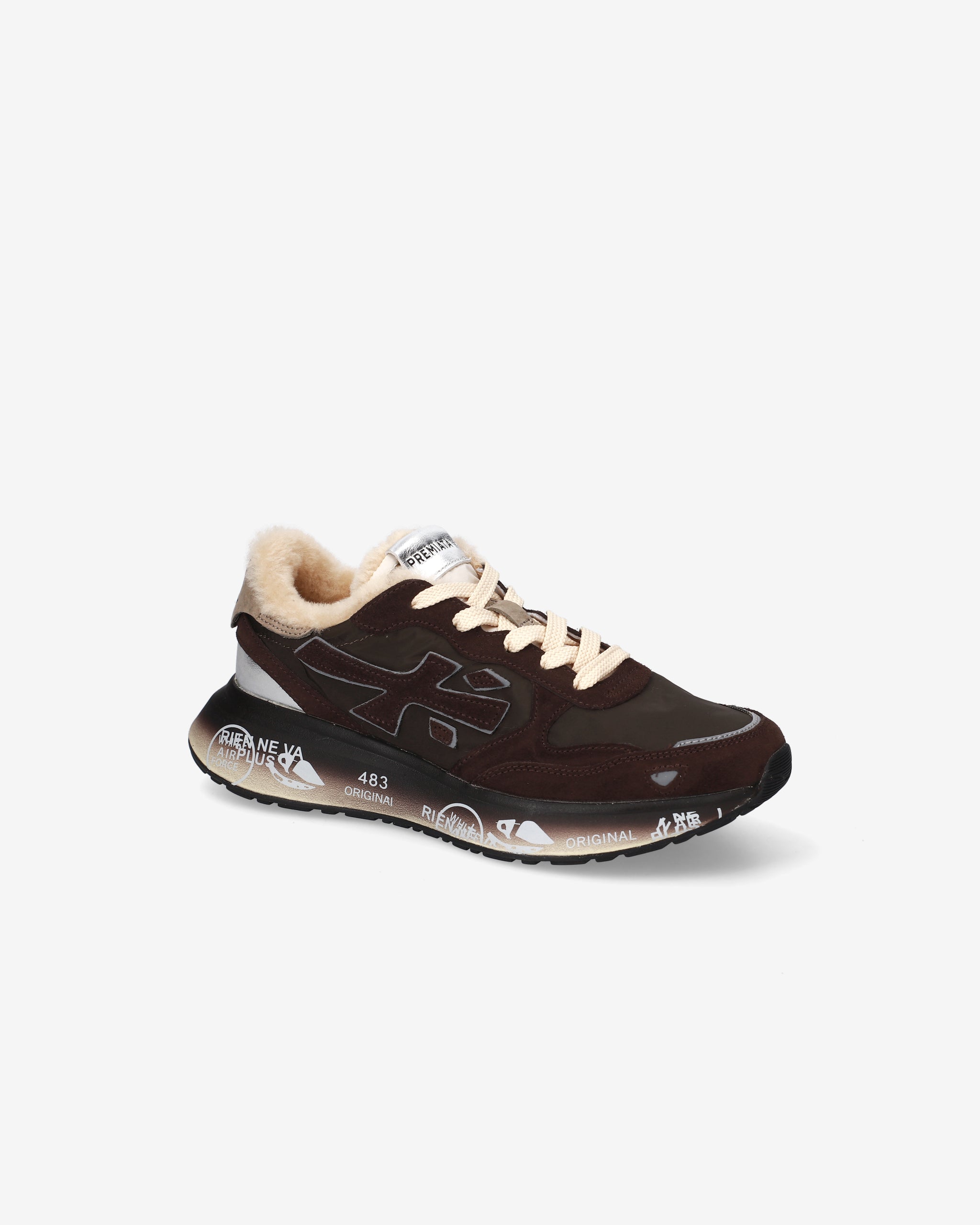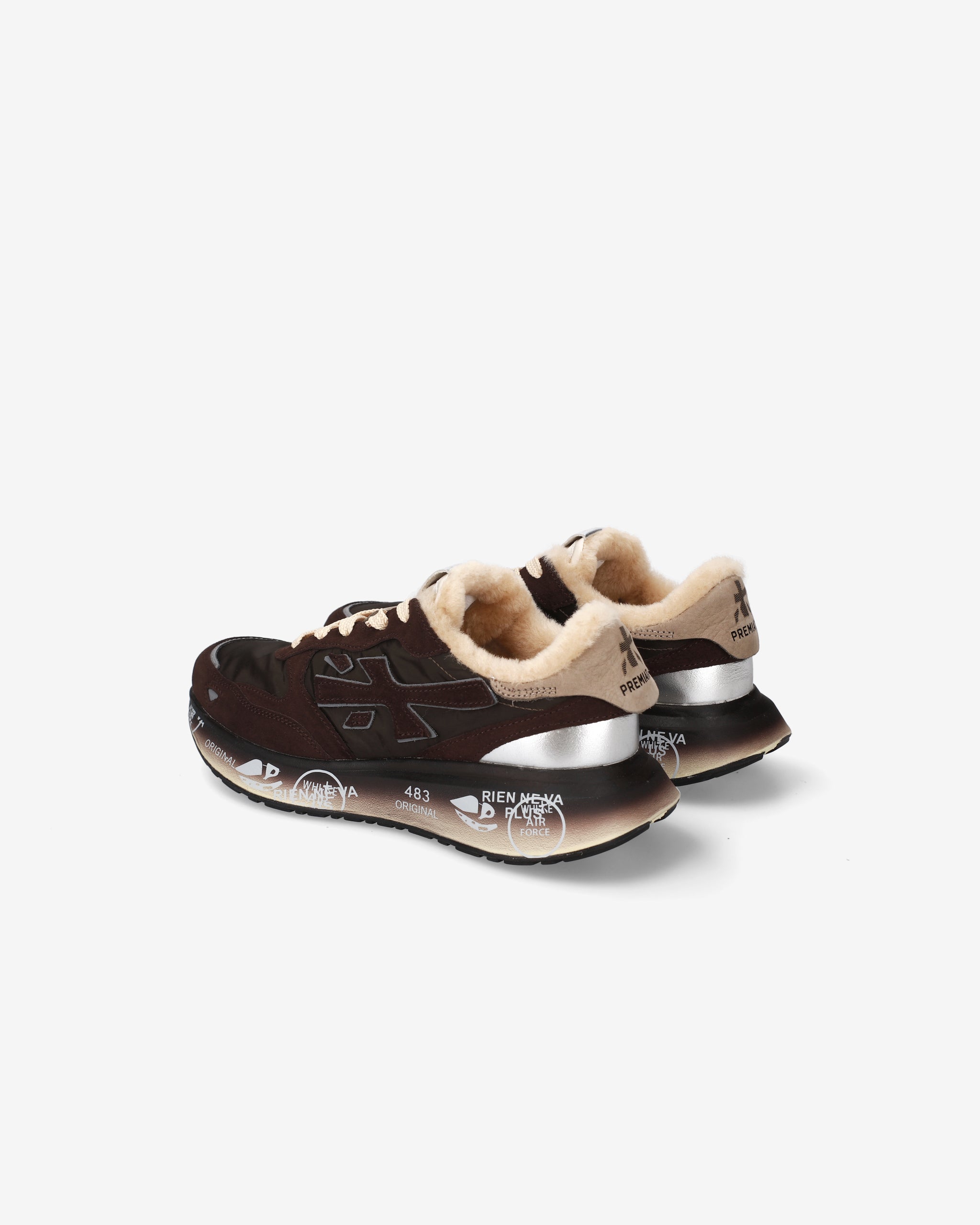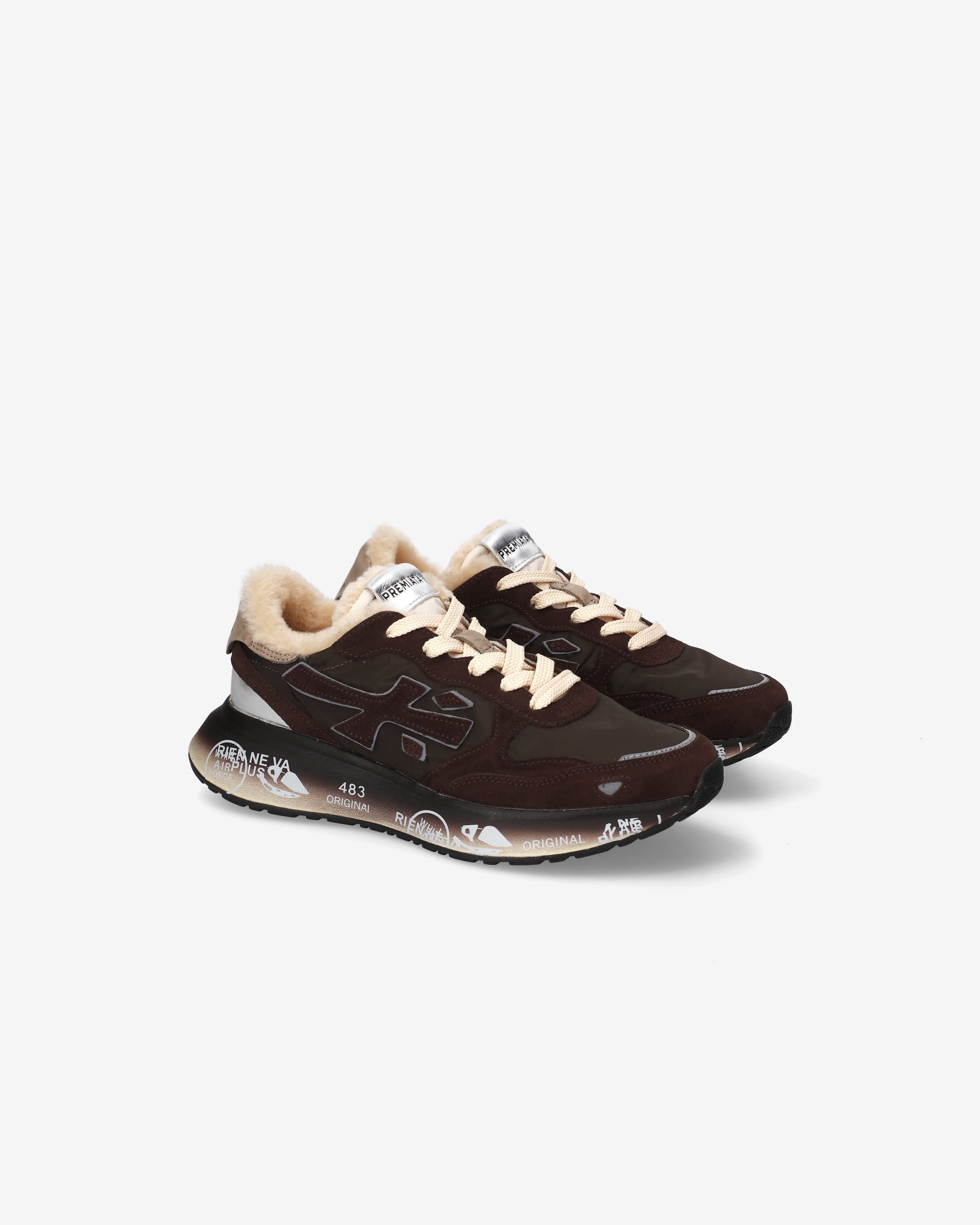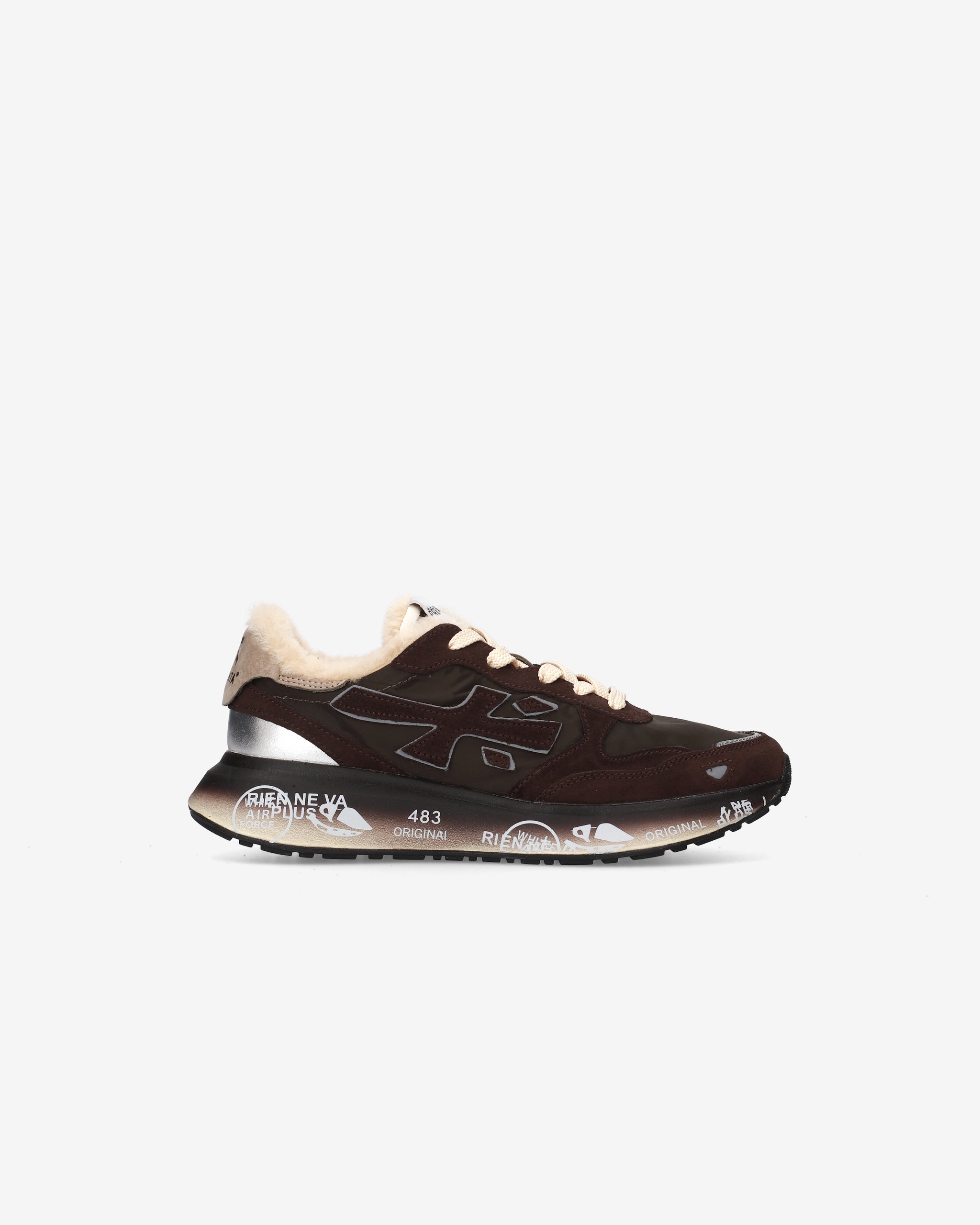 The sole, enhanced by Premiata's iconic style details, enhances the urban, casual-chic identity.