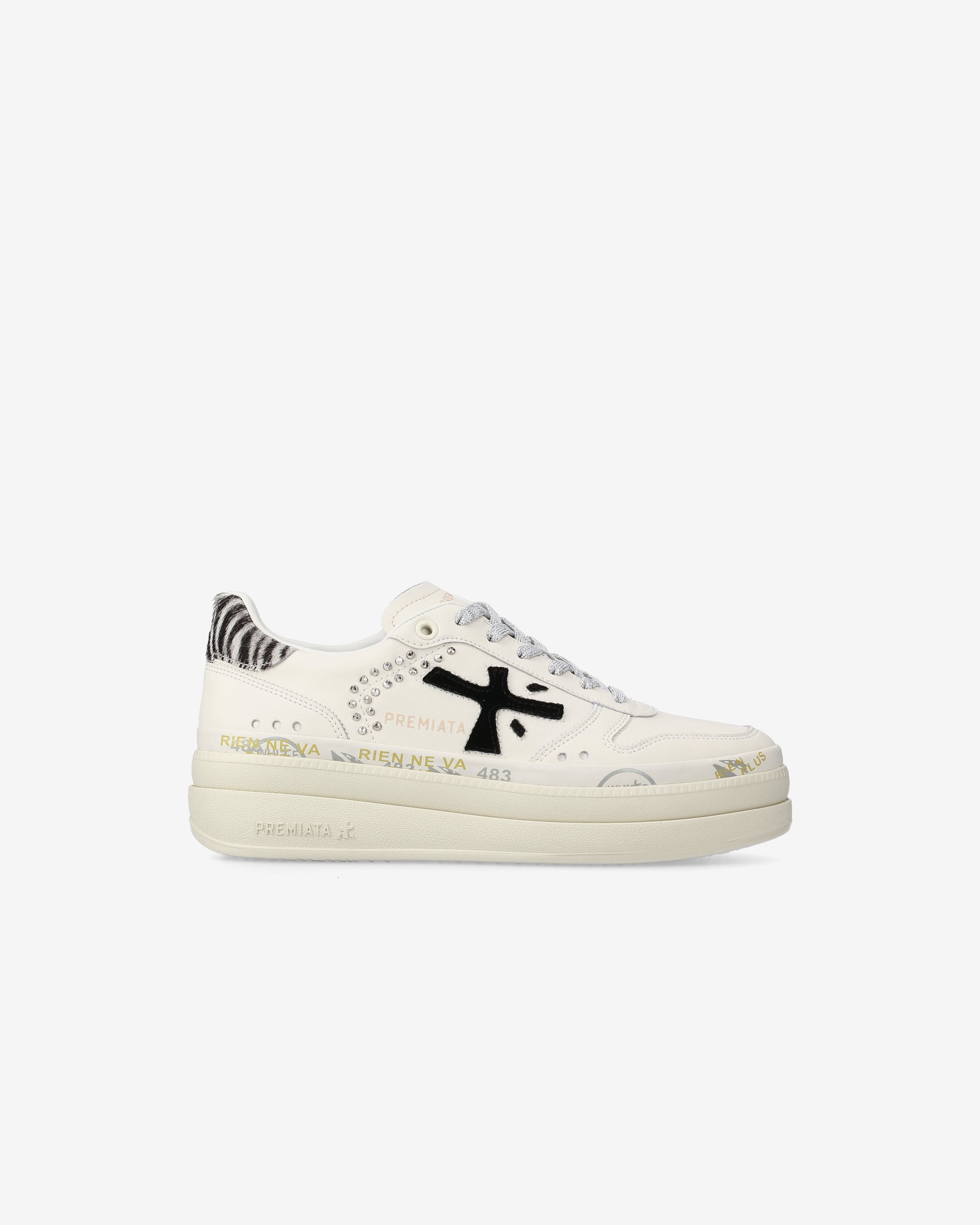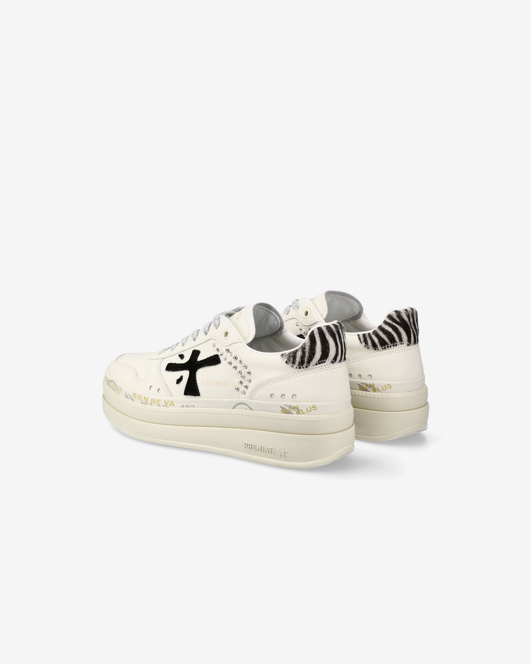 Among Premiata's new must-haves. Style reaches new heights, combining designs such as a double-layered platform sole with a midsole embellished with the brand's iconic stamps.