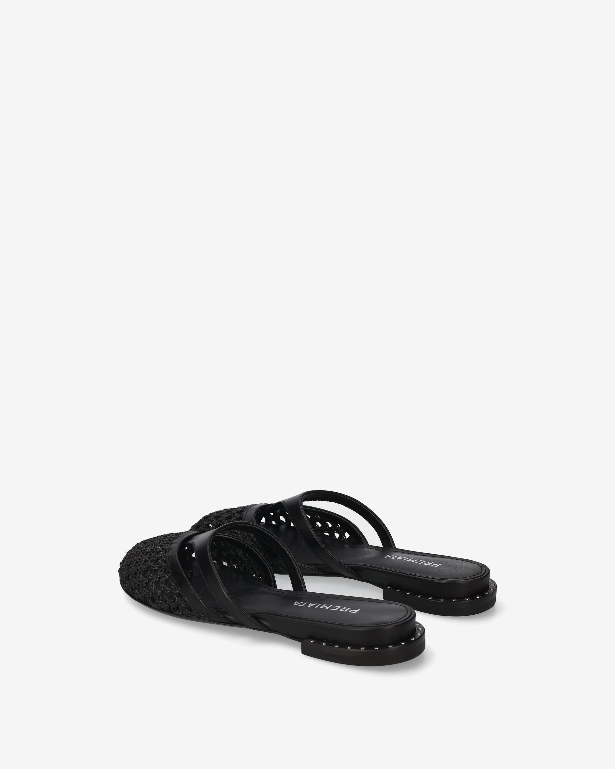 These flat sabots combine the material elegance of woven fabric with a geometric strap design. A lightweight and sophisticated shoe, perfect for enhancing outfits with a touch of contemporary craftsmanship.