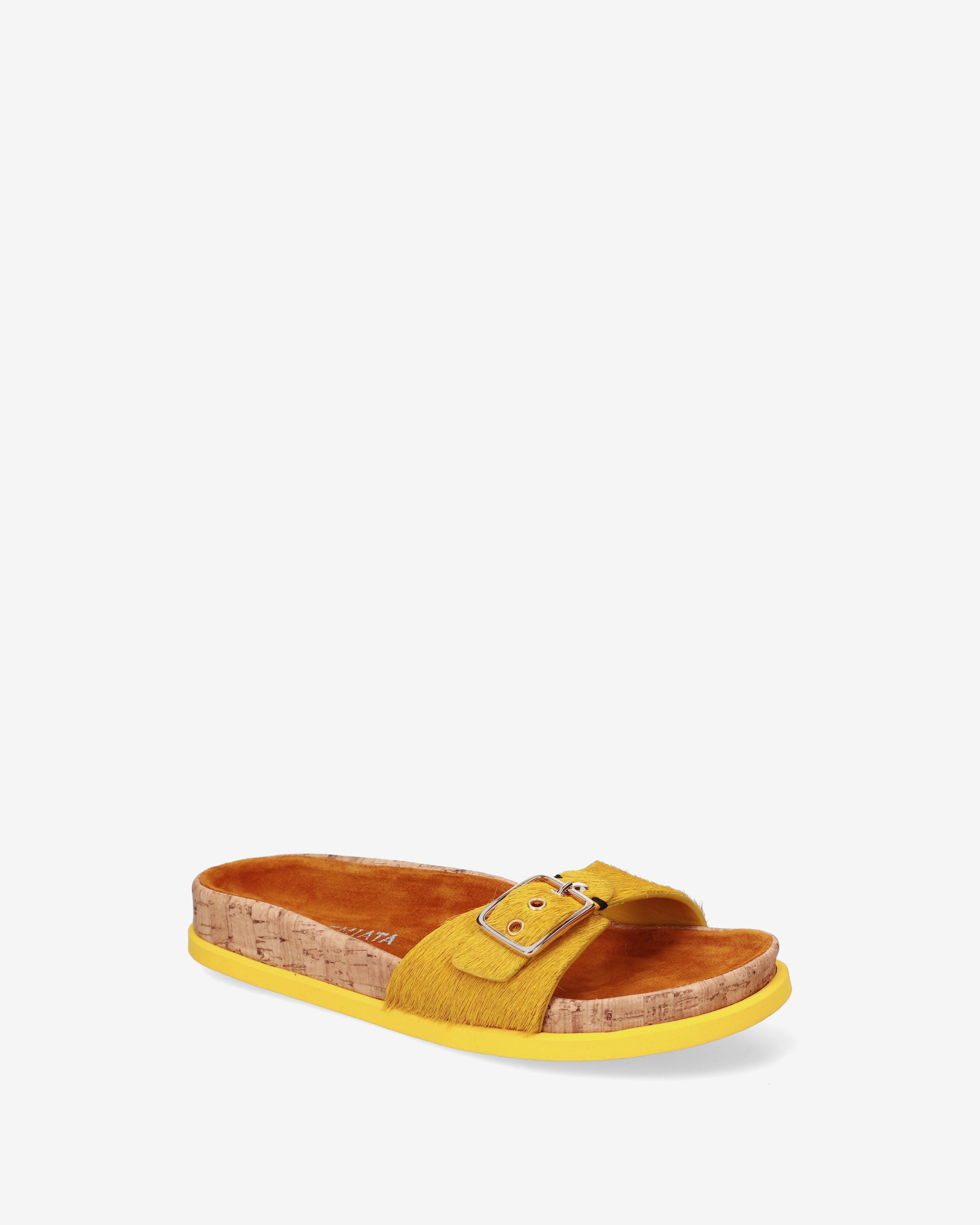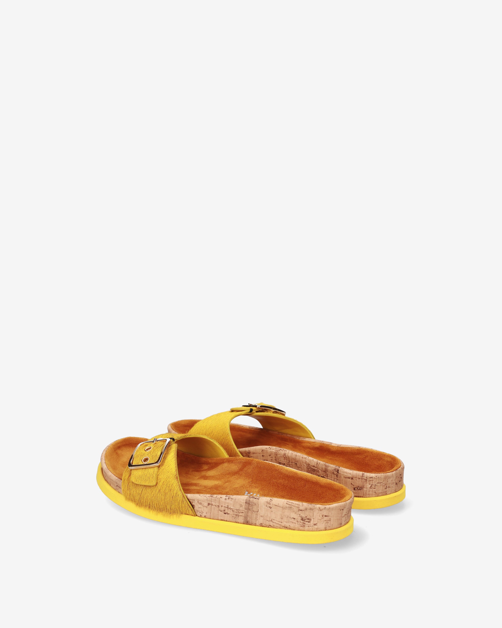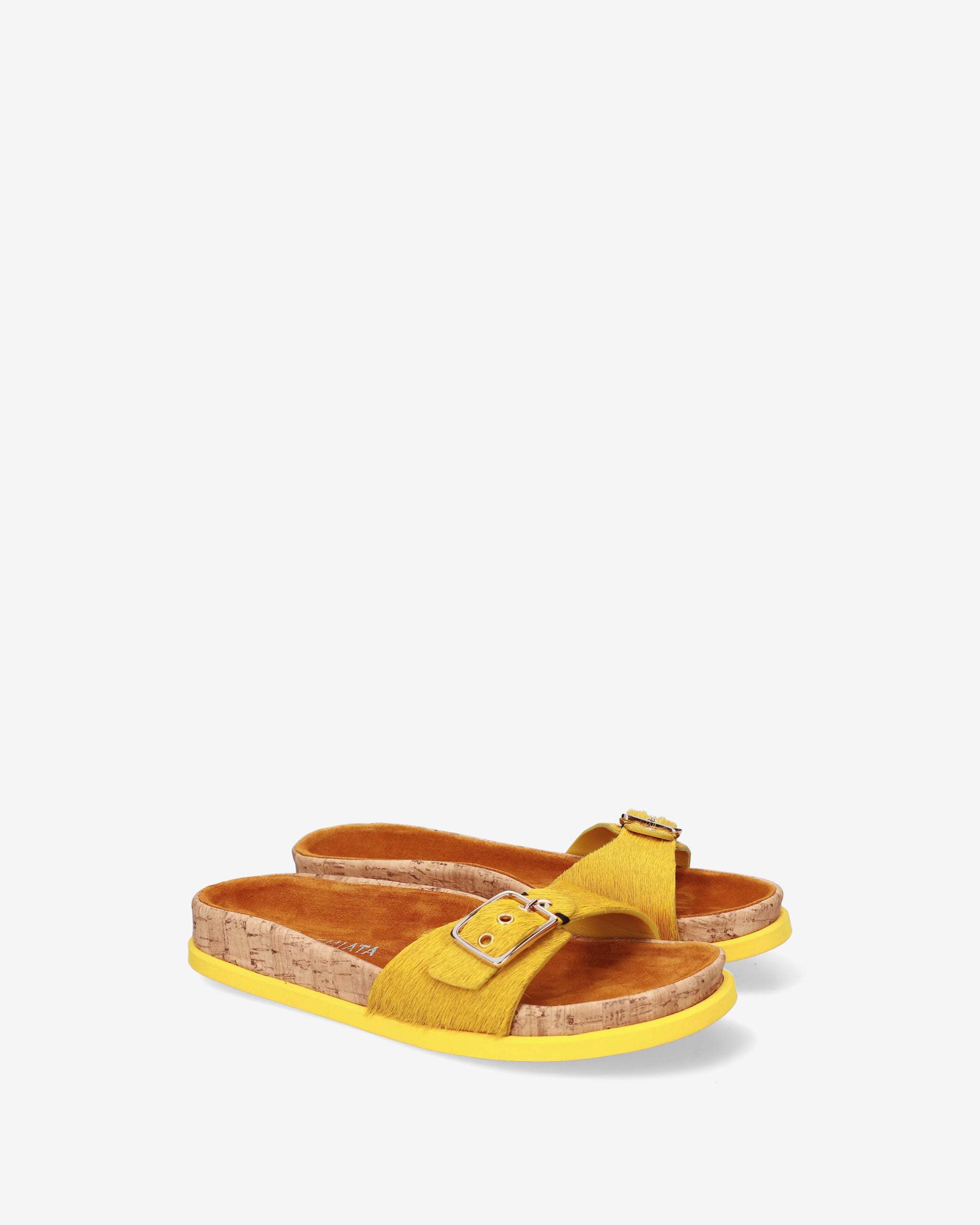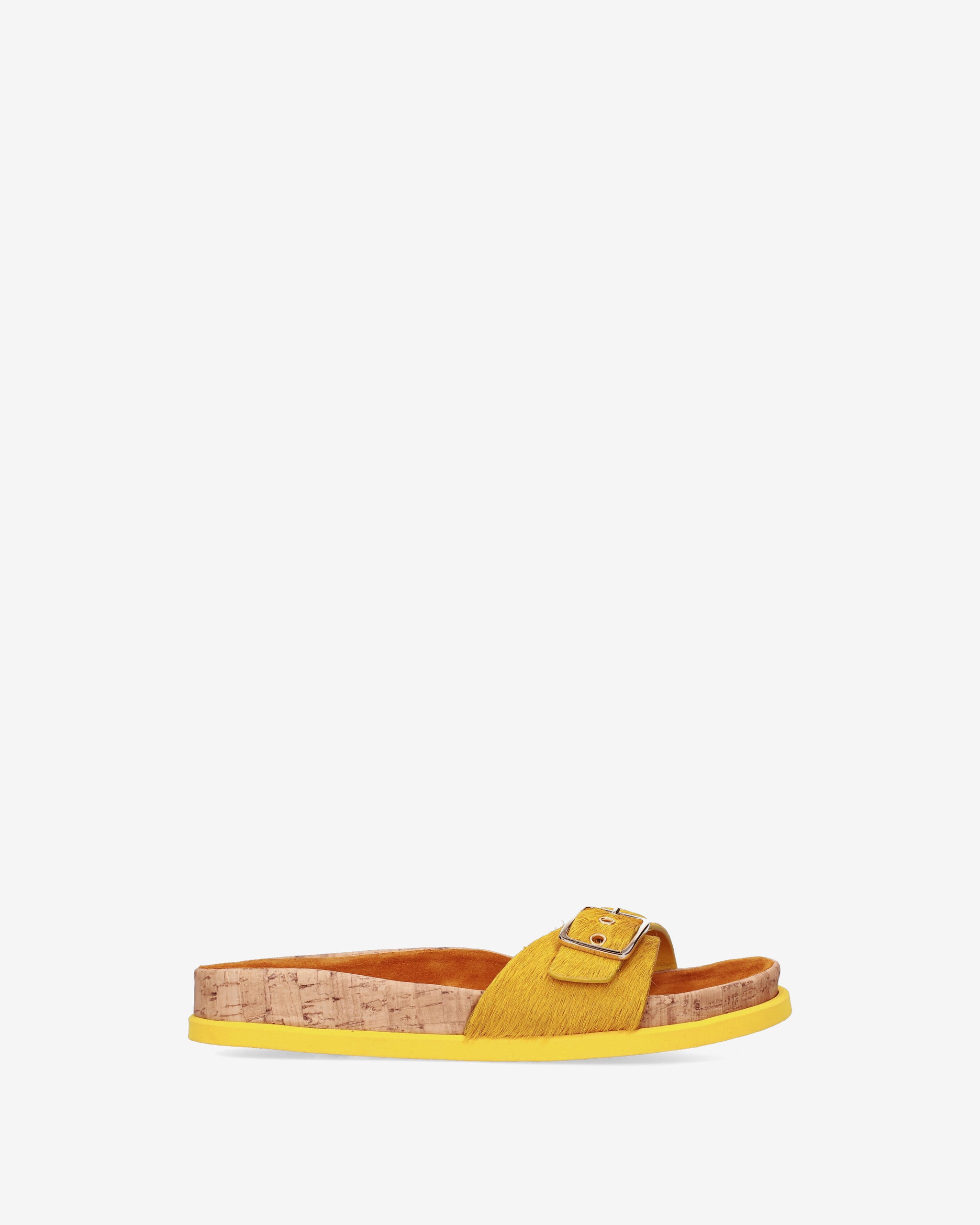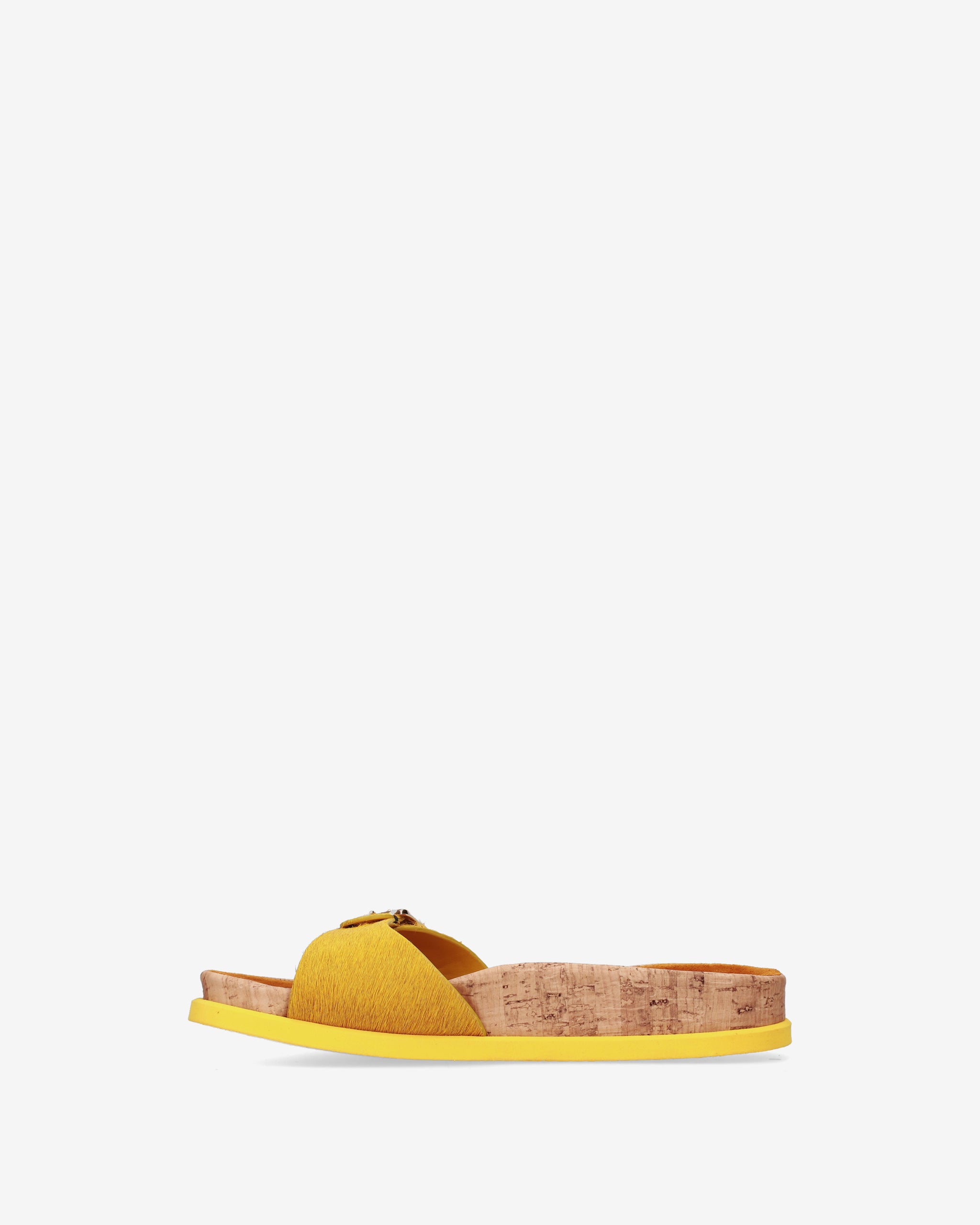 This flat sandal reinterprets the concept of flat footwear with a sophisticated mix of materials and a vibrant color. A style that combines the natural aesthetic of cork with the luxurious texture of horsy leather, perfect for a distinctive and comfortable summer look.