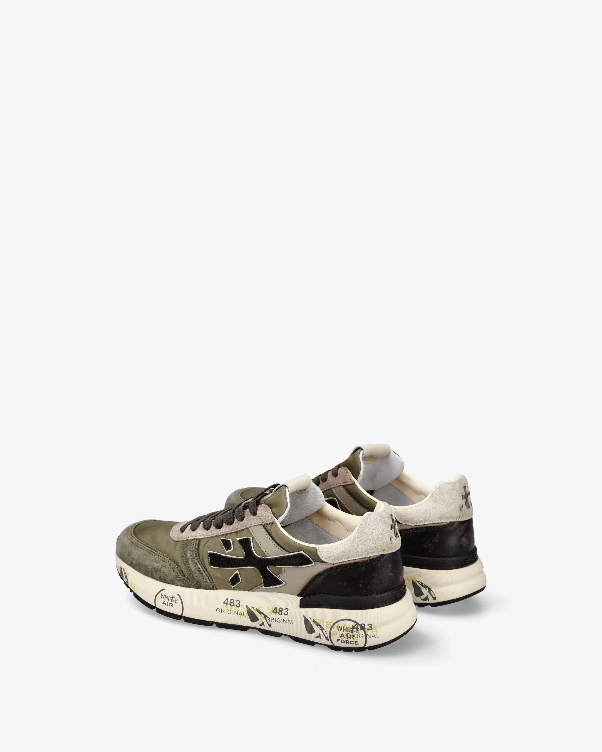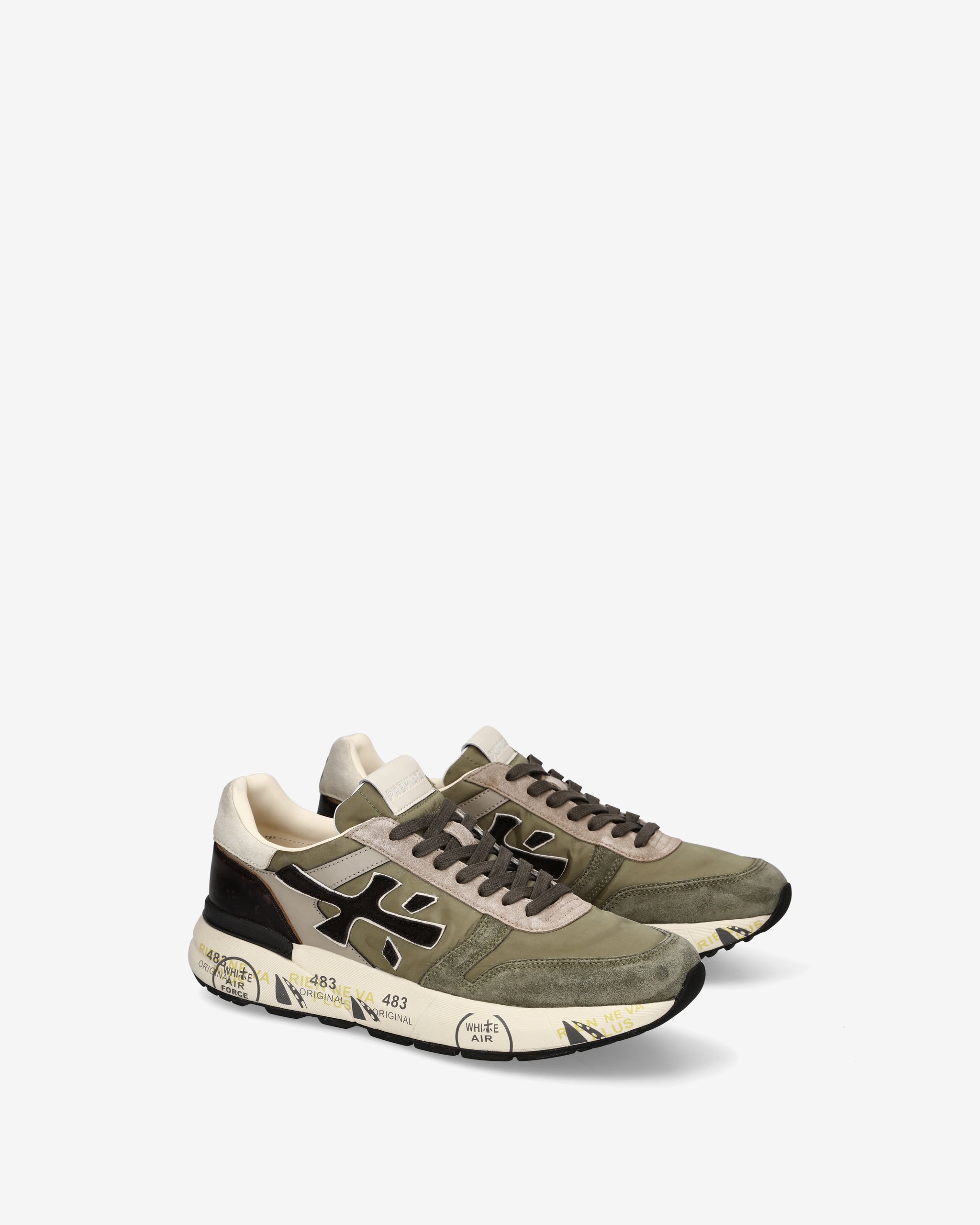 A mix of quality materials and leathers. The shoe is made in shades of green for a casual style. The iconic silhouette is enhanced by the Premiata logo.
