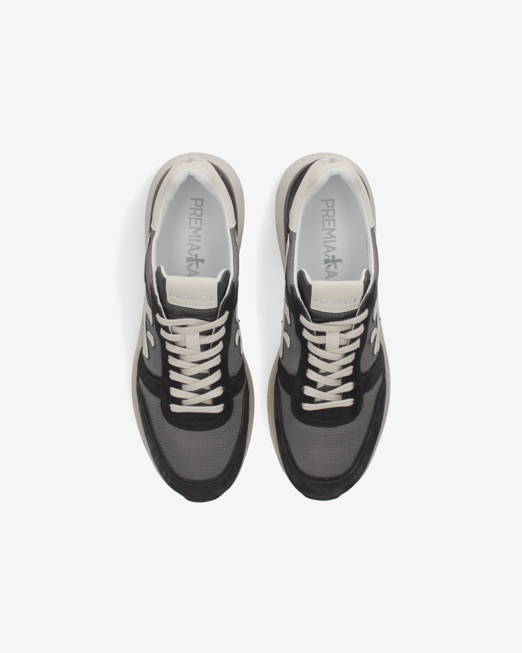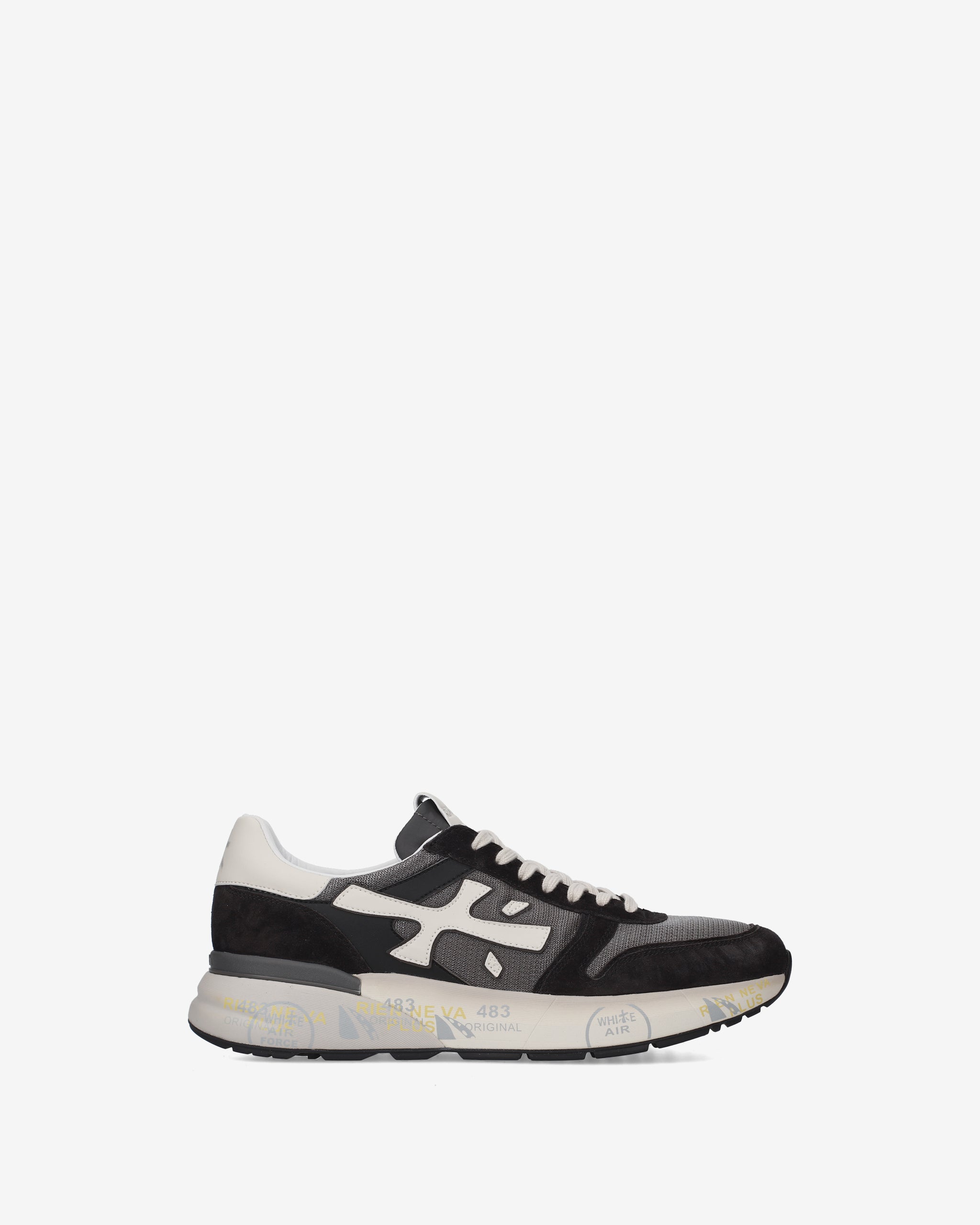 A mix of quality materials and leathers. The shoe is made in dark shades for a casual style. The iconic silhouette is enhanced by the Premiata logo.