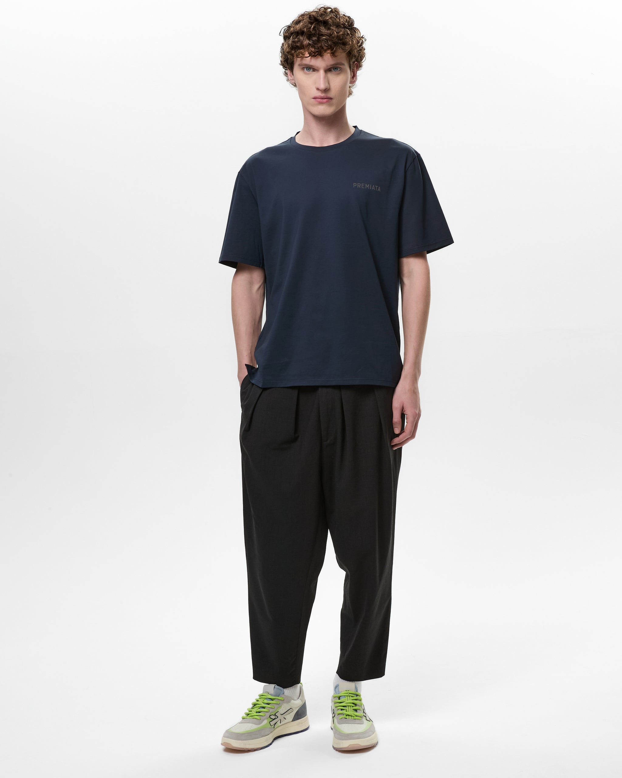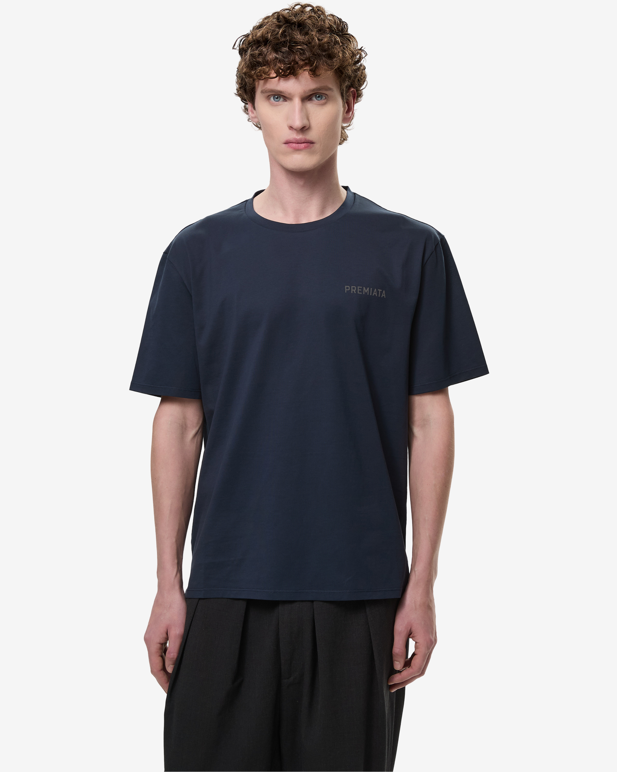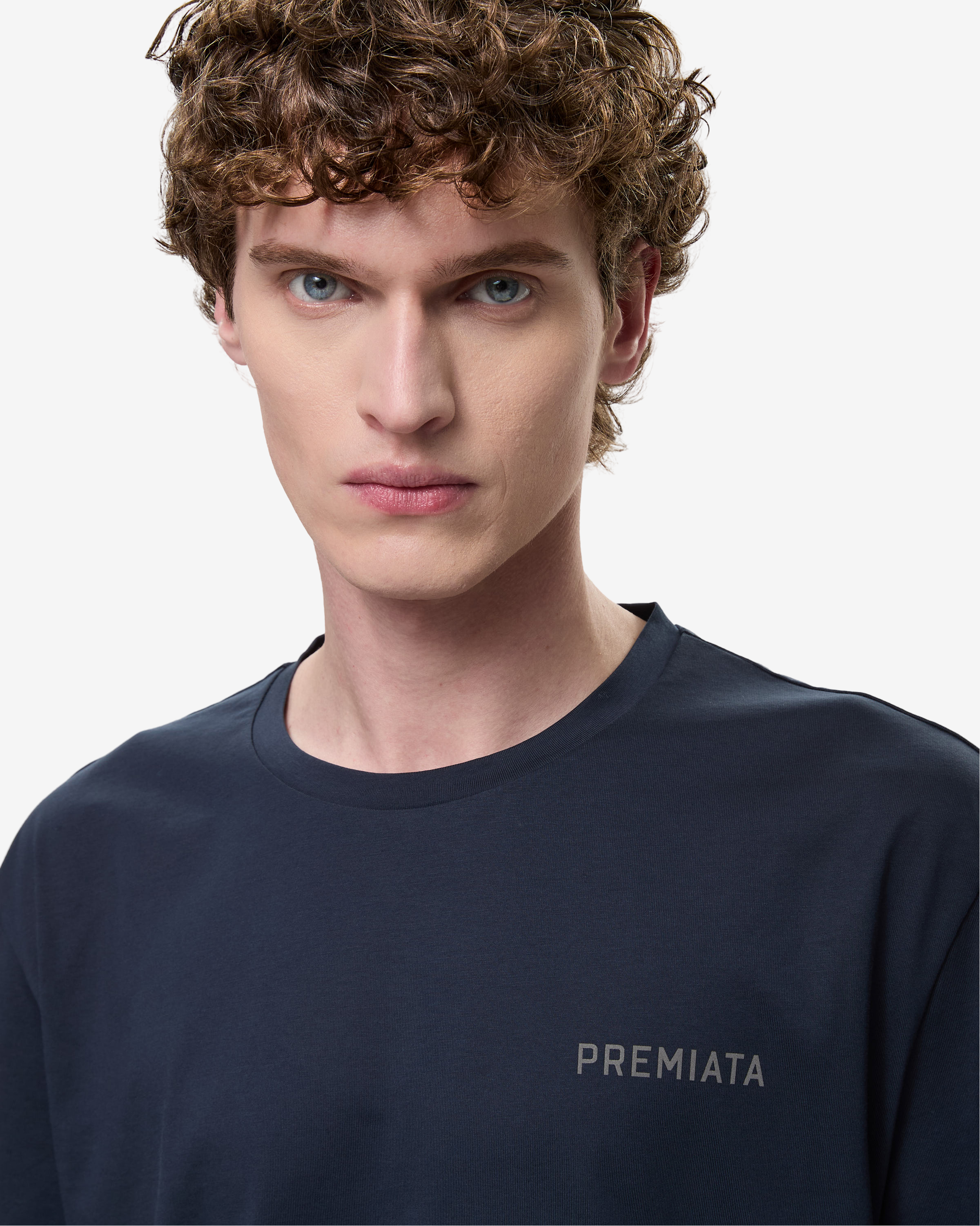 Soft cotton jersey T-shirt with slits at the bottom and longer back hem.Contrast color yarn rafter detail, "PREMIATA" logo printed on the left chest.Our 3-hole badge on the center back is laser made and attached with PU heat transfer