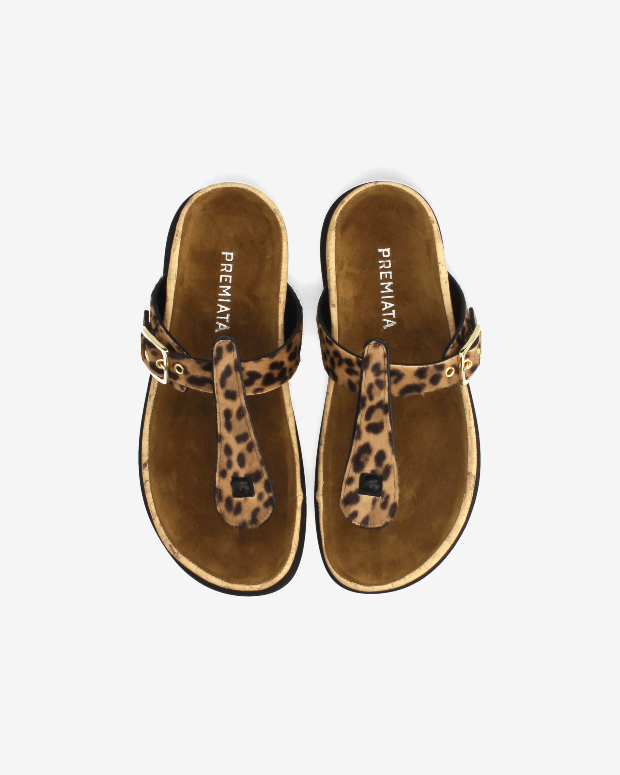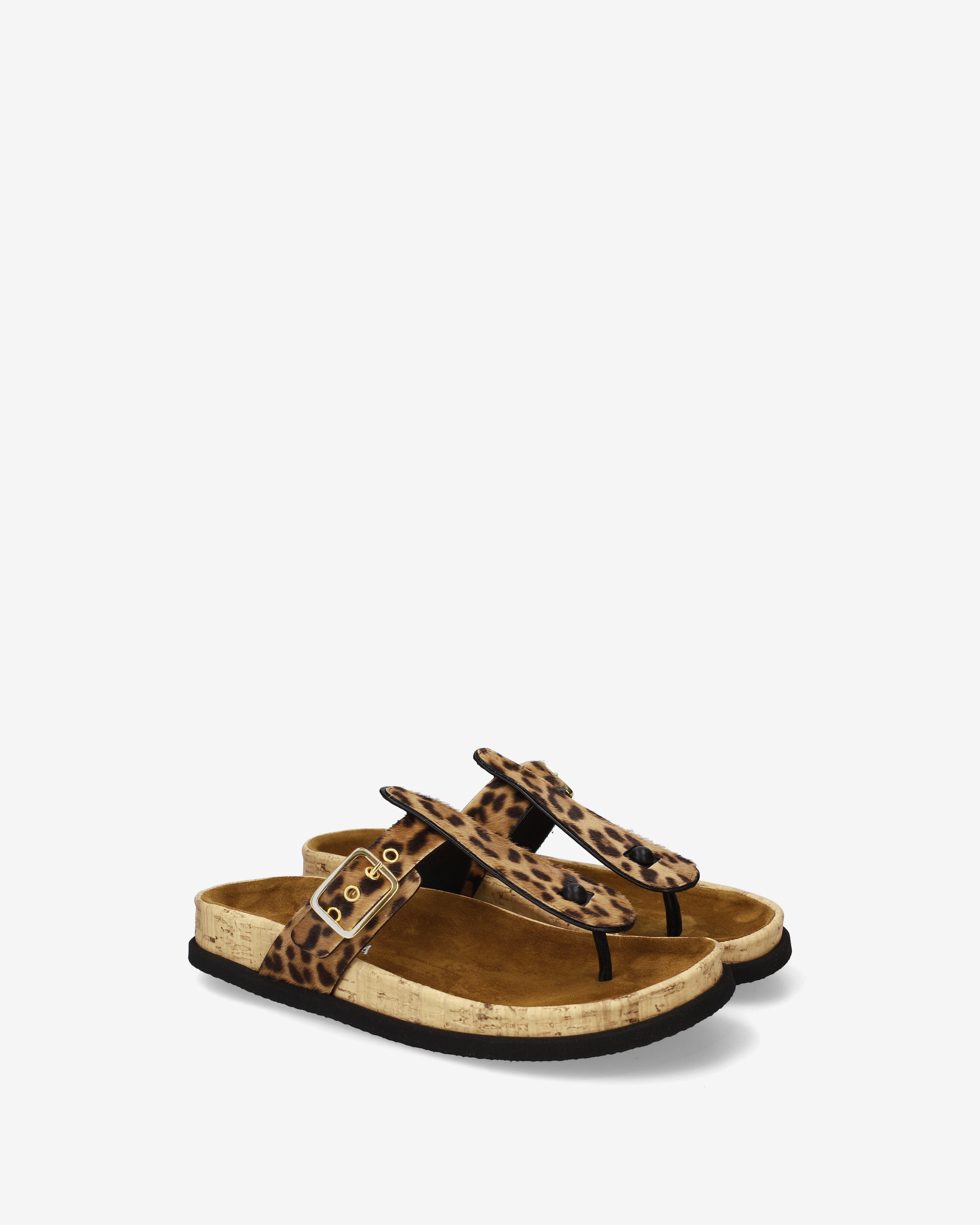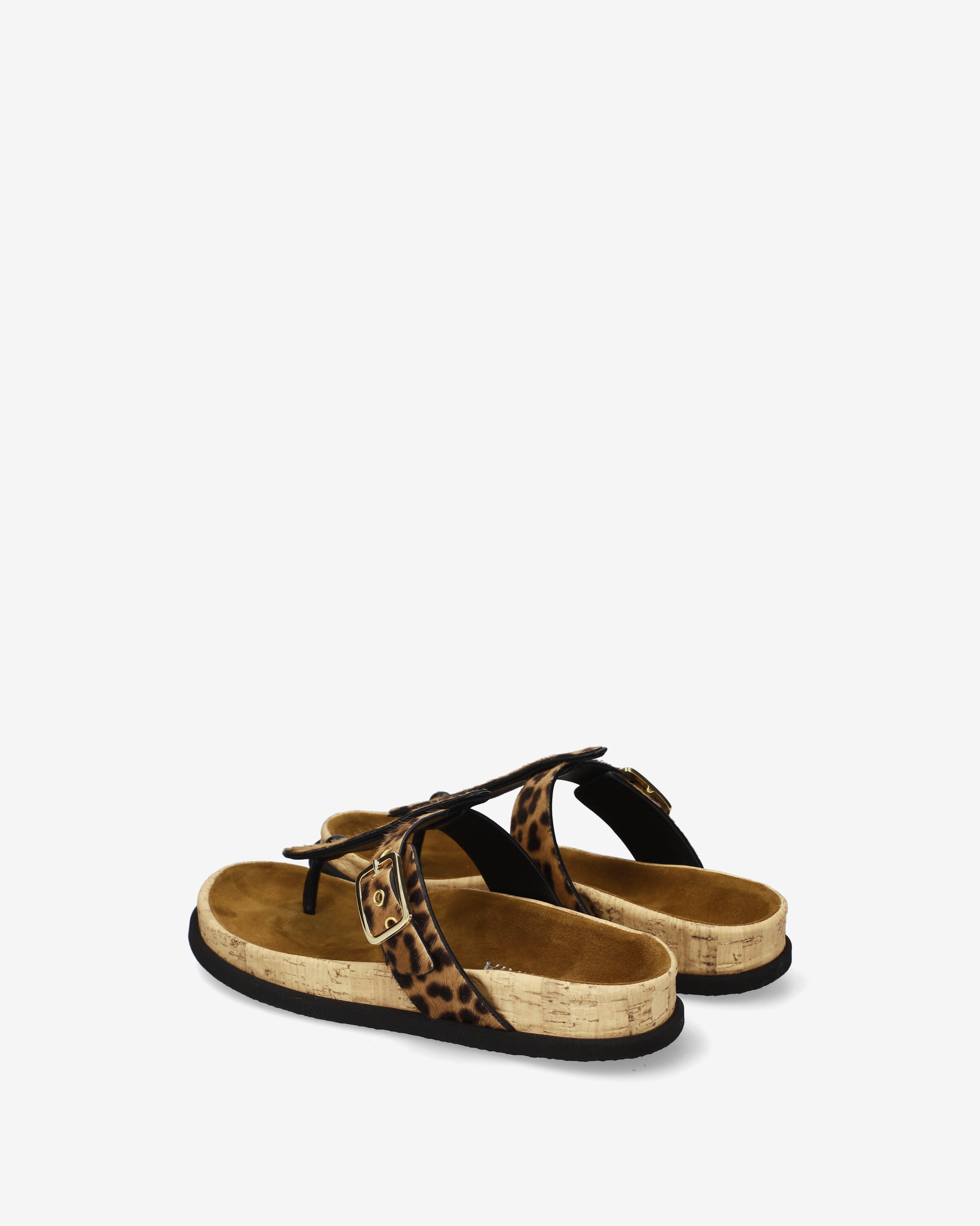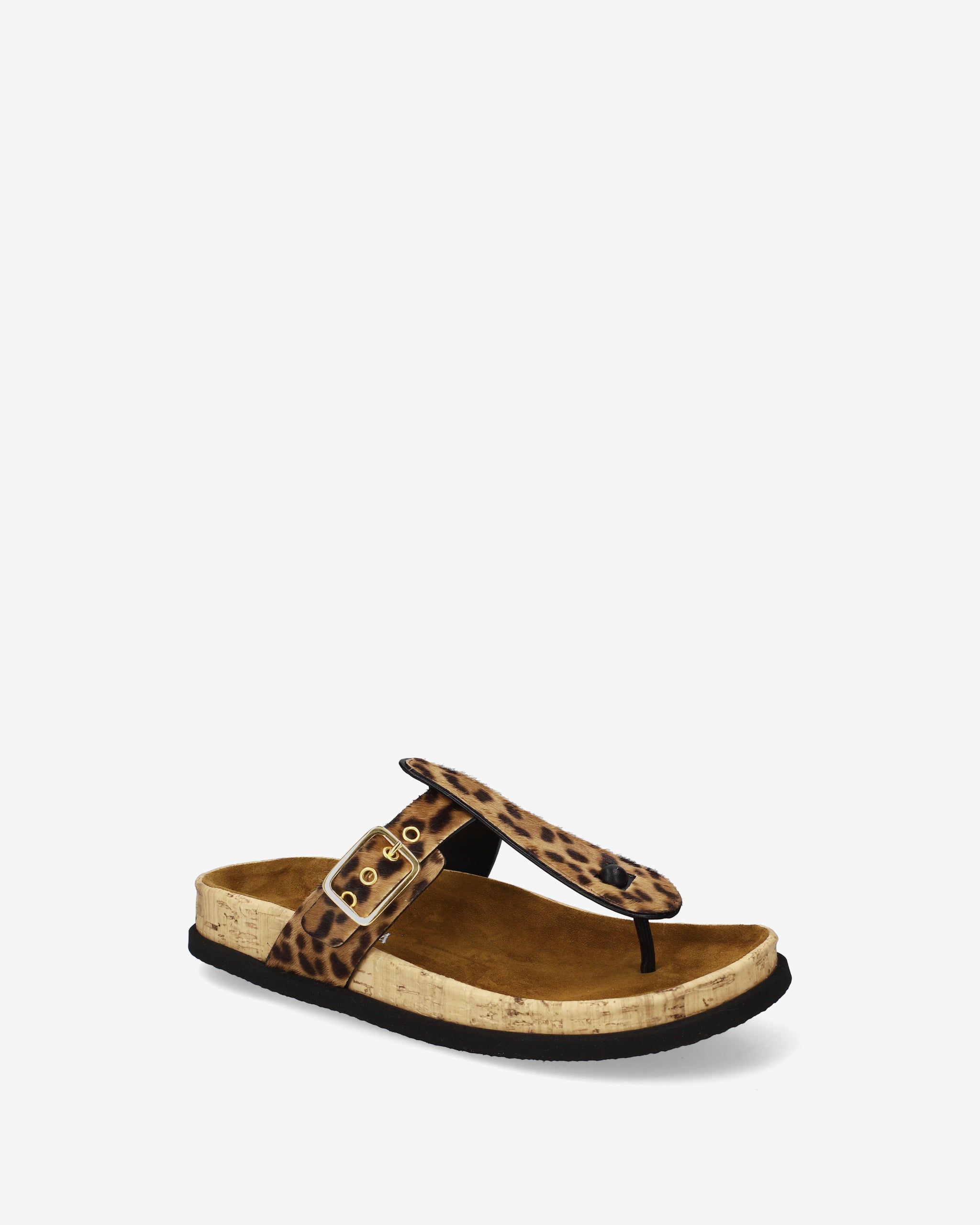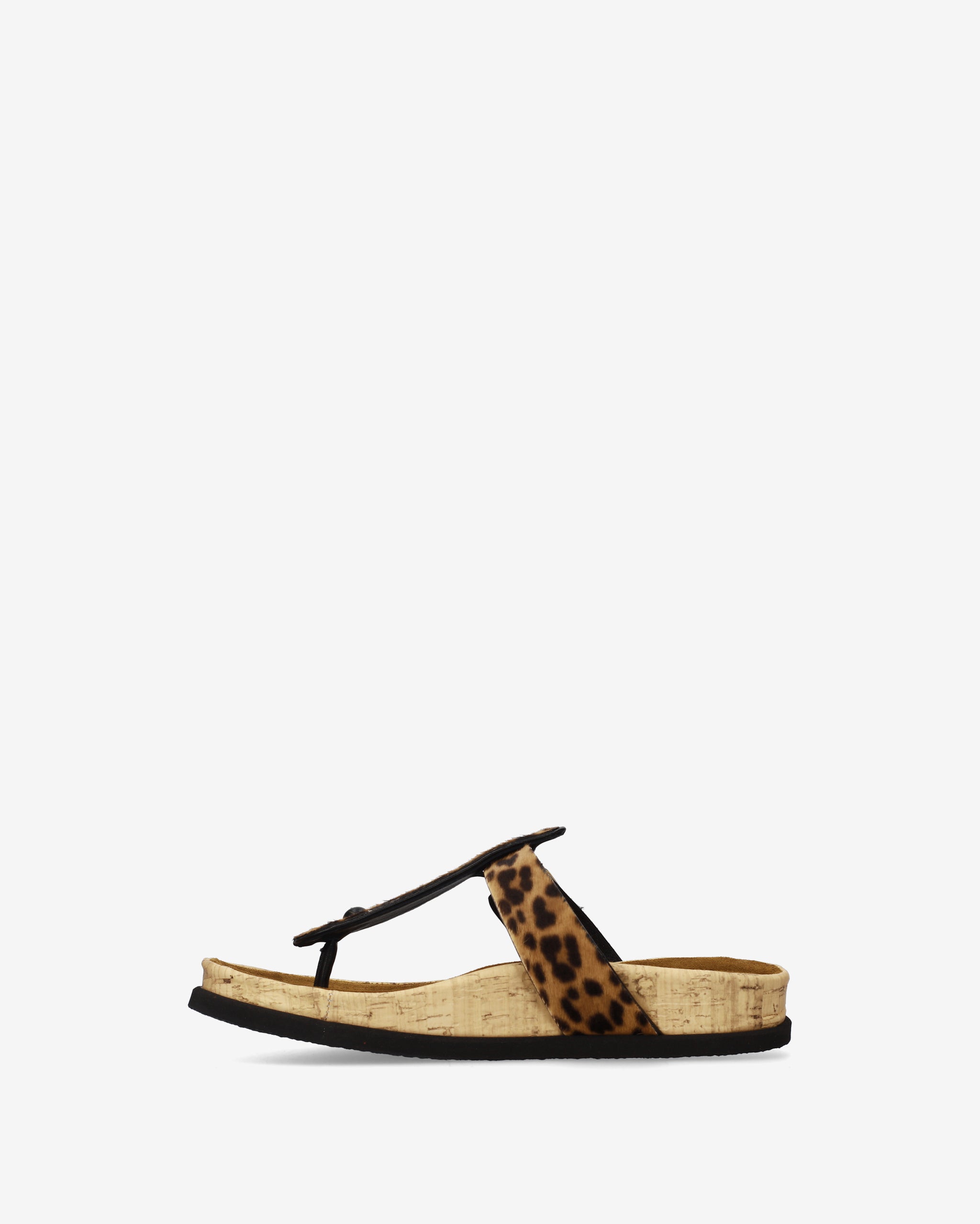 This thong sandal combines minimalist, refined aesthetics with an anatomical design for maximum comfort. The contrast between the animal print, bright red details, and textured cork gives the shoe a distinctive, trendy look.