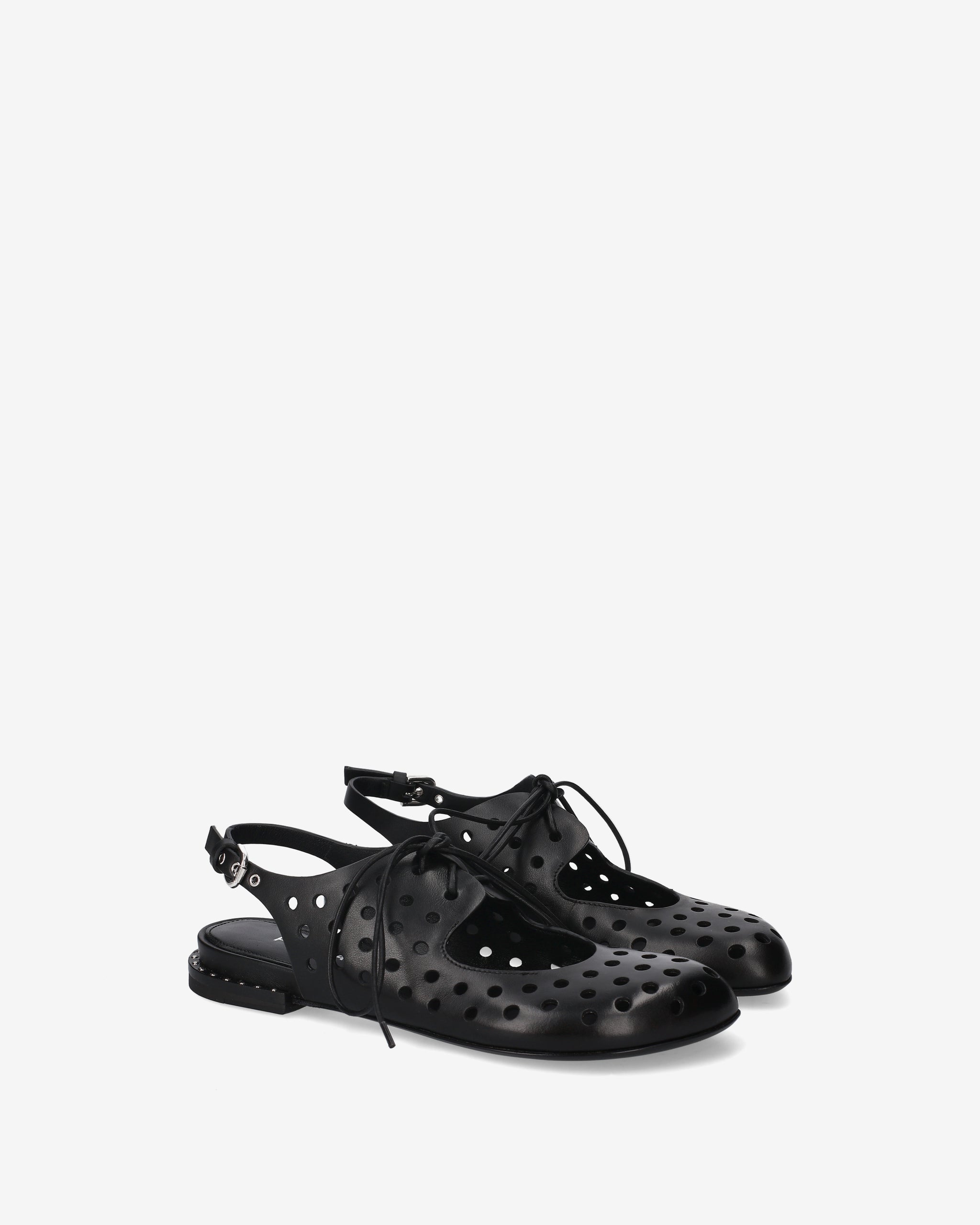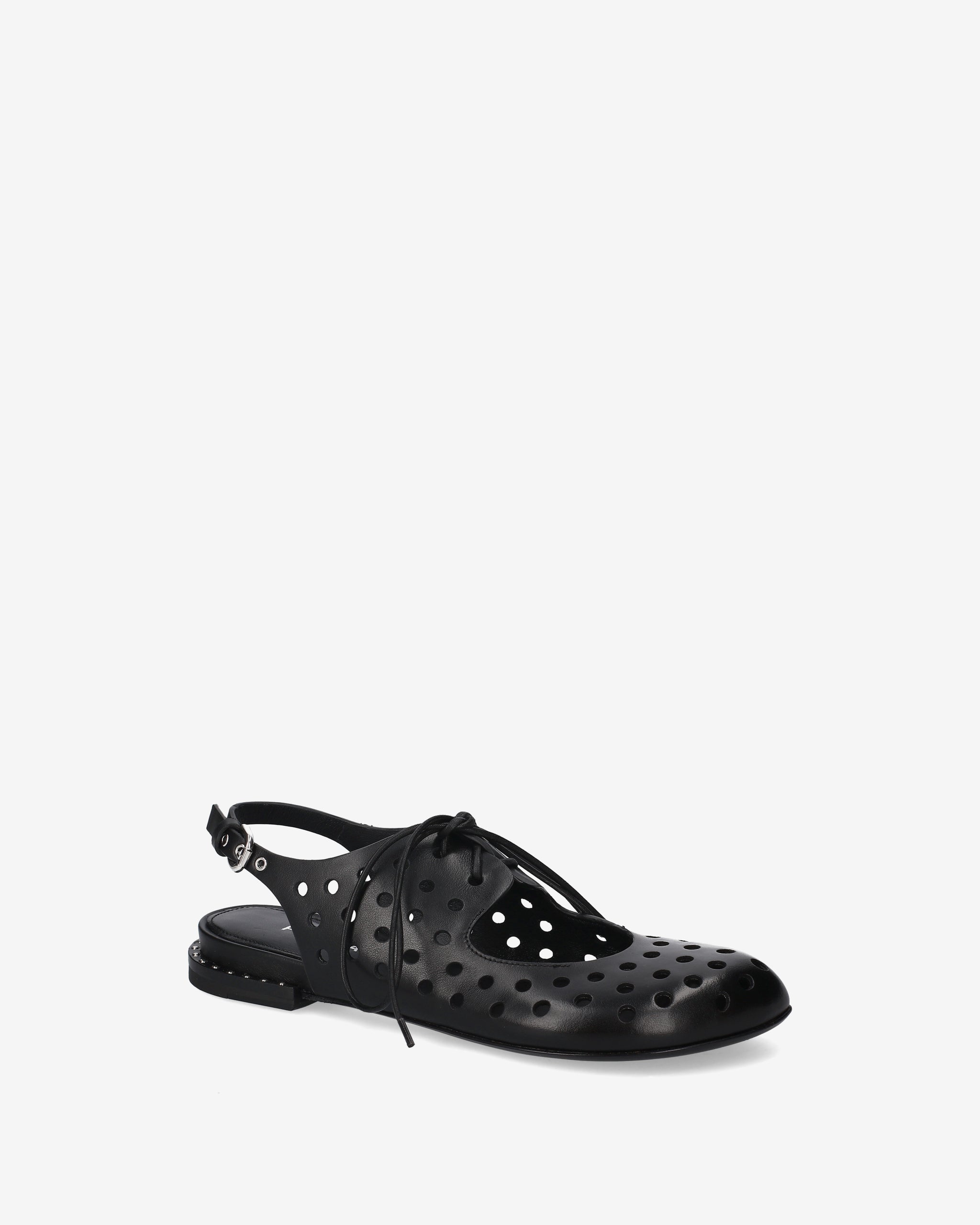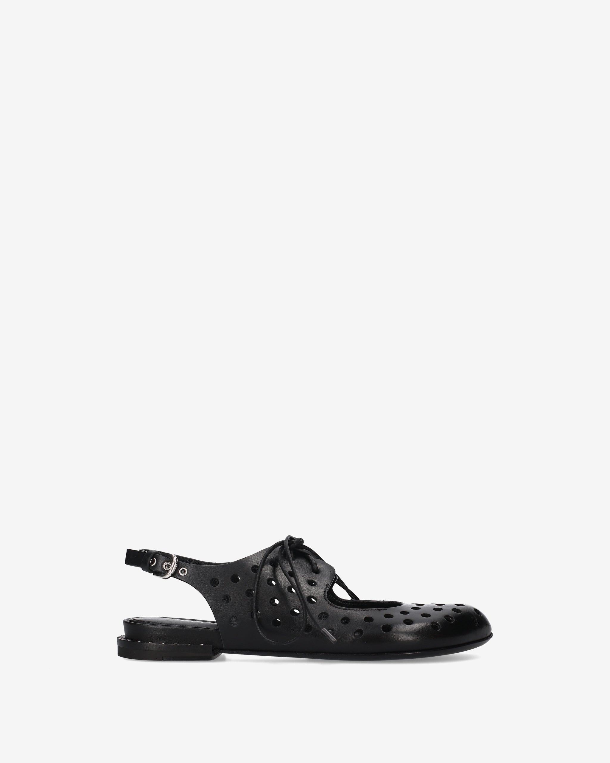 It combines the aesthetics of a lace-up shoe with the freshness of a slingback. Featuring a bold black leather upper with perforated detailing, it is the ideal accessory for those seeking cutting-edge design without compromising on everyday comfort.