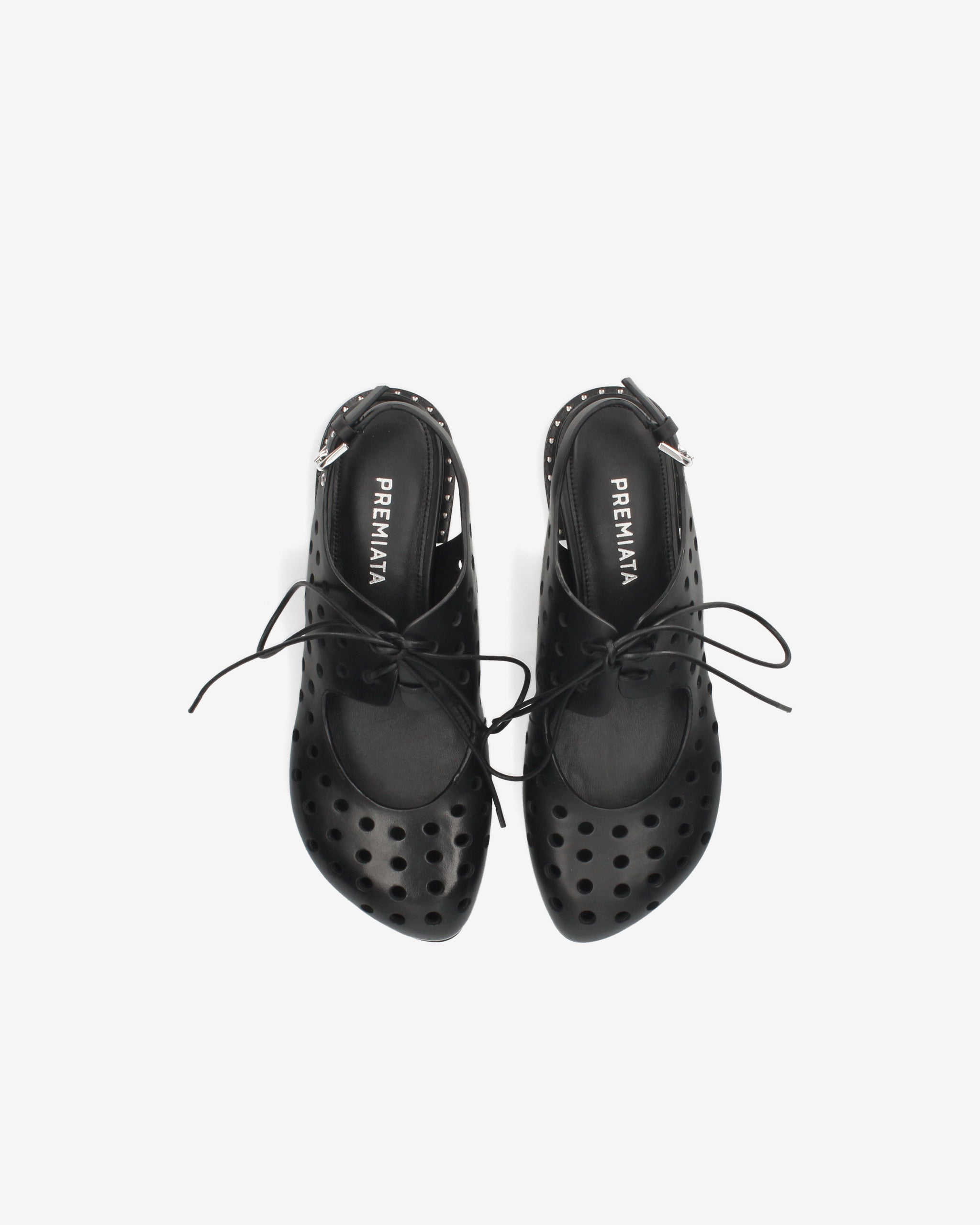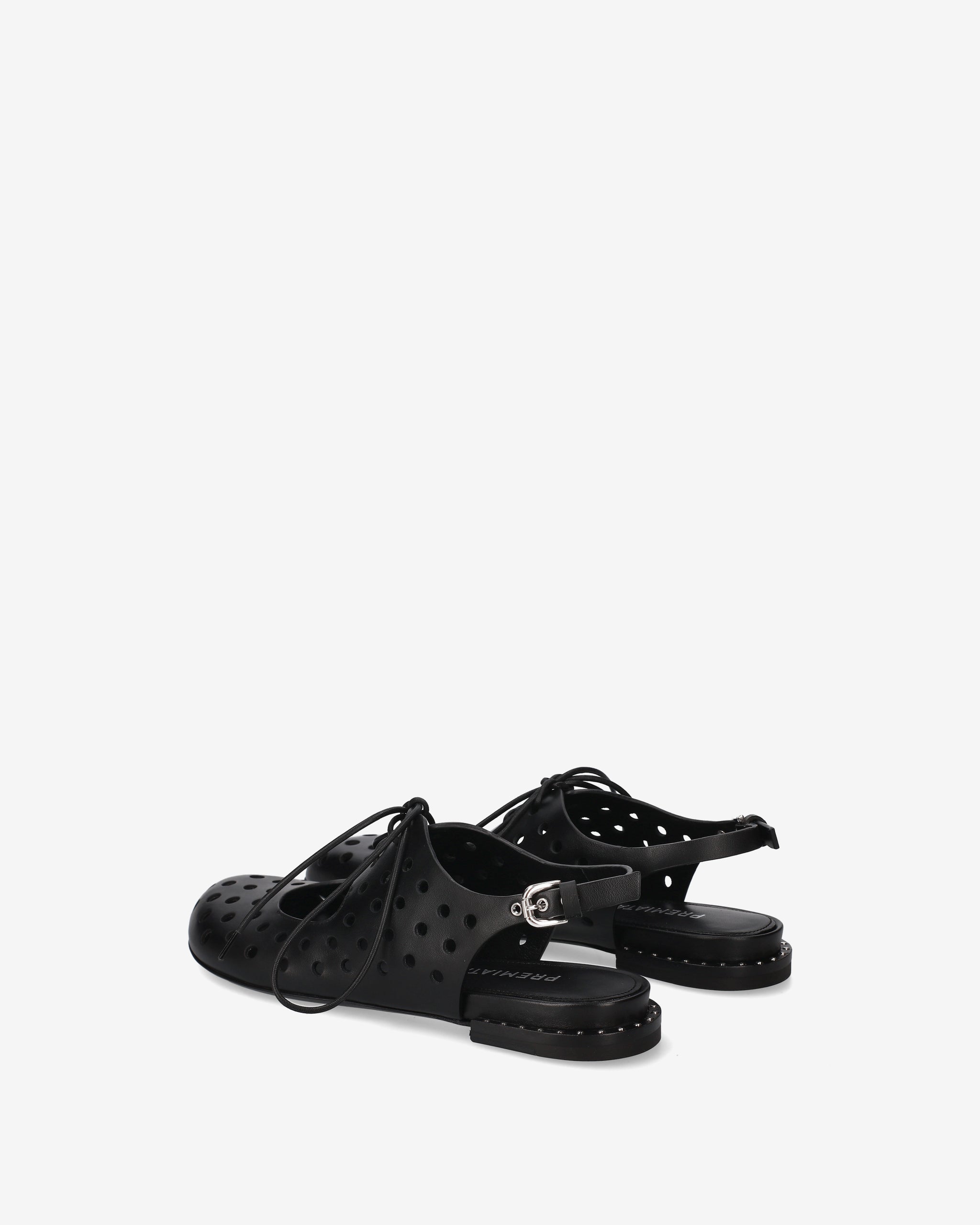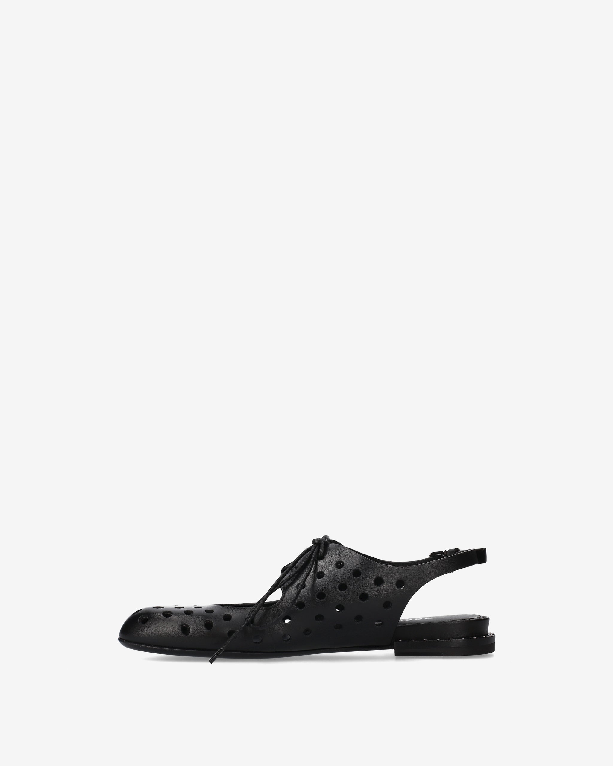 It combines the aesthetics of a lace-up shoe with the freshness of a slingback. Featuring a bold black leather upper with perforated detailing, it is the ideal accessory for those seeking cutting-edge design without compromising on everyday comfort.