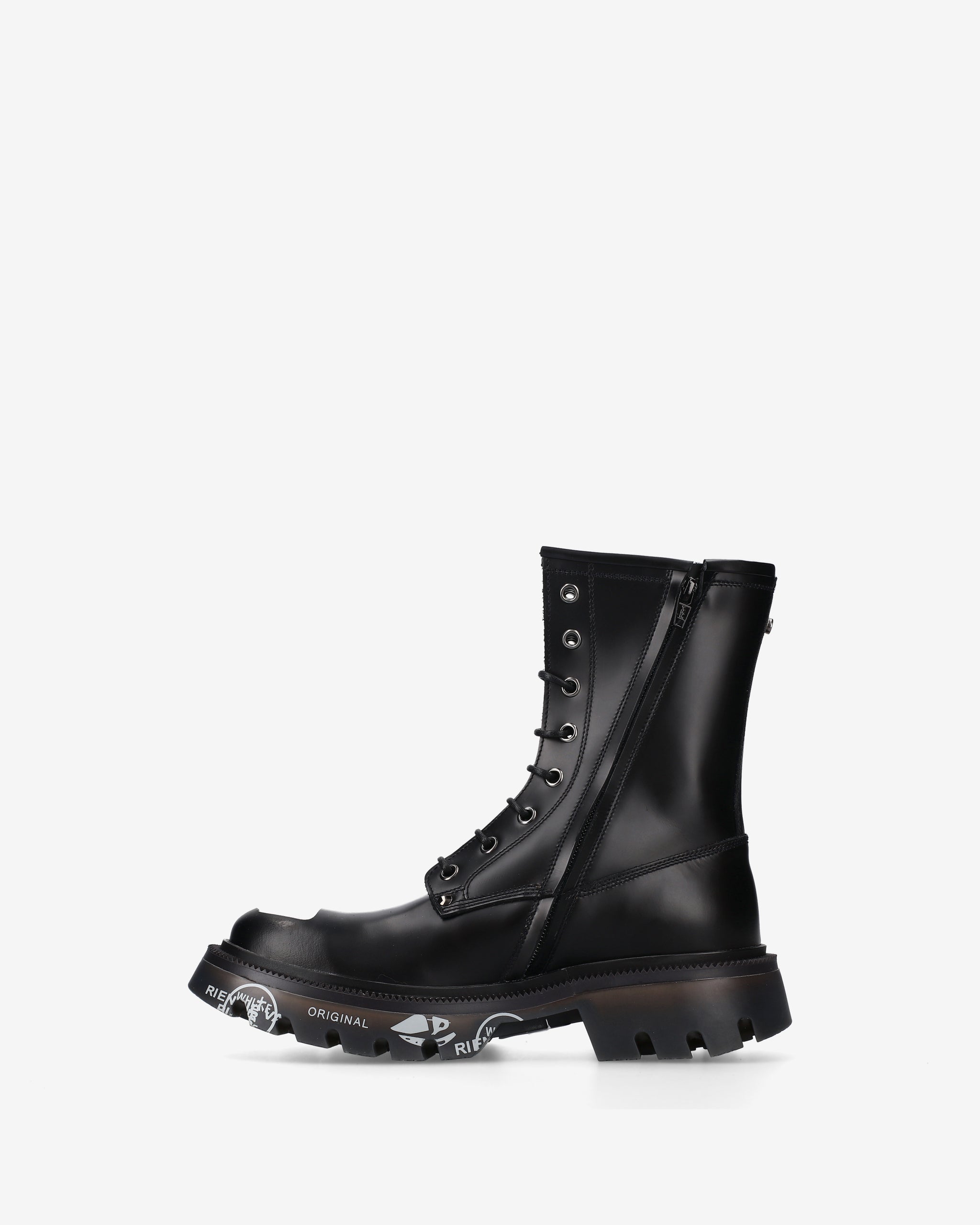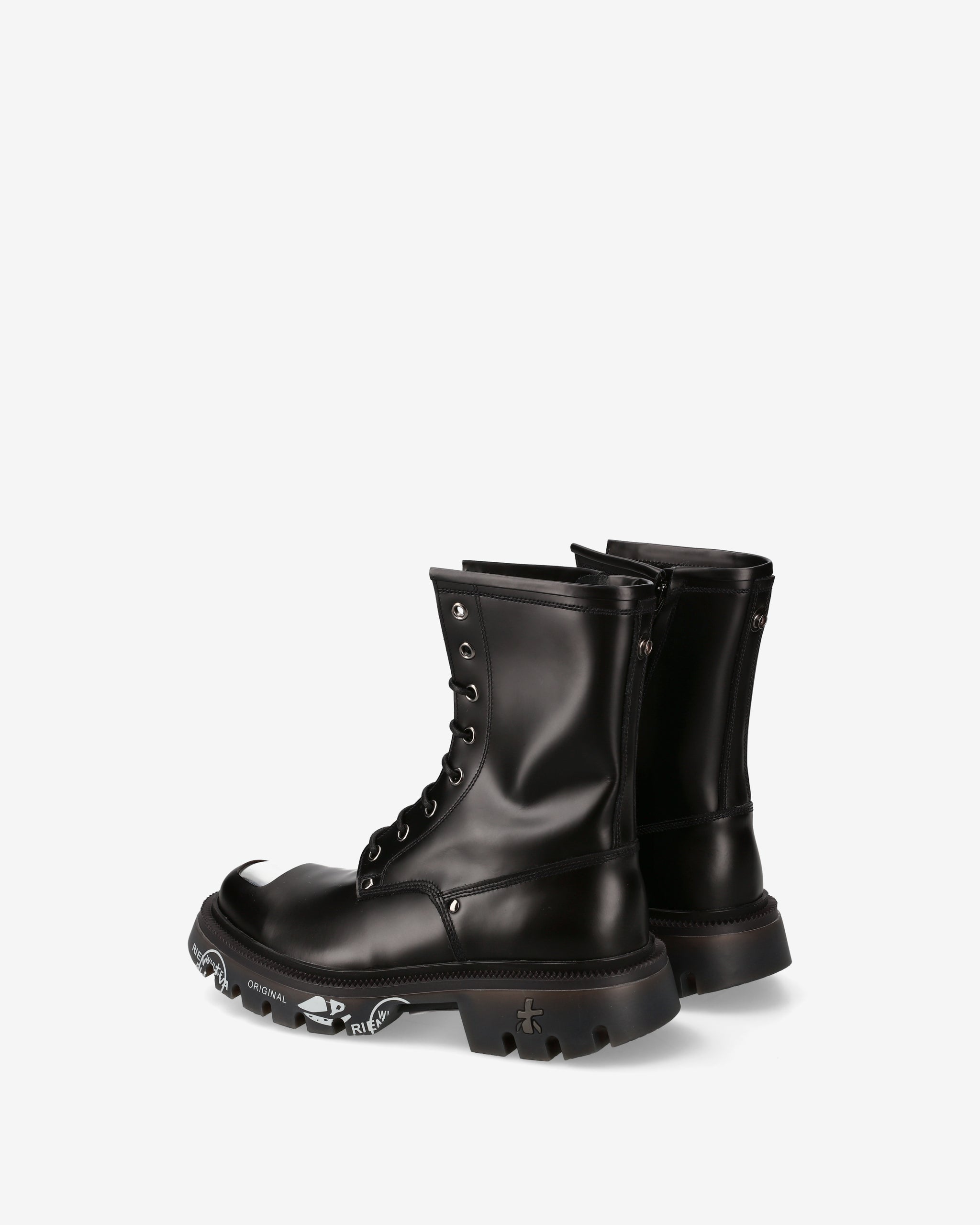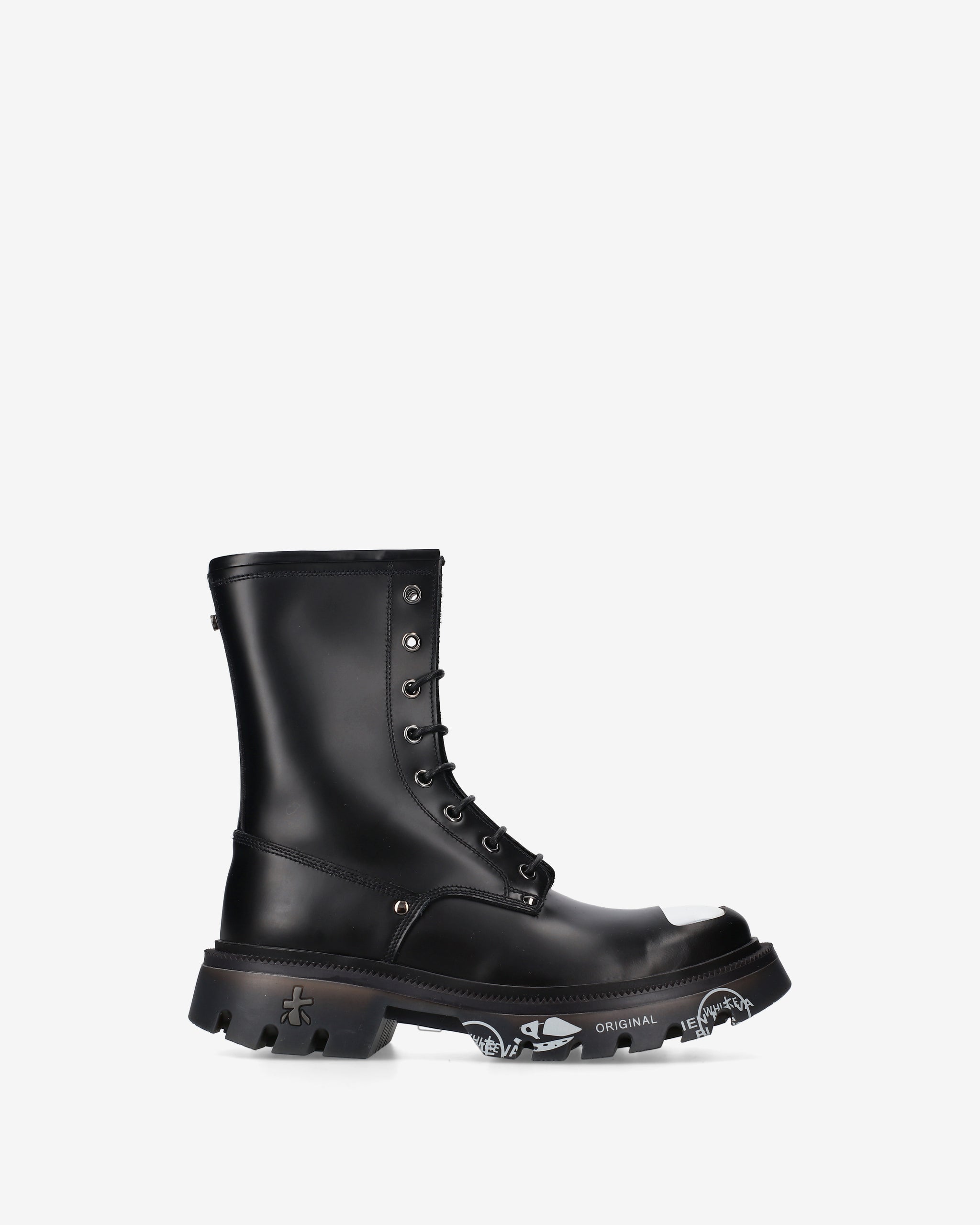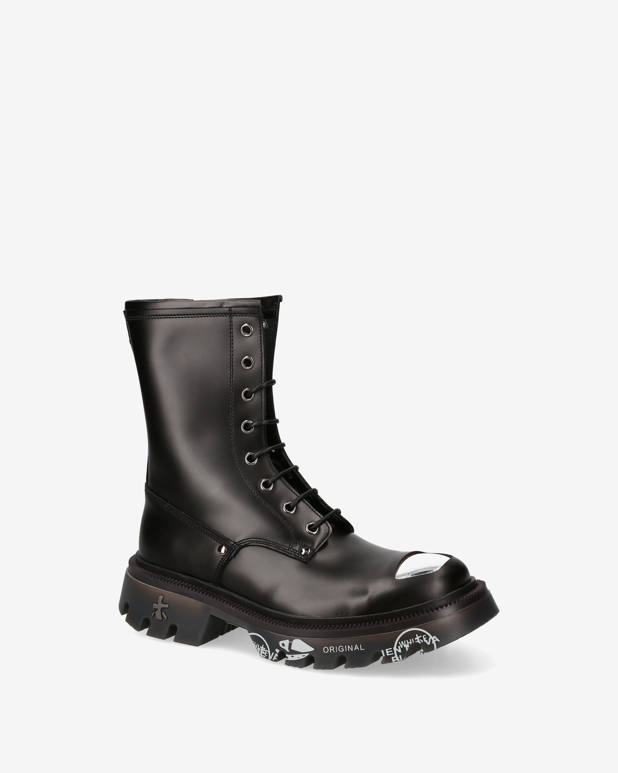 Black brushed calf leather amphibian with chrome nickel toe cap and accessories. A mix of polished elegance and metallic details for a bold look inspired by London's underground aesthetic.