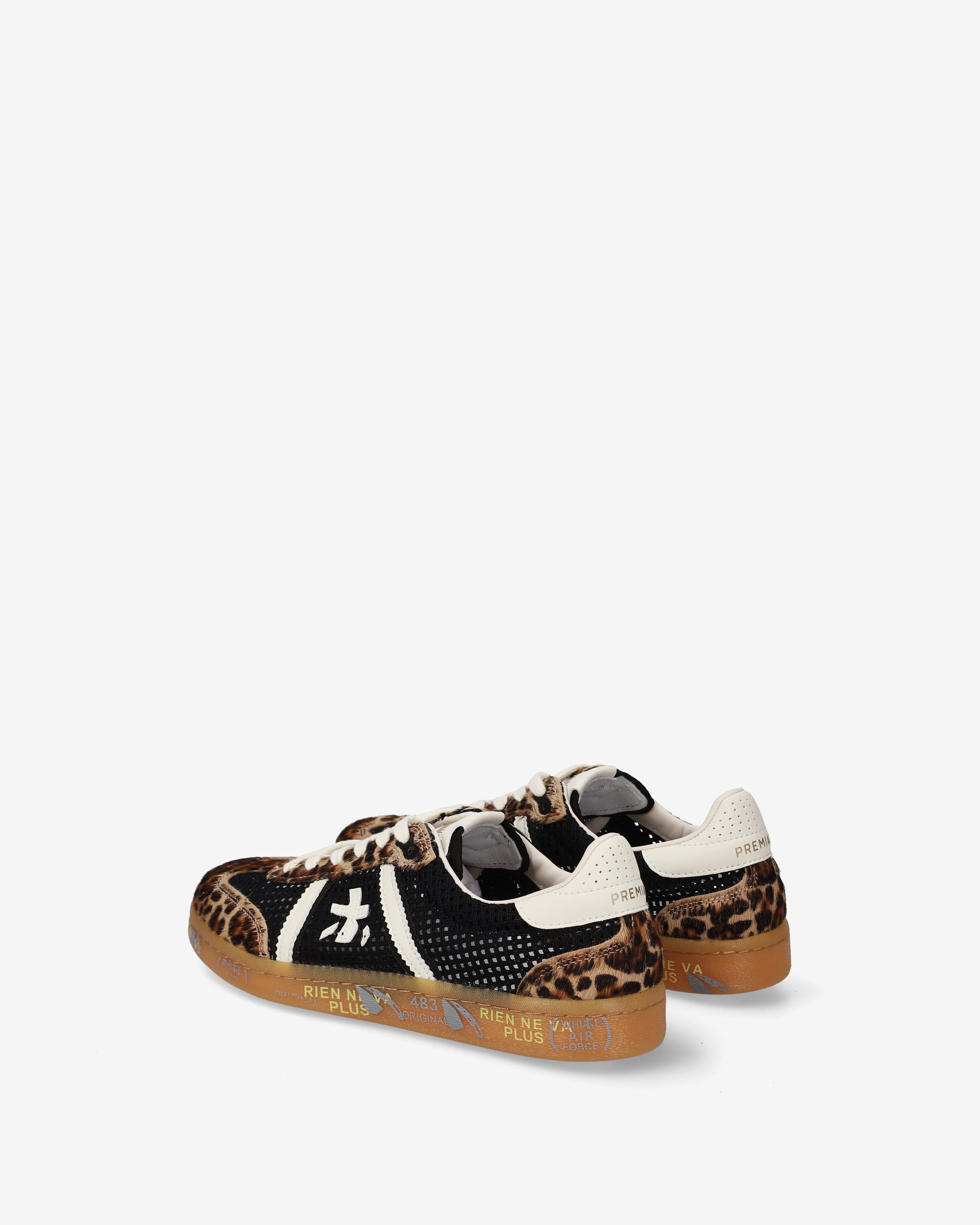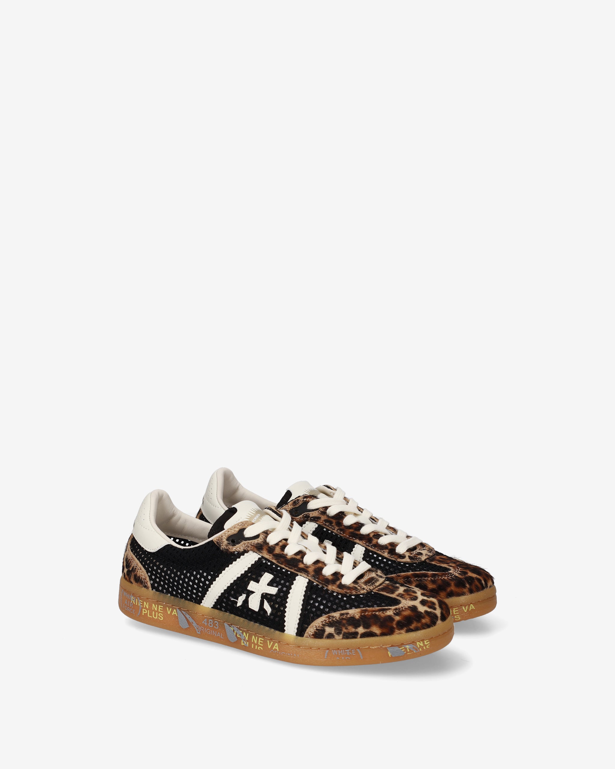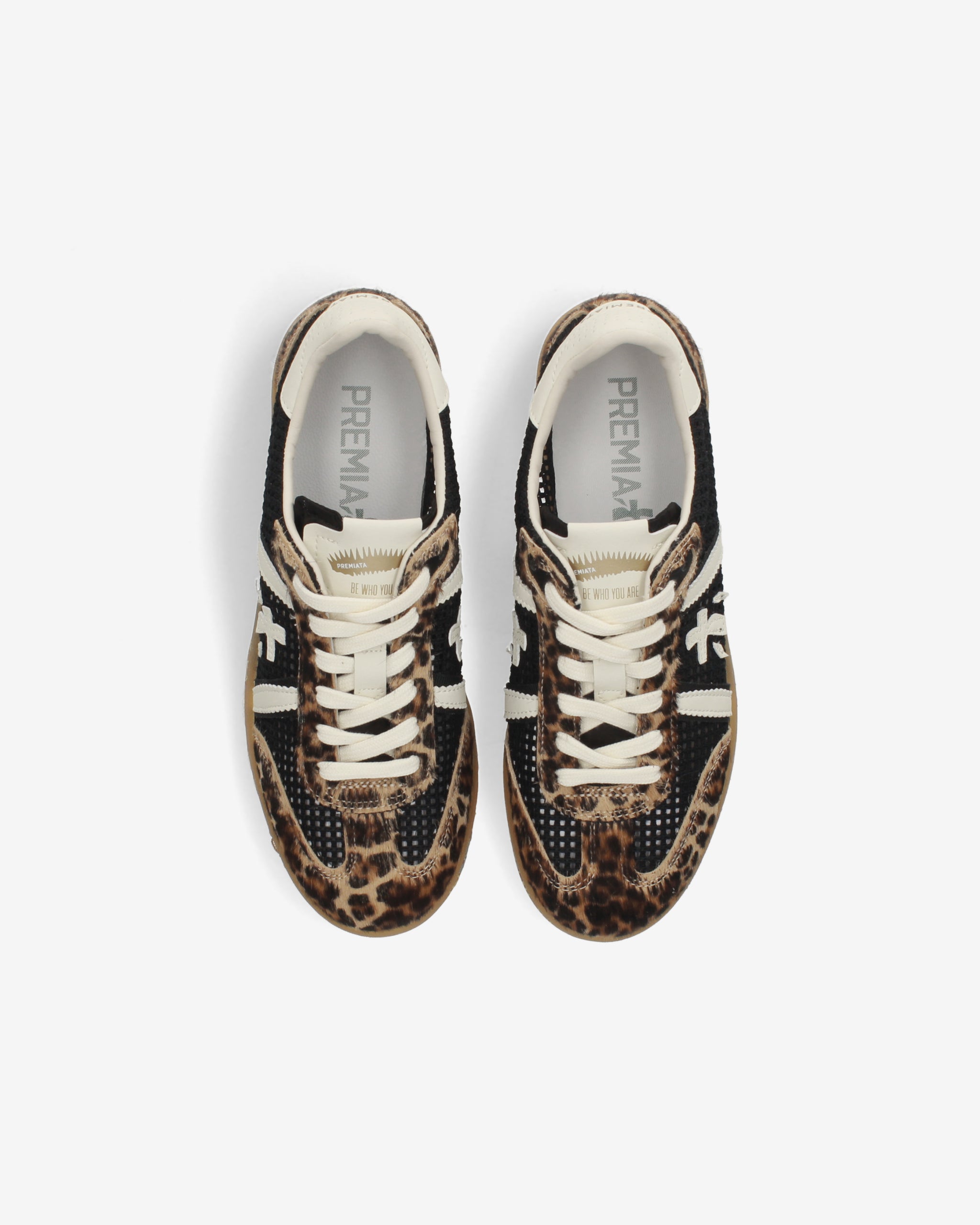 Bonnie con tomaia in traforato nero, dettagli animalier a contrasto e suola gum. Un mix di colori classici per un’estetica pulita e sofisticata.