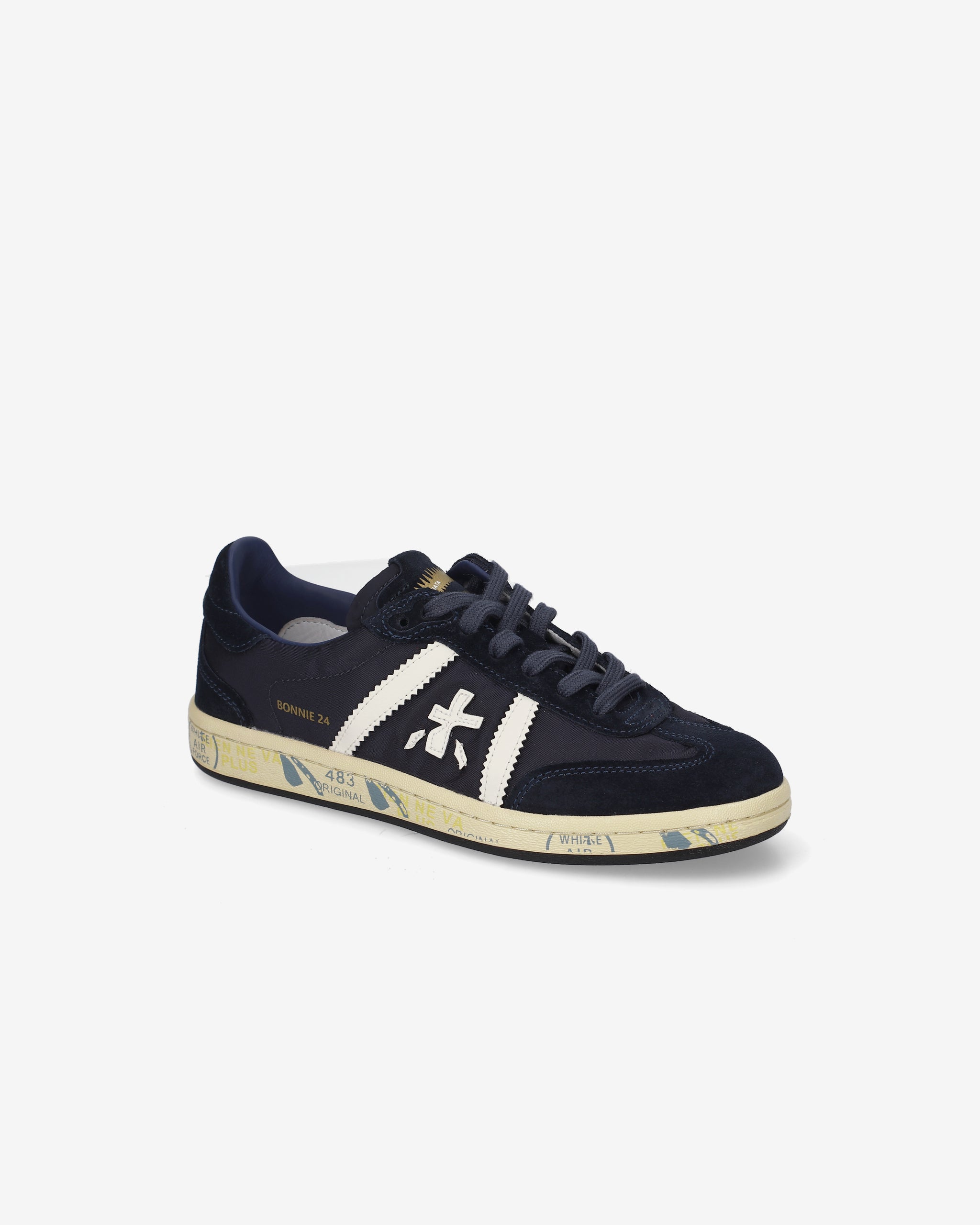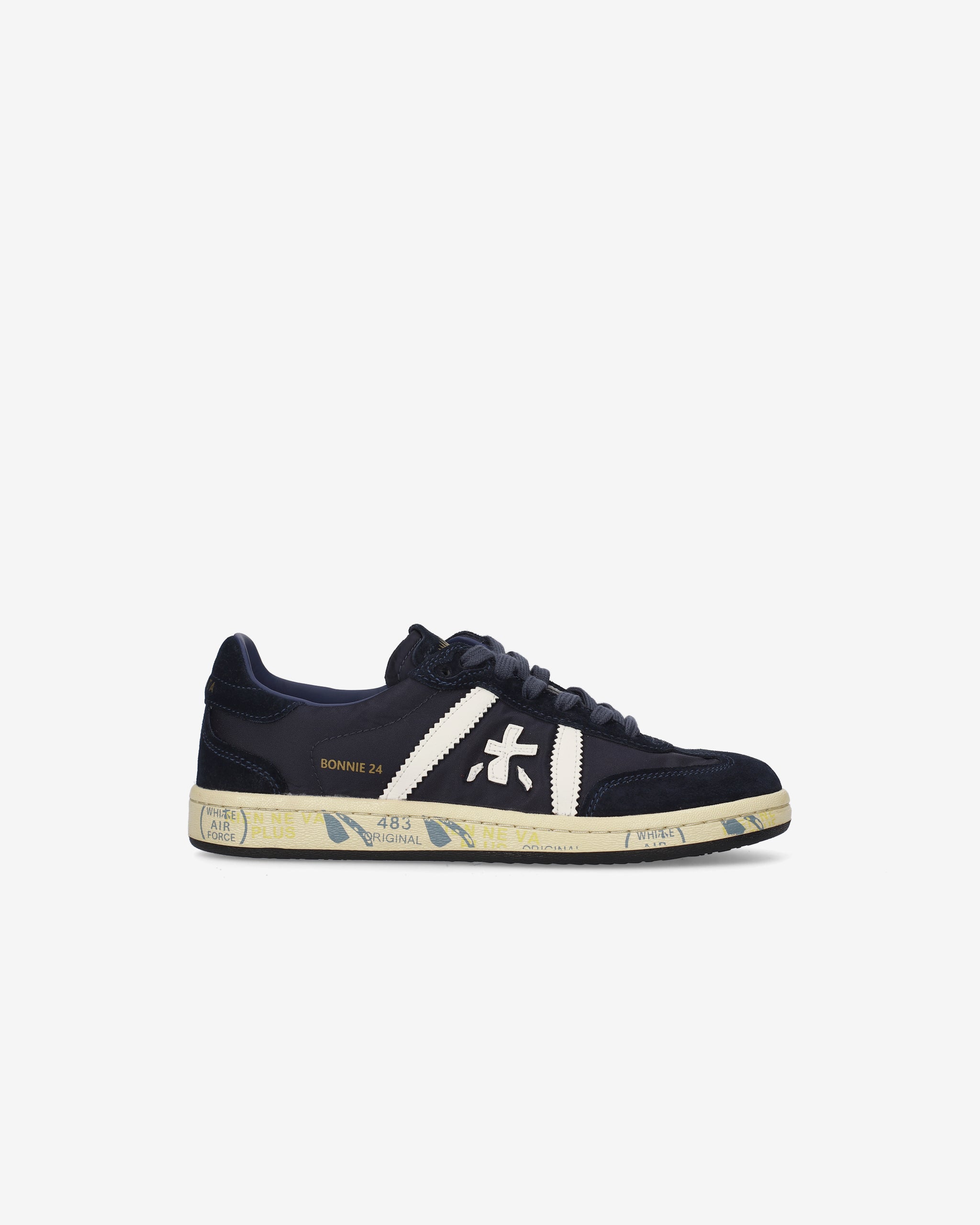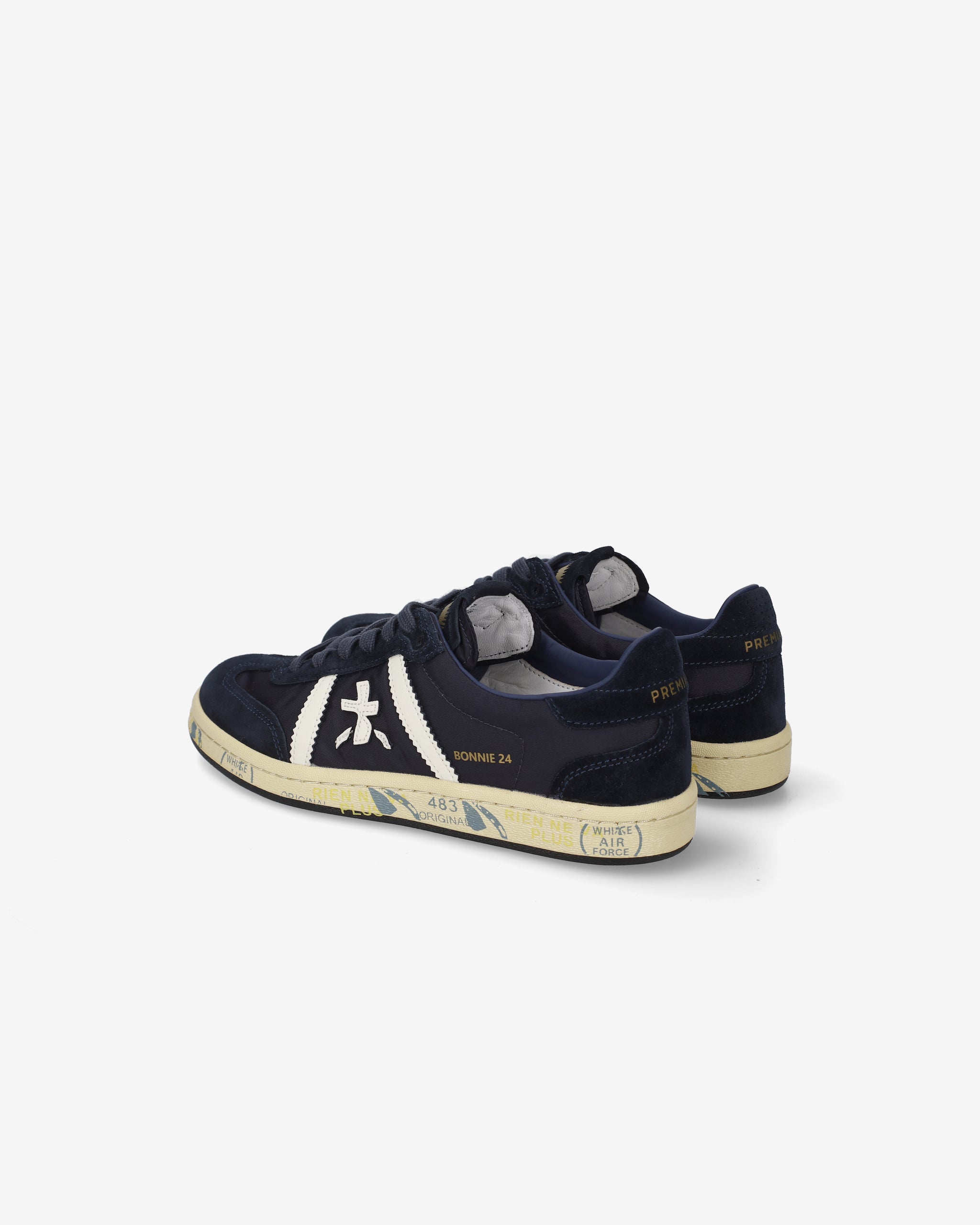 Questa sneaker dal look sportivo e contemporaneo presenta una tomaia blu scuro con dettagli bianchi e scritta "BONNIE 24" sul lato. La suola, decorata con i distintivi timbri di Premiata in tonalità vivaci, aggiunge un tocco originale e dinamico.