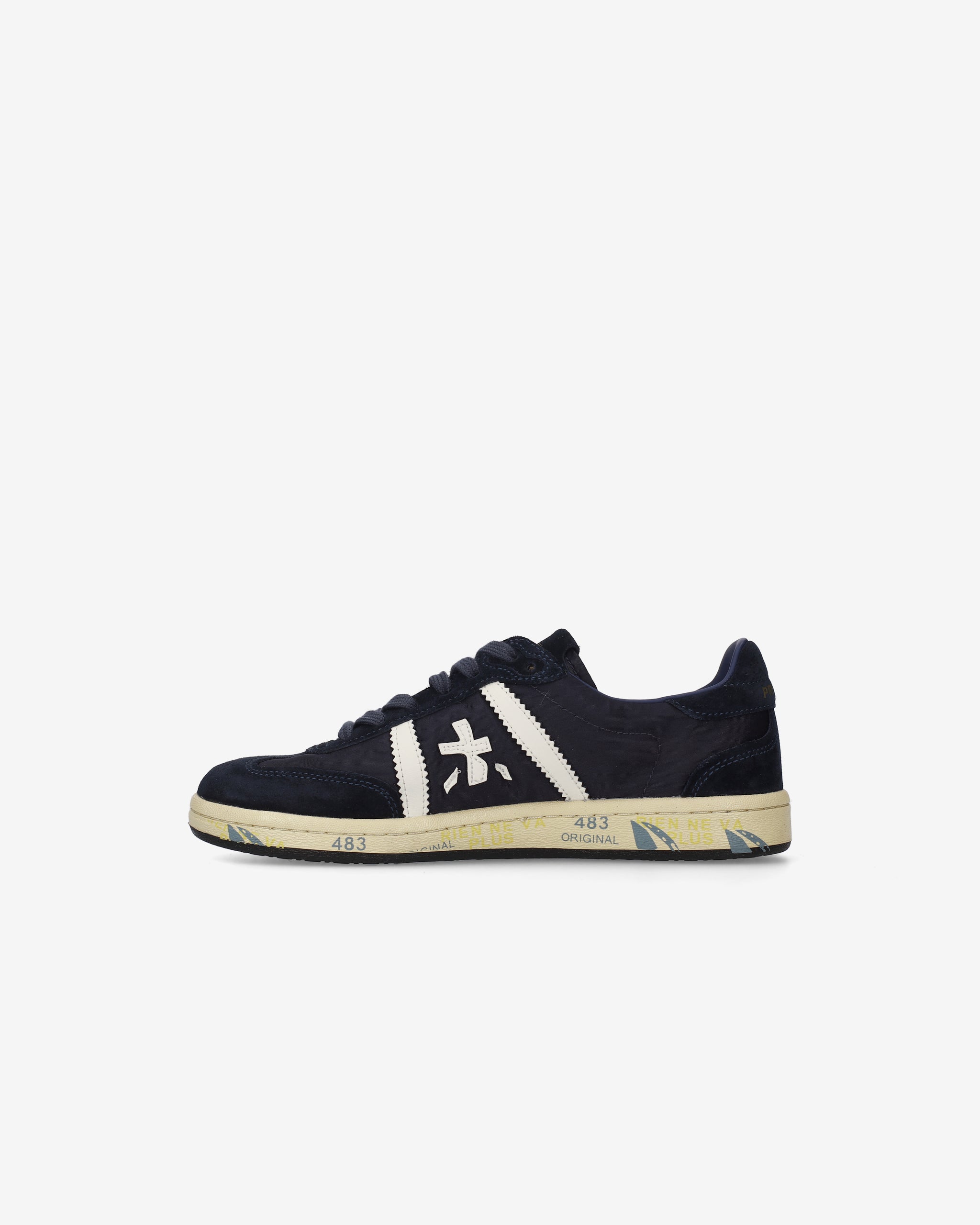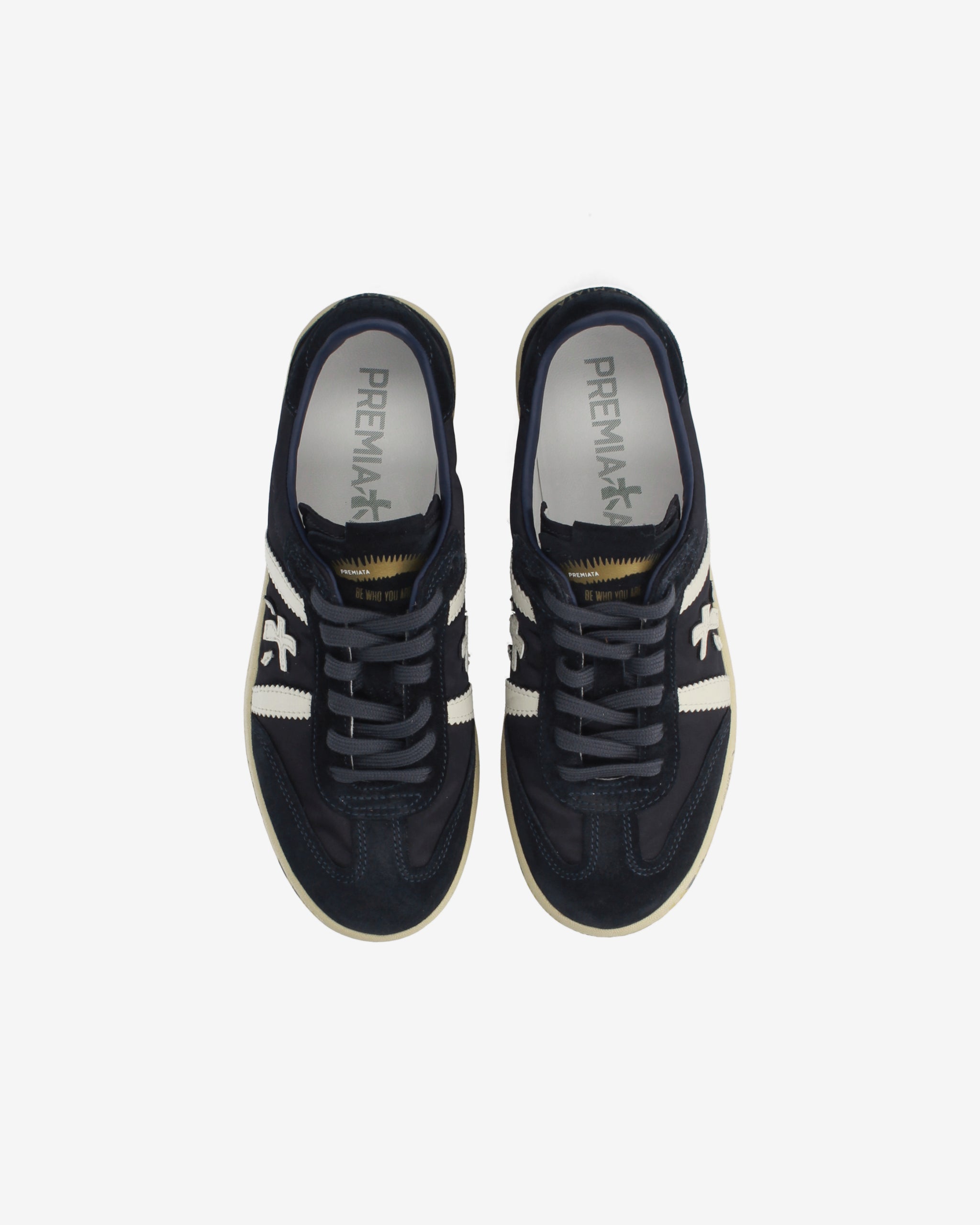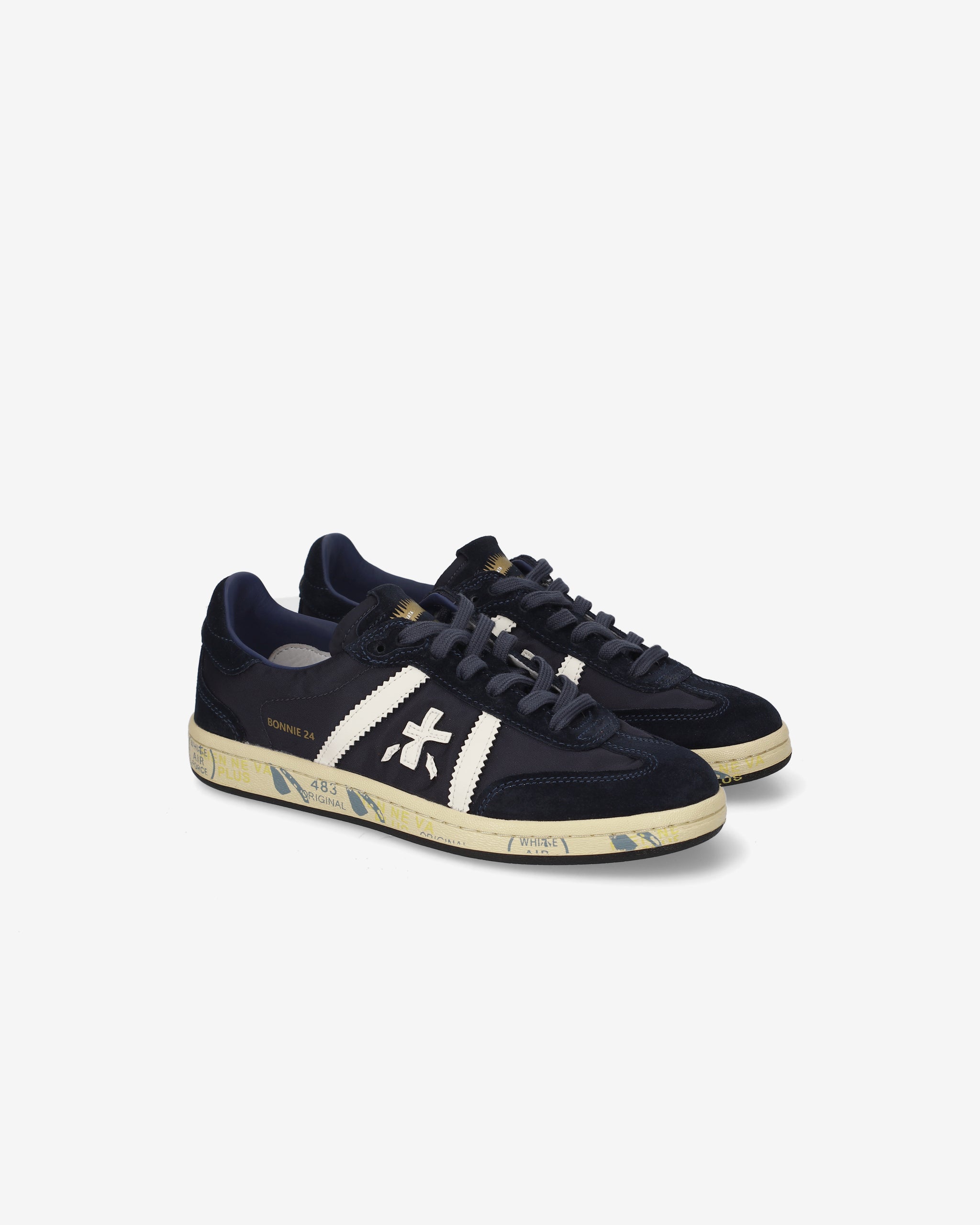 Questa sneaker dal look sportivo e contemporaneo presenta una tomaia blu scuro con dettagli bianchi e scritta "BONNIE 24" sul lato. La suola, decorata con i distintivi timbri di Premiata in tonalità vivaci, aggiunge un tocco originale e dinamico.