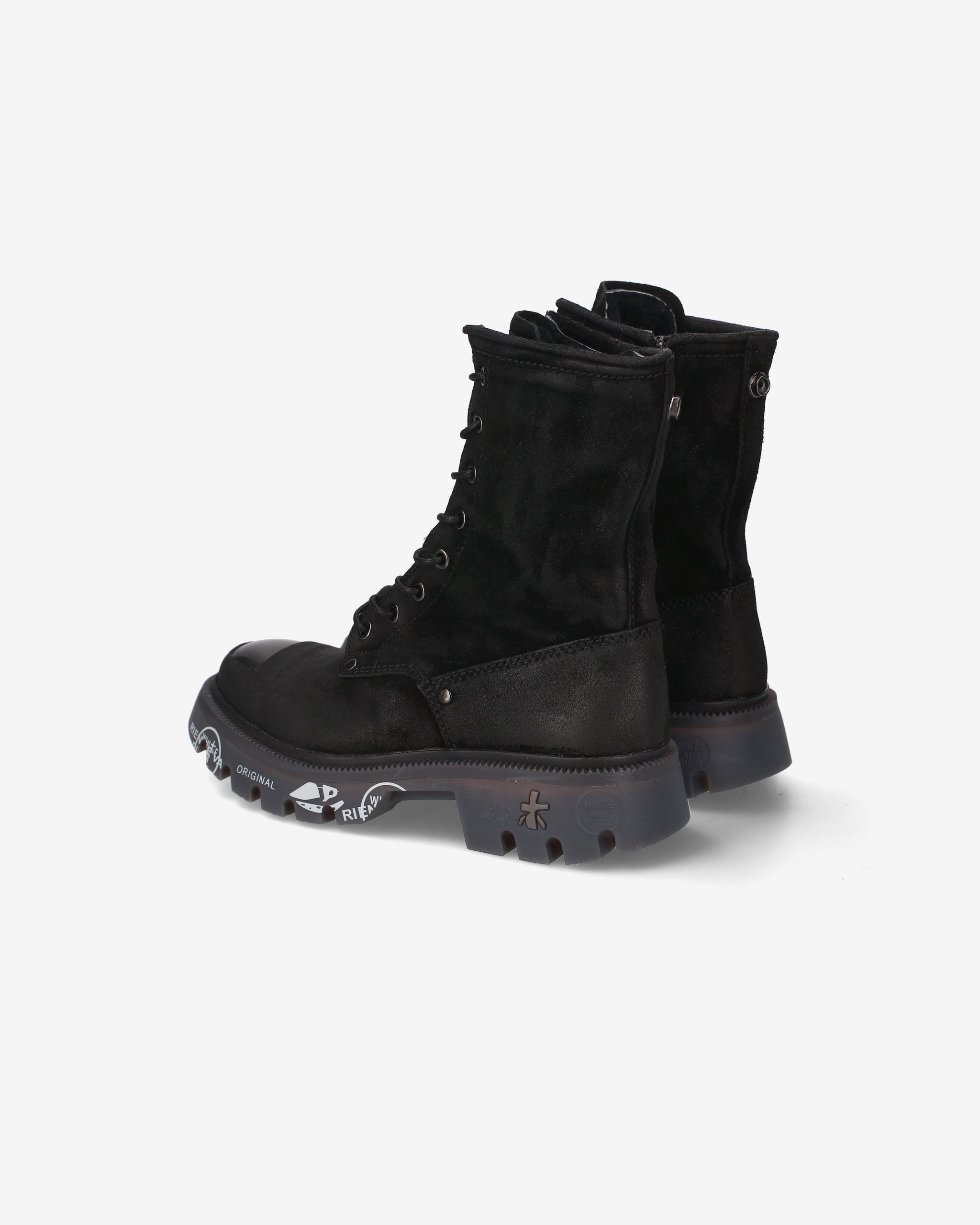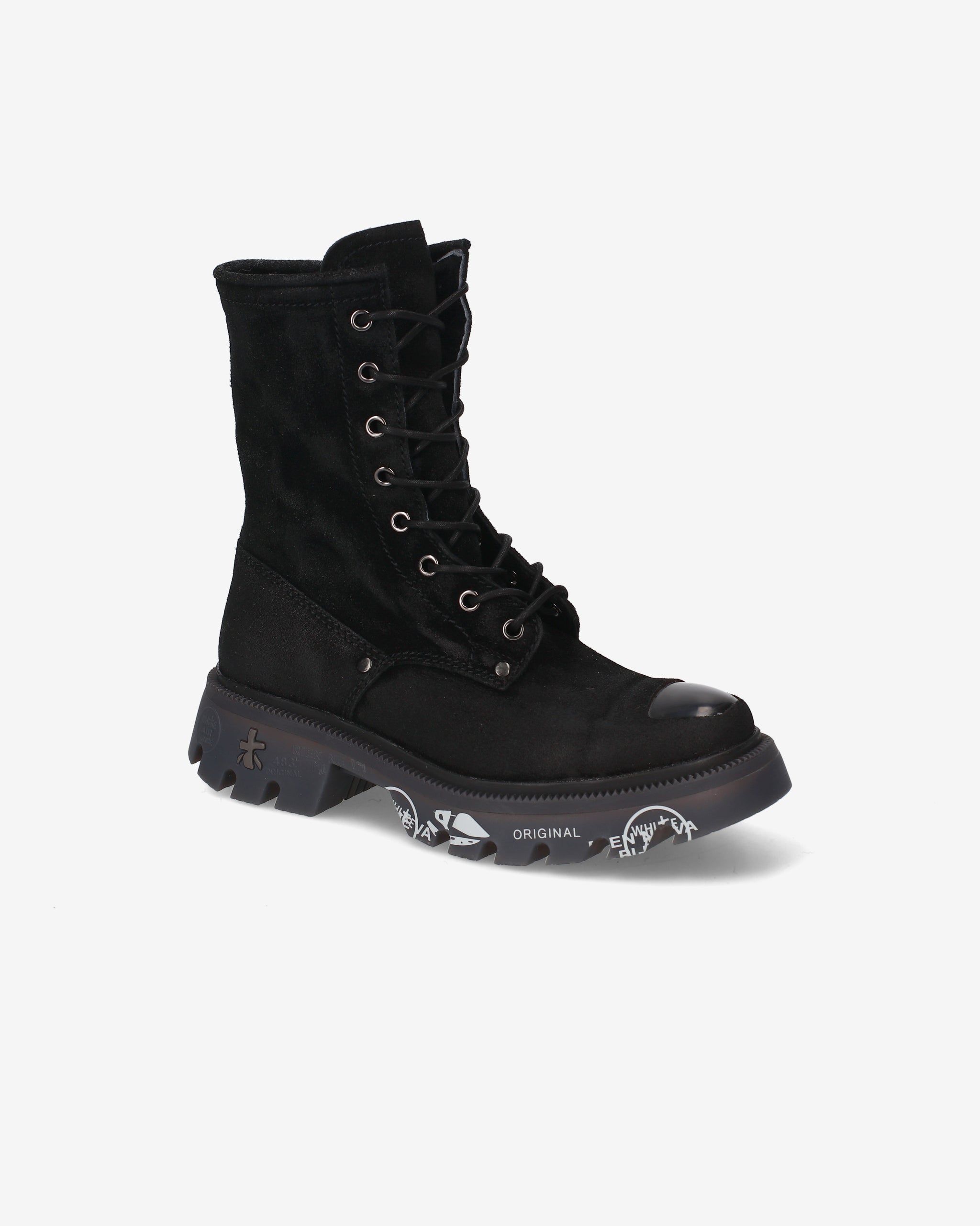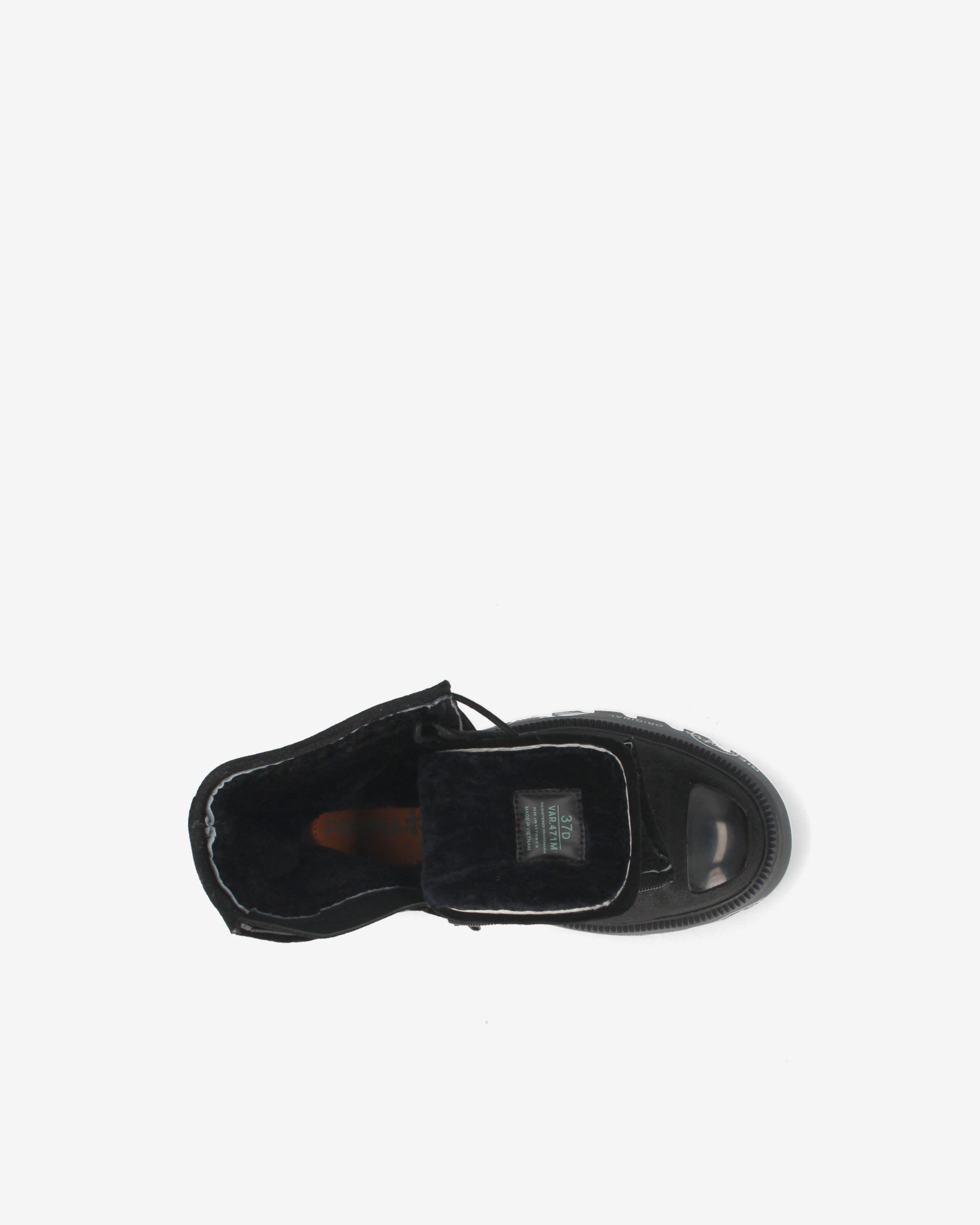 Anfibio in vitello nero foderato in montone, tutto in tono, dal look essenziale e raffinato ispirato all’estetica underground londinese. Perfetto per uno stile urbano e deciso.