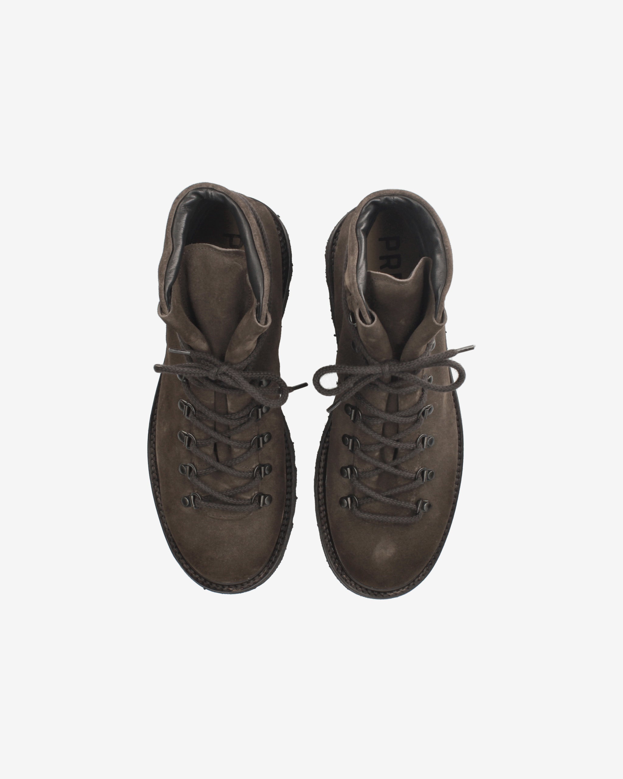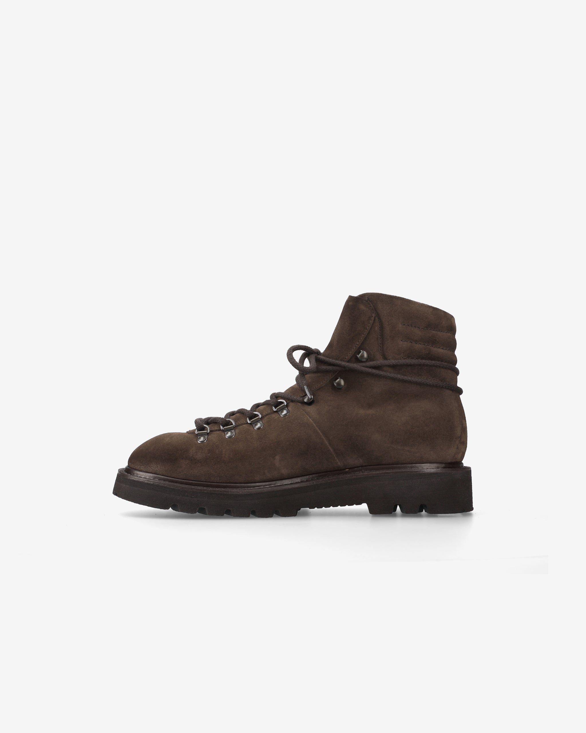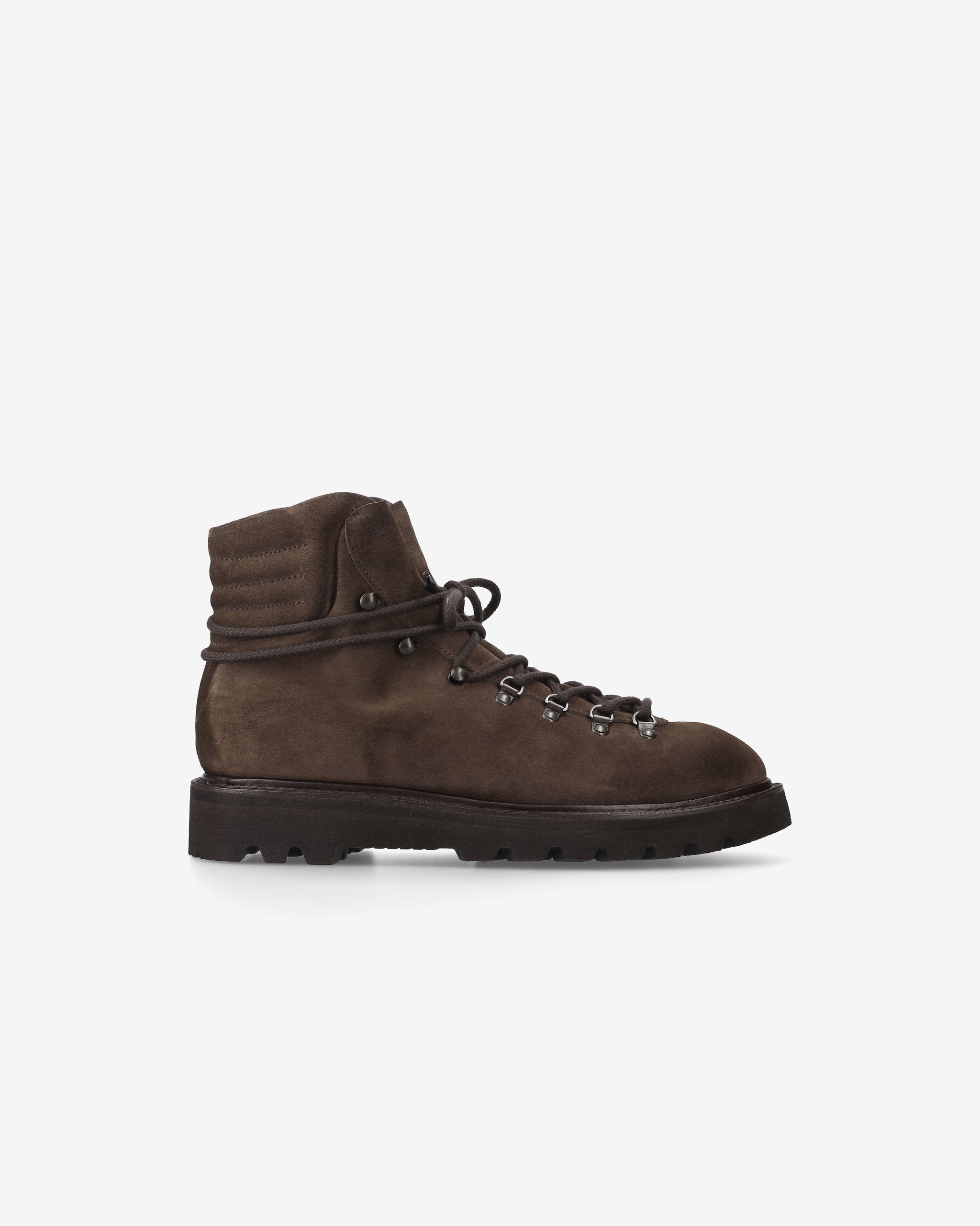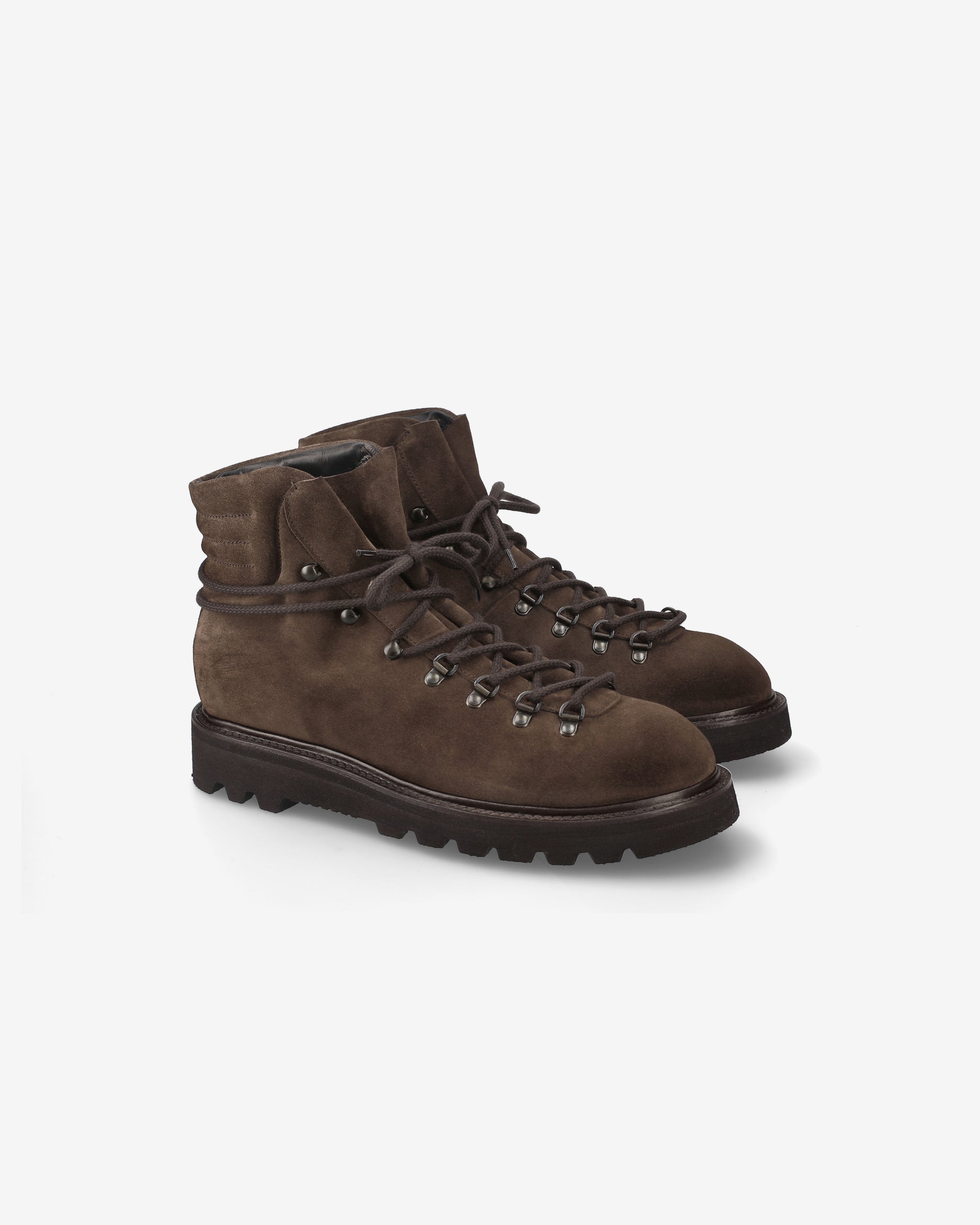 Un'interpretazione raffinata delle pedule da montagna, realizzate in pelle scamosciata testa di moro per uno stile sofisticato e autentico. Il fusbet in Evalux assicura massimo comfort, mentre i lacci in cotone cerato e il sottopiede in cuoio testimoniano l'attenzione ai dettagli artigianali. La lavorazione Goodyear garantisce robustezza e durata nel tempo. Il tacco da 40mm e il gambale da 140mm completano una silhouette solida e funzionale.