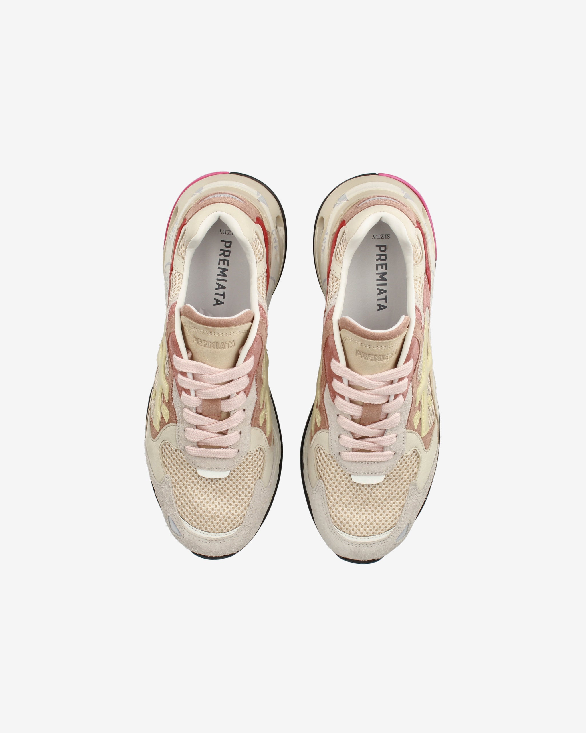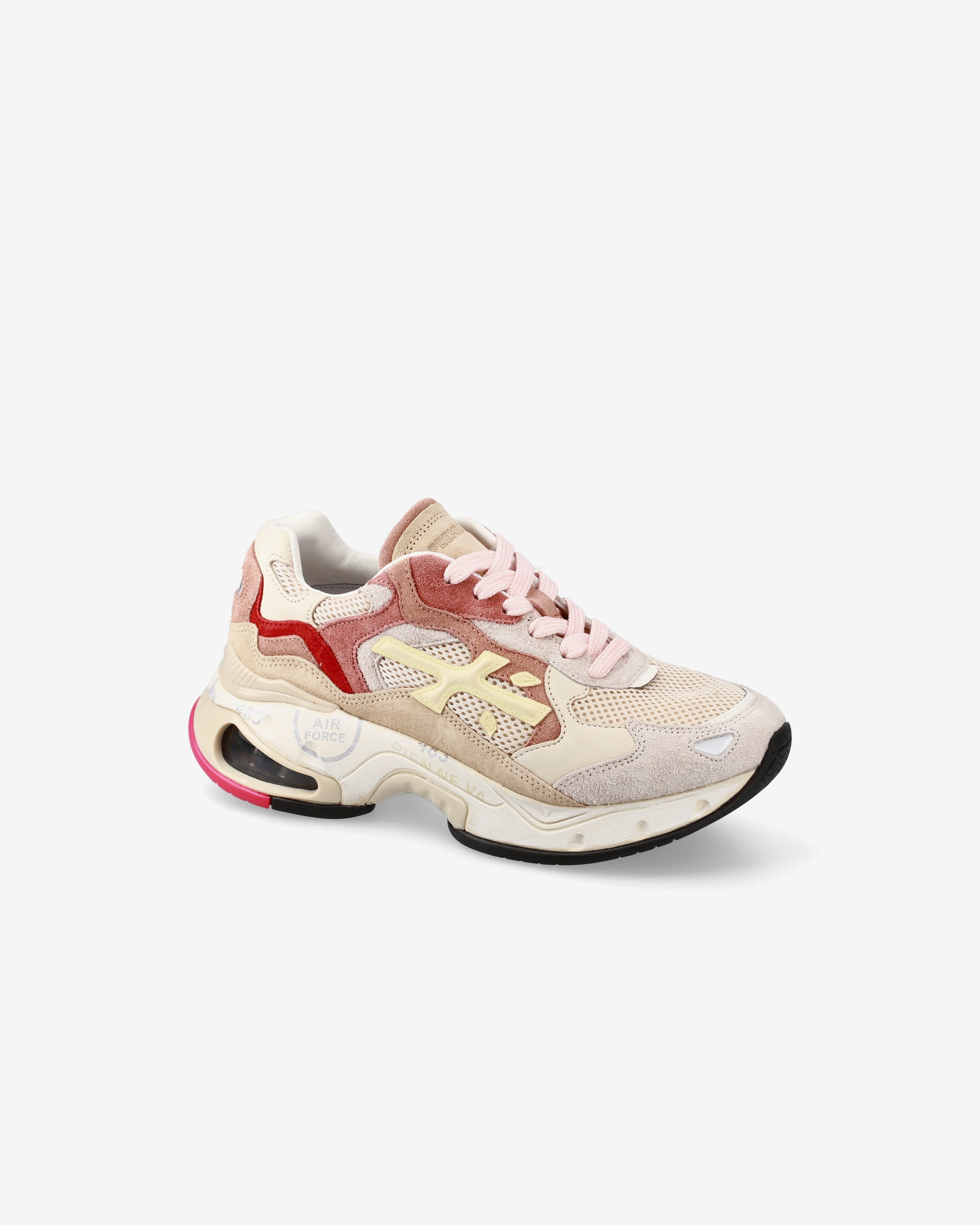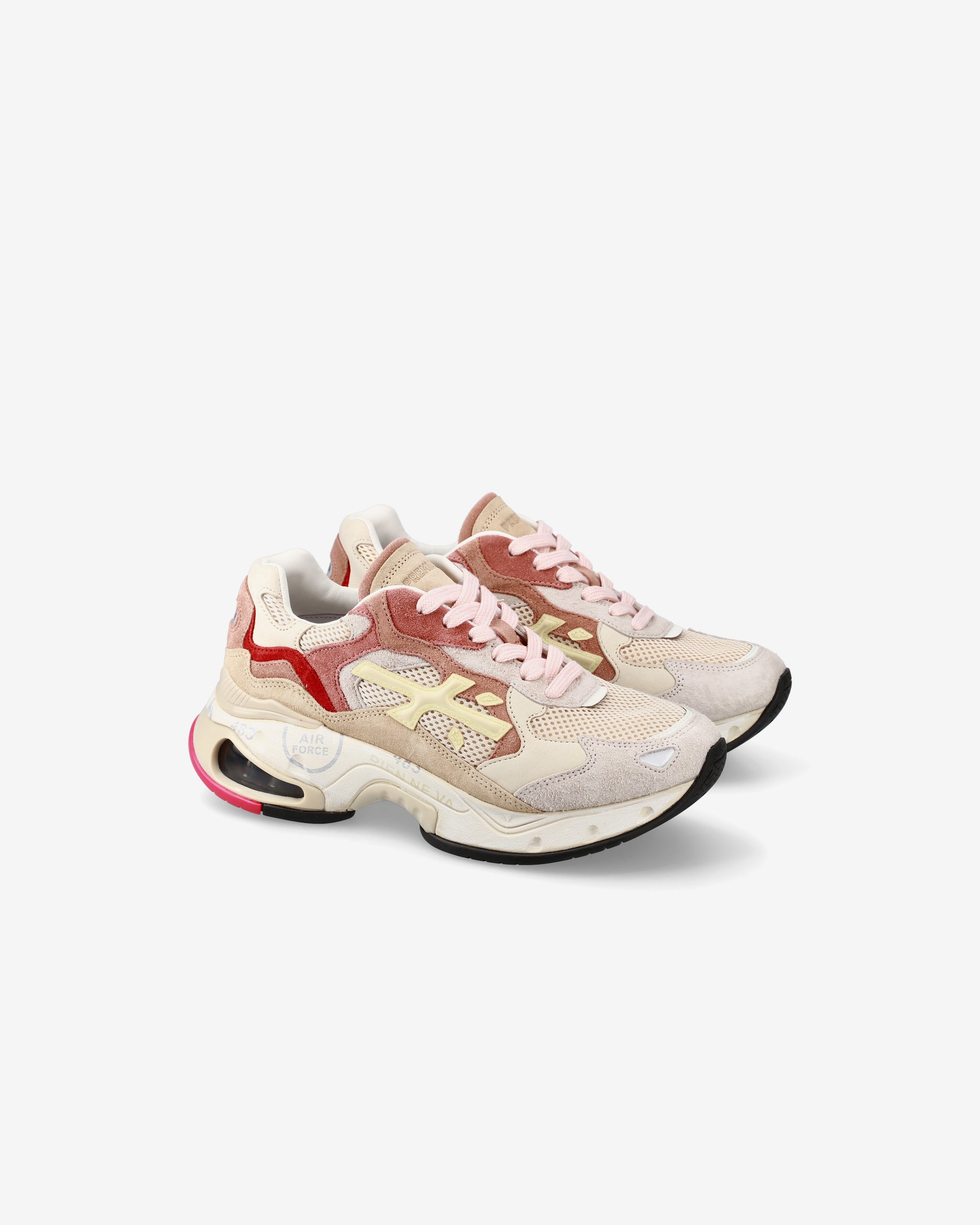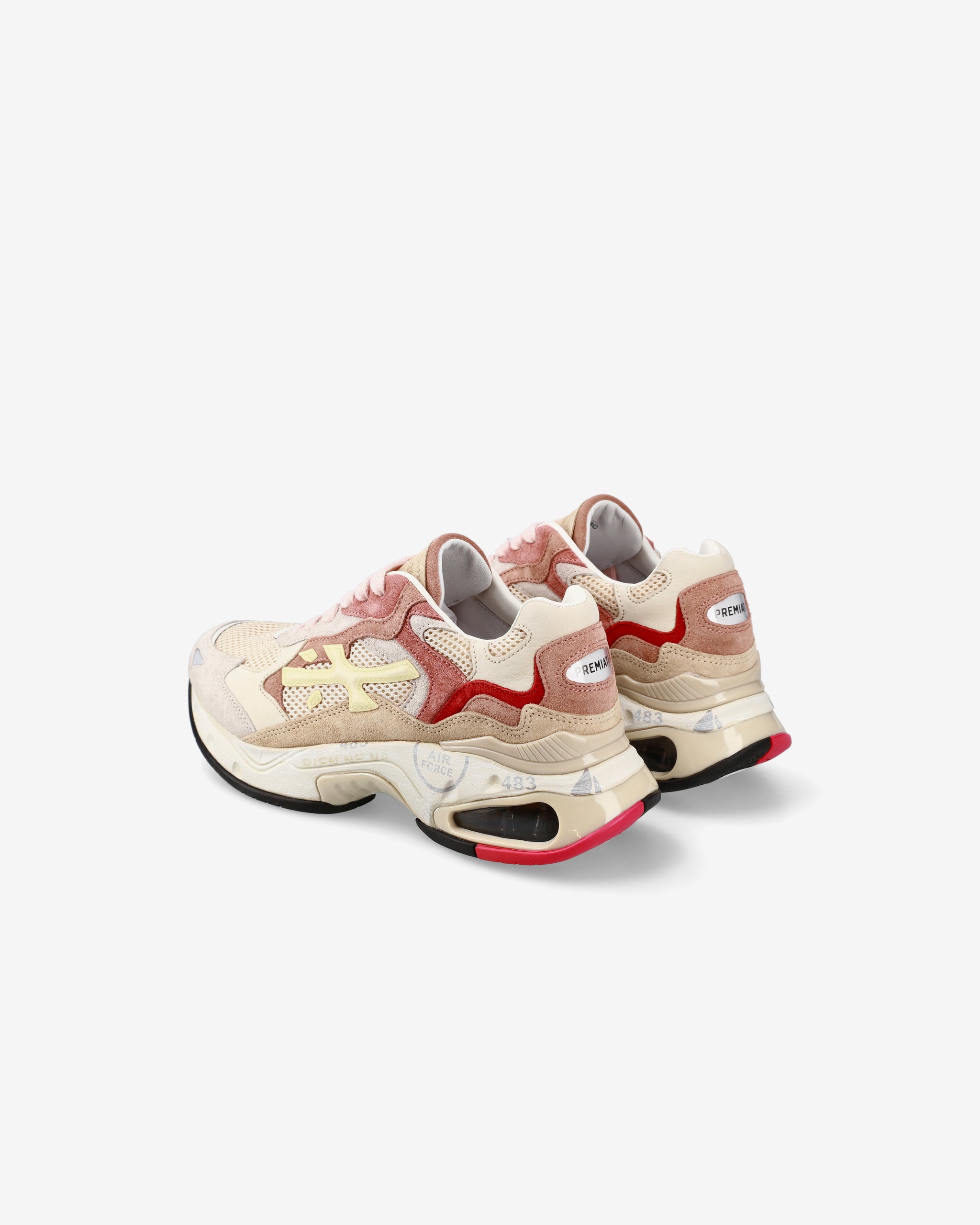 Sneaker Sharky realizzata in materiali innovativi e cromatismi ricercati. I colori e le linee sinuose ricordano le colline coltivate e i campi in fiore del paesaggio rurale delle Marche, la regione che ospita l’headquarter di Premiata. La complessità del fondo di questa sneaker la rende sofisticata e particolare.