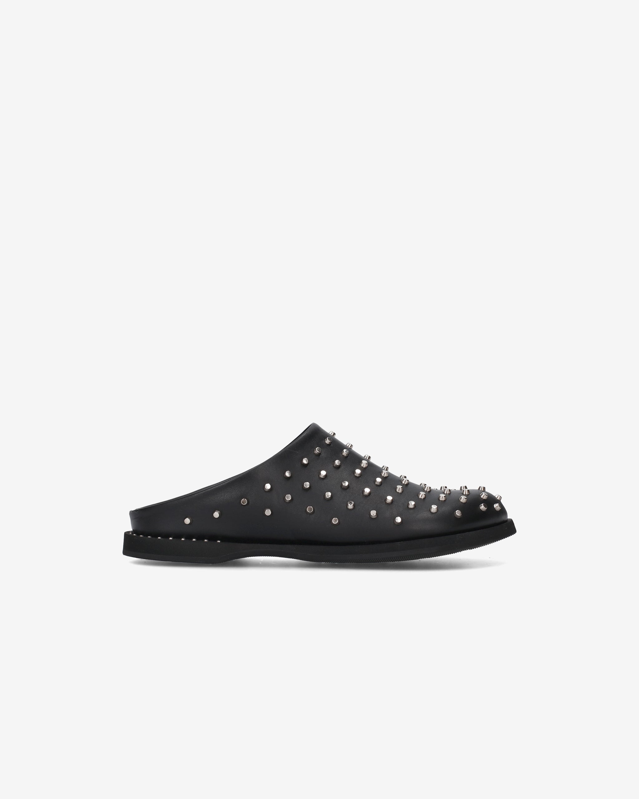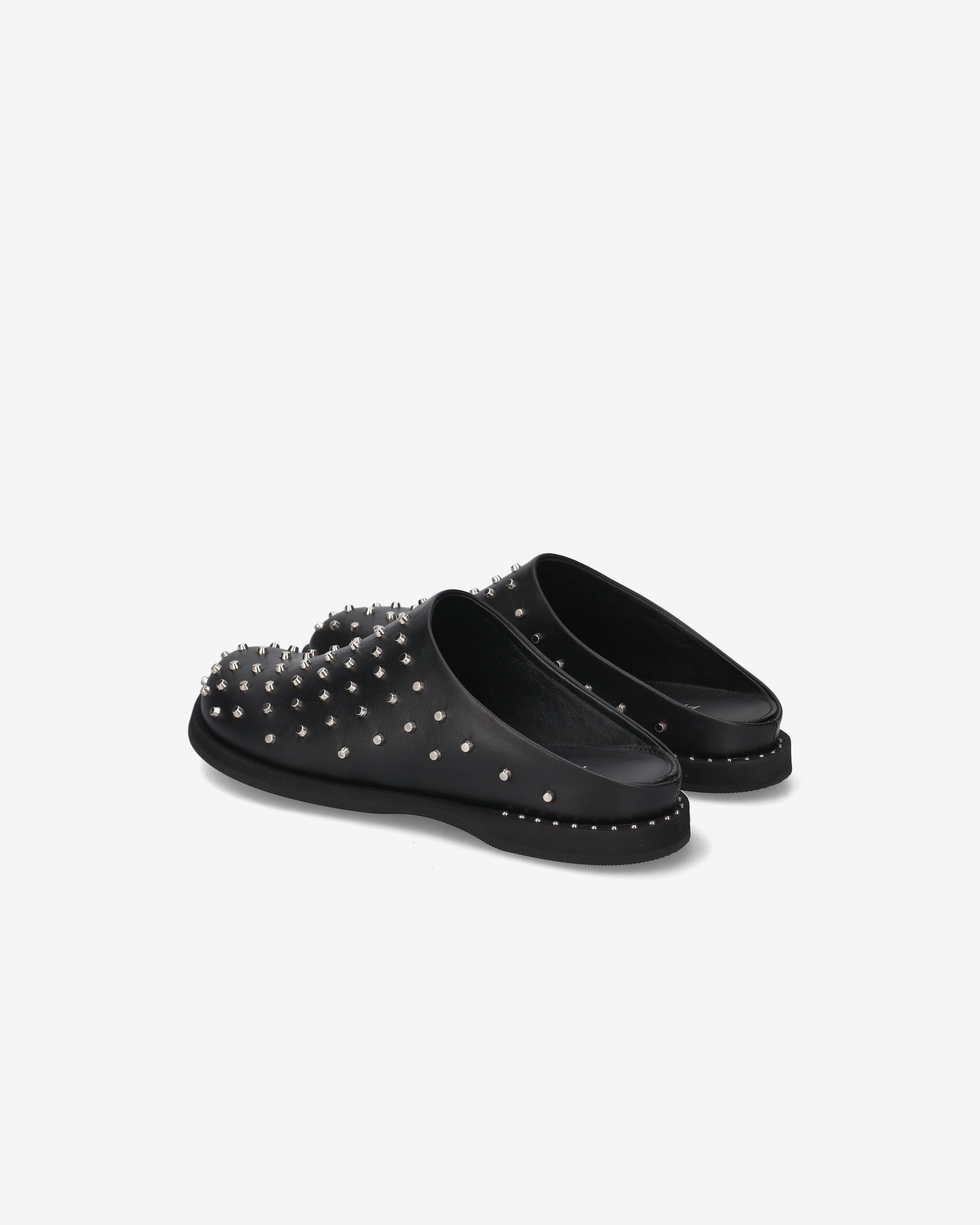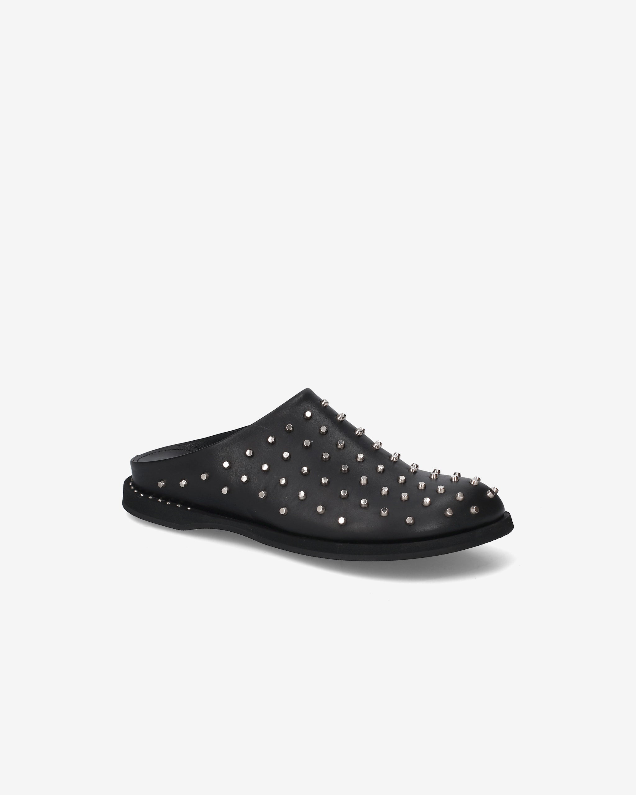 Slippers da donna dal design moderno e grintoso, perfette per chi desidera unire stile e praticità. Realizzate in pelle nera con dettagli borchiati, sono ideali per completare look casual o urban con un tocco deciso.
