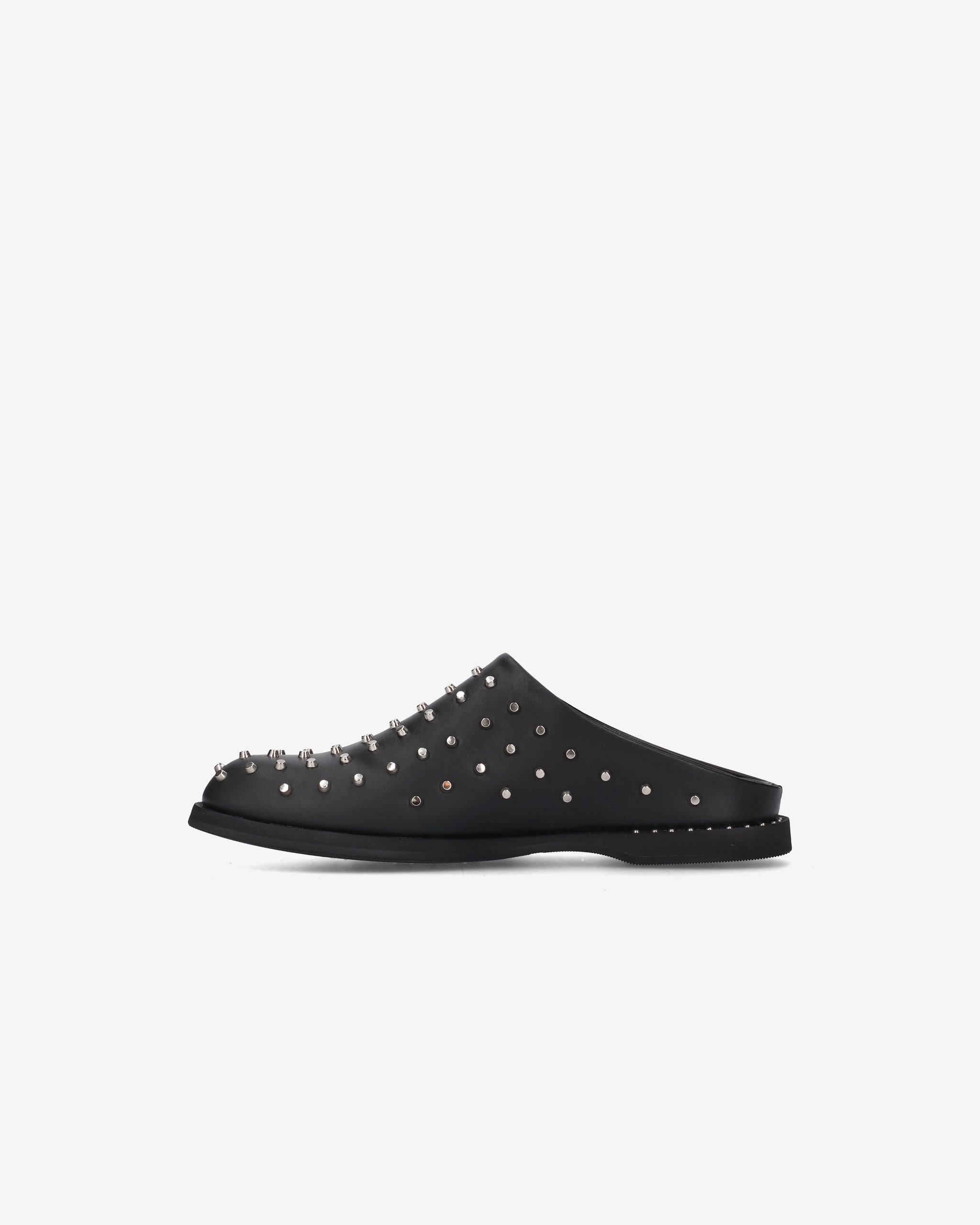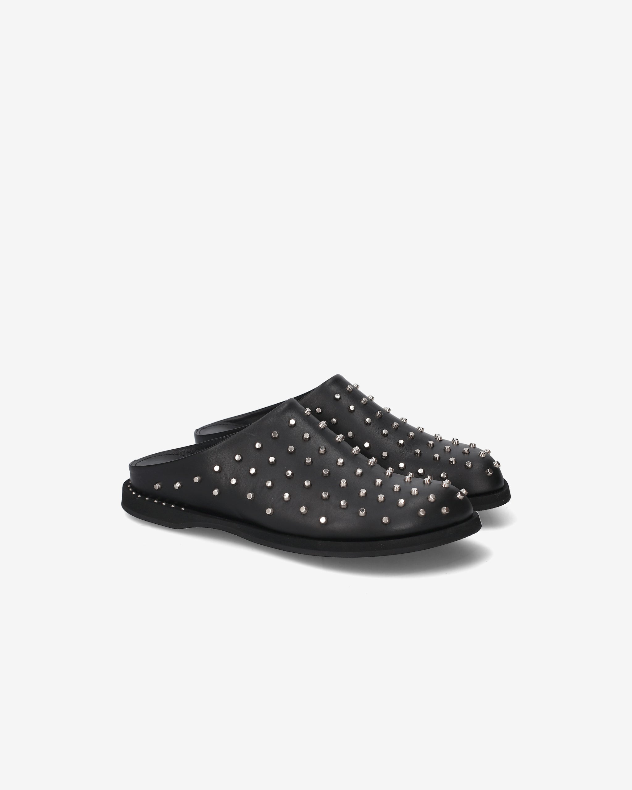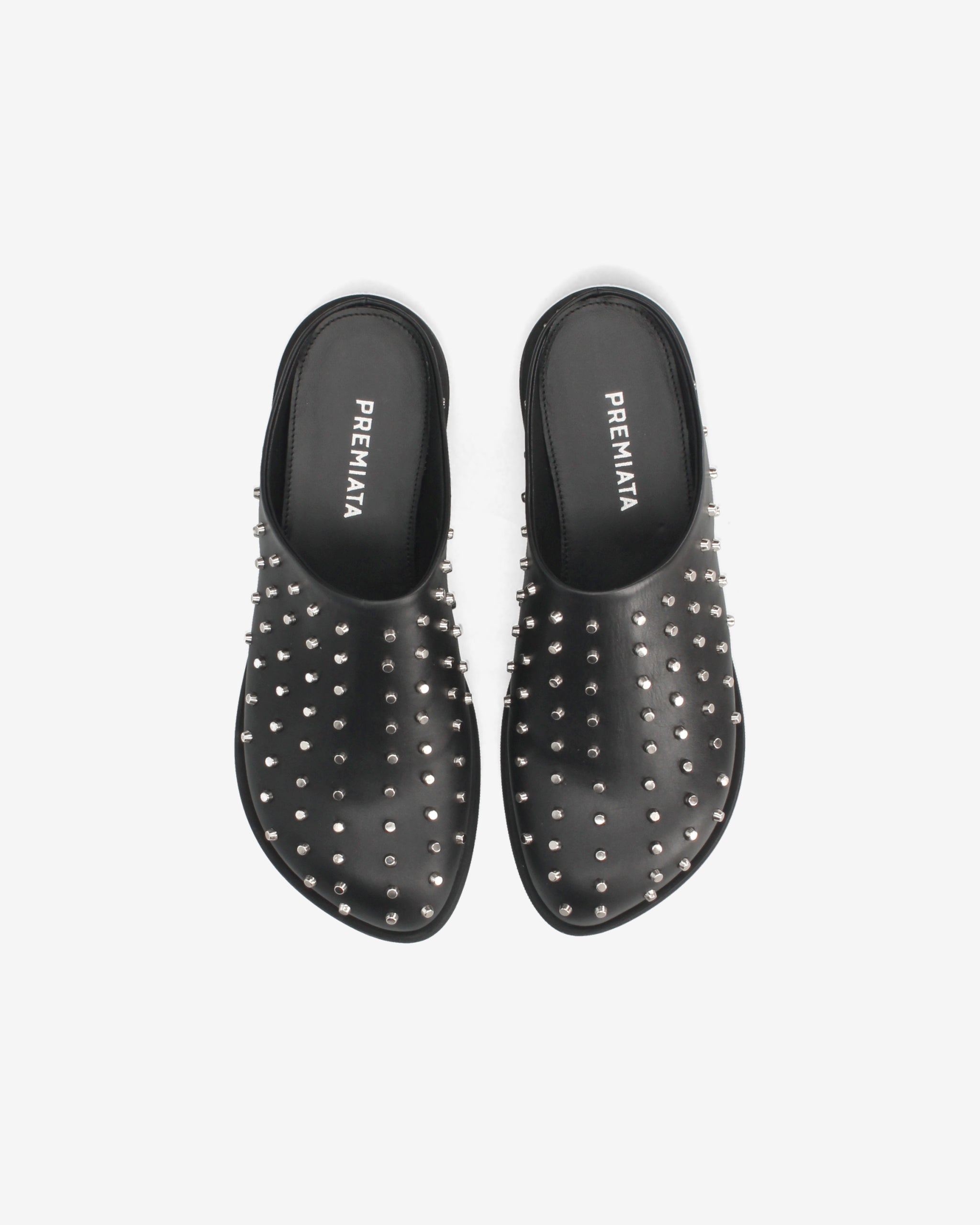 Slippers da donna dal design moderno e grintoso, perfette per chi desidera unire stile e praticità. Realizzate in pelle nera con dettagli borchiati, sono ideali per completare look casual o urban con un tocco deciso.