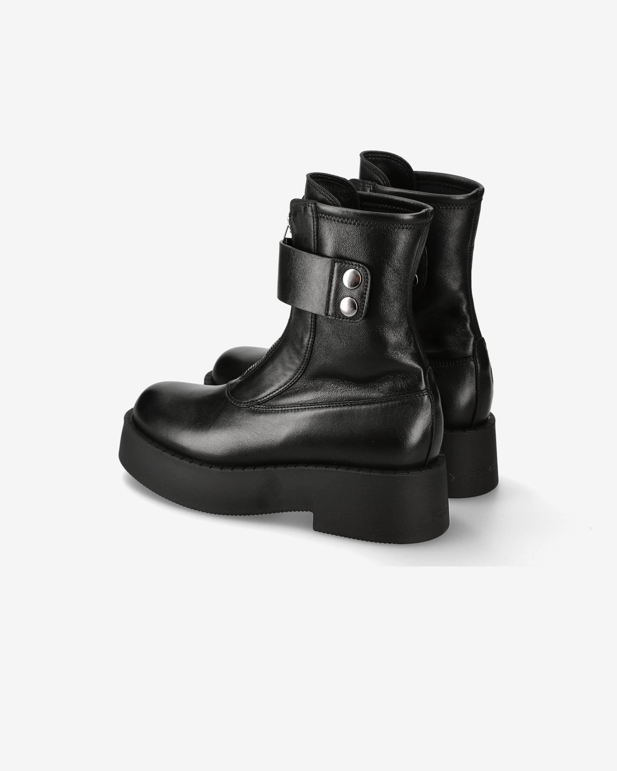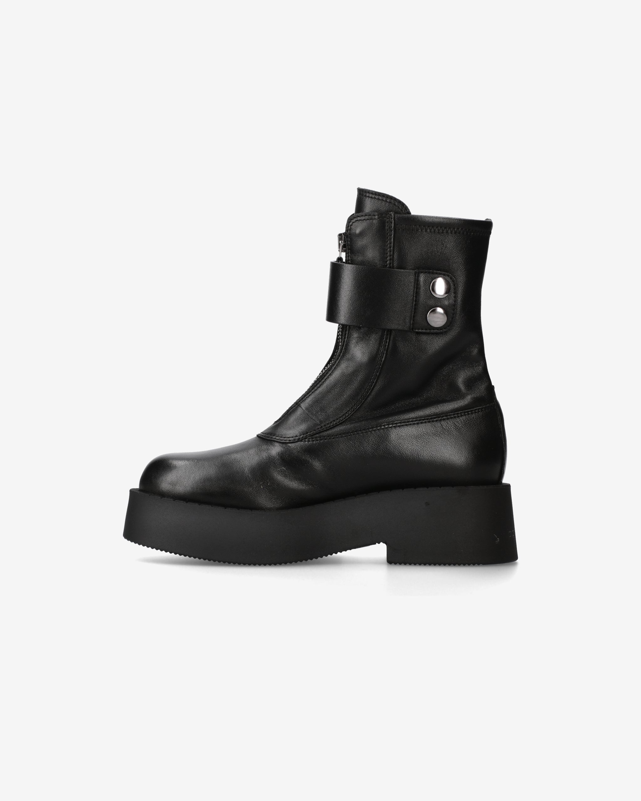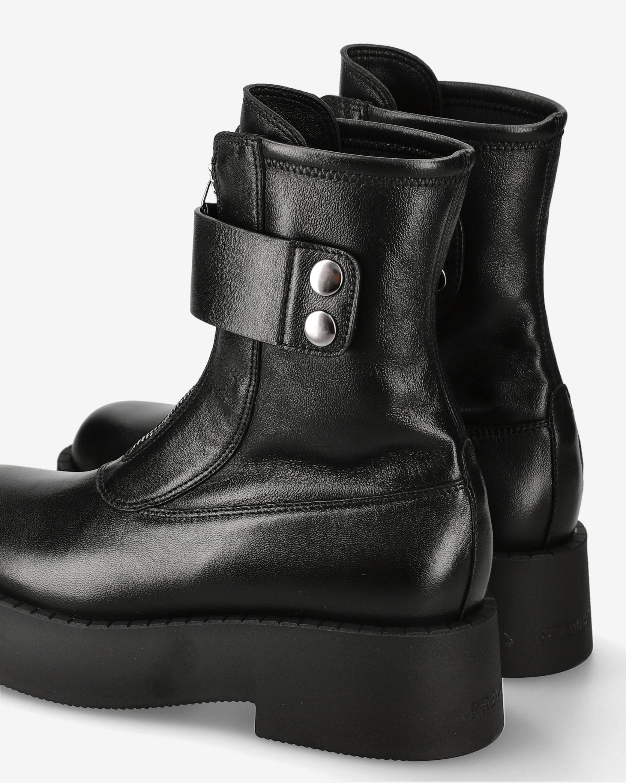 Lo stile Rock è da sempre fra i capisaldi del DNA Premiata. Perfettamente espresso in questi stivaletti in nappa, un materiale che caratterizza la collezione donna del brand e la contraddistingue. I dettagli in vitello, che impreziosiscono la creazione, fanno da trait d'union con il resto della collezione.