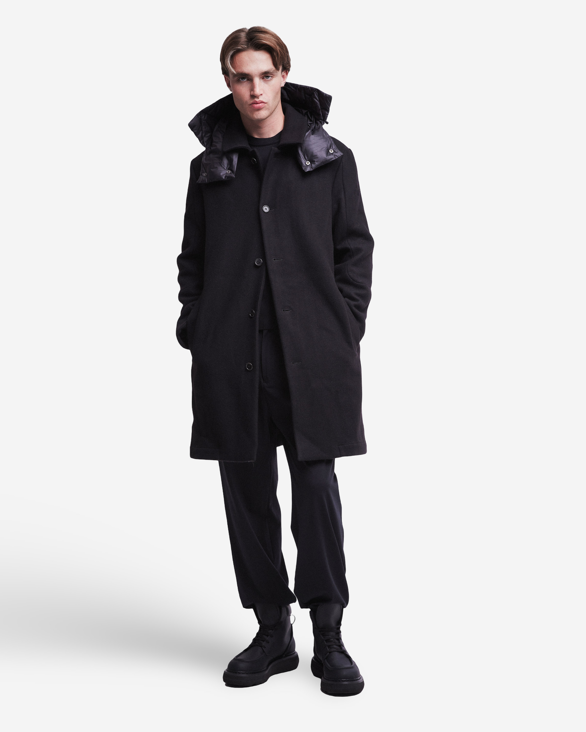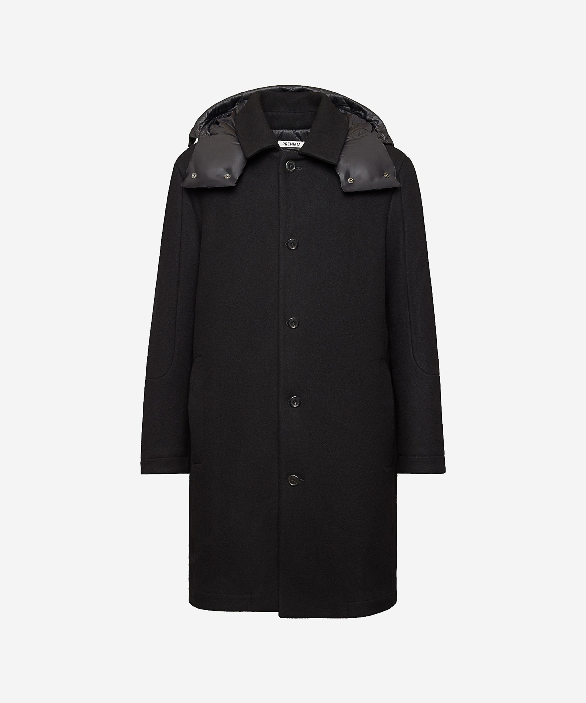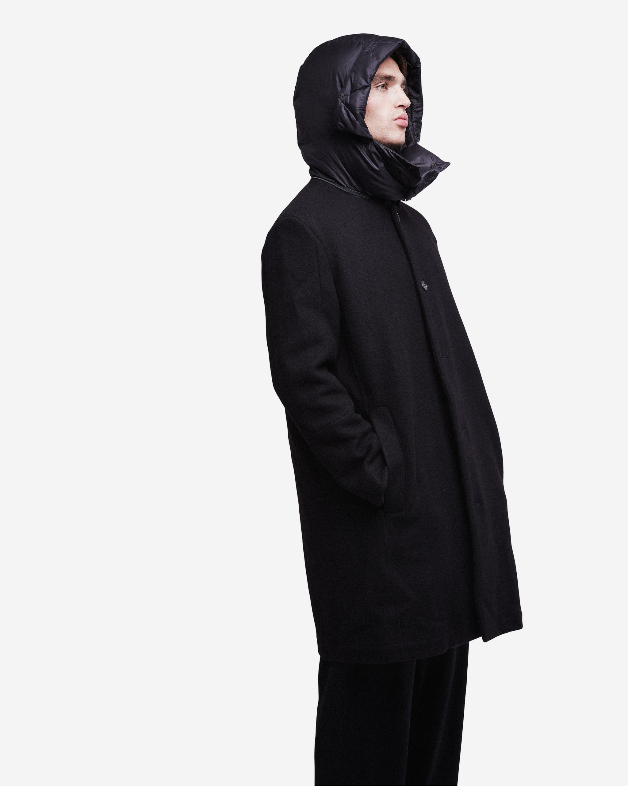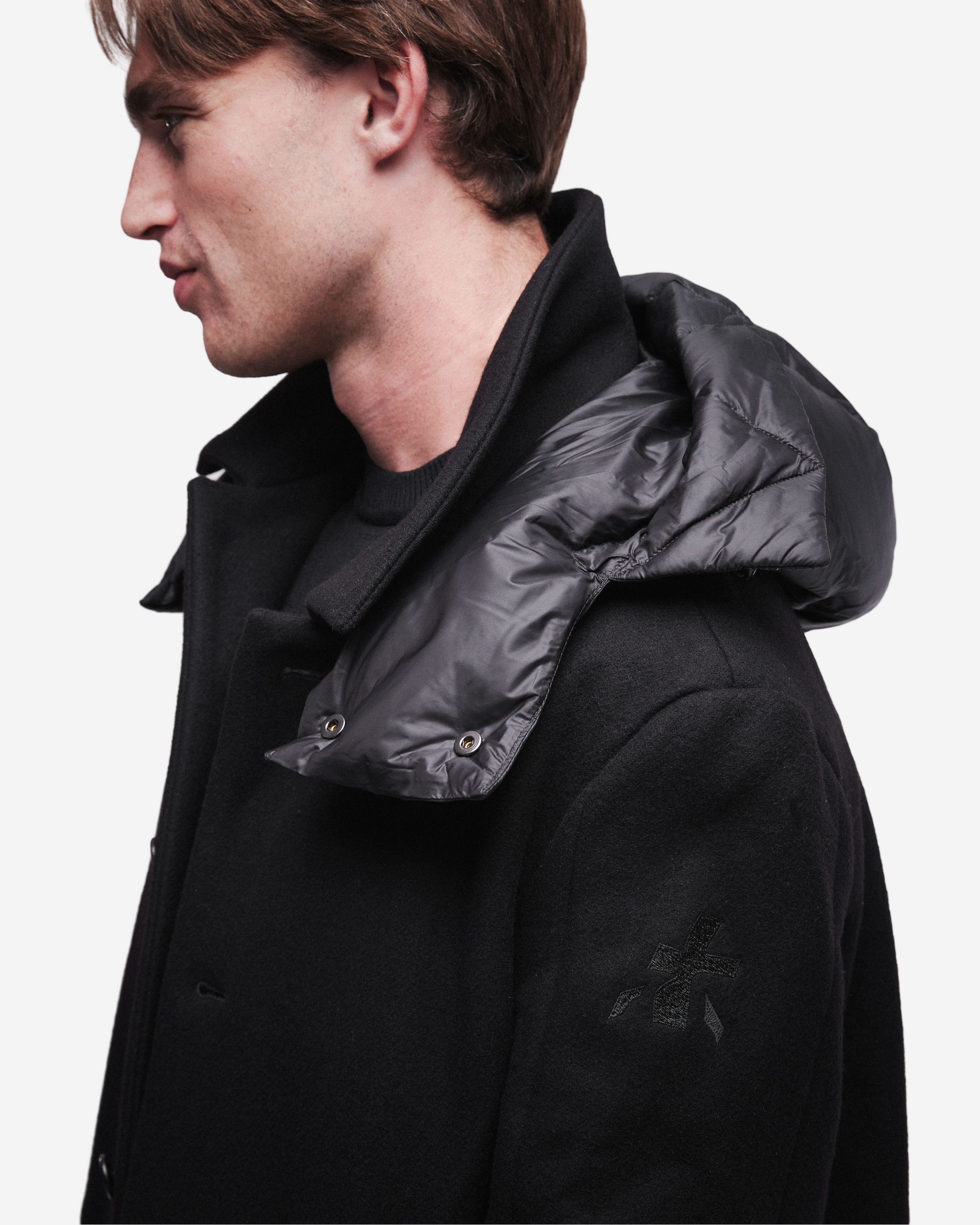 - Cappuccio staccabile con motivo visiera in nylon Fury imbottito in piuma e chiuso da automatici in metallo gommato nero personalizzati con logo.