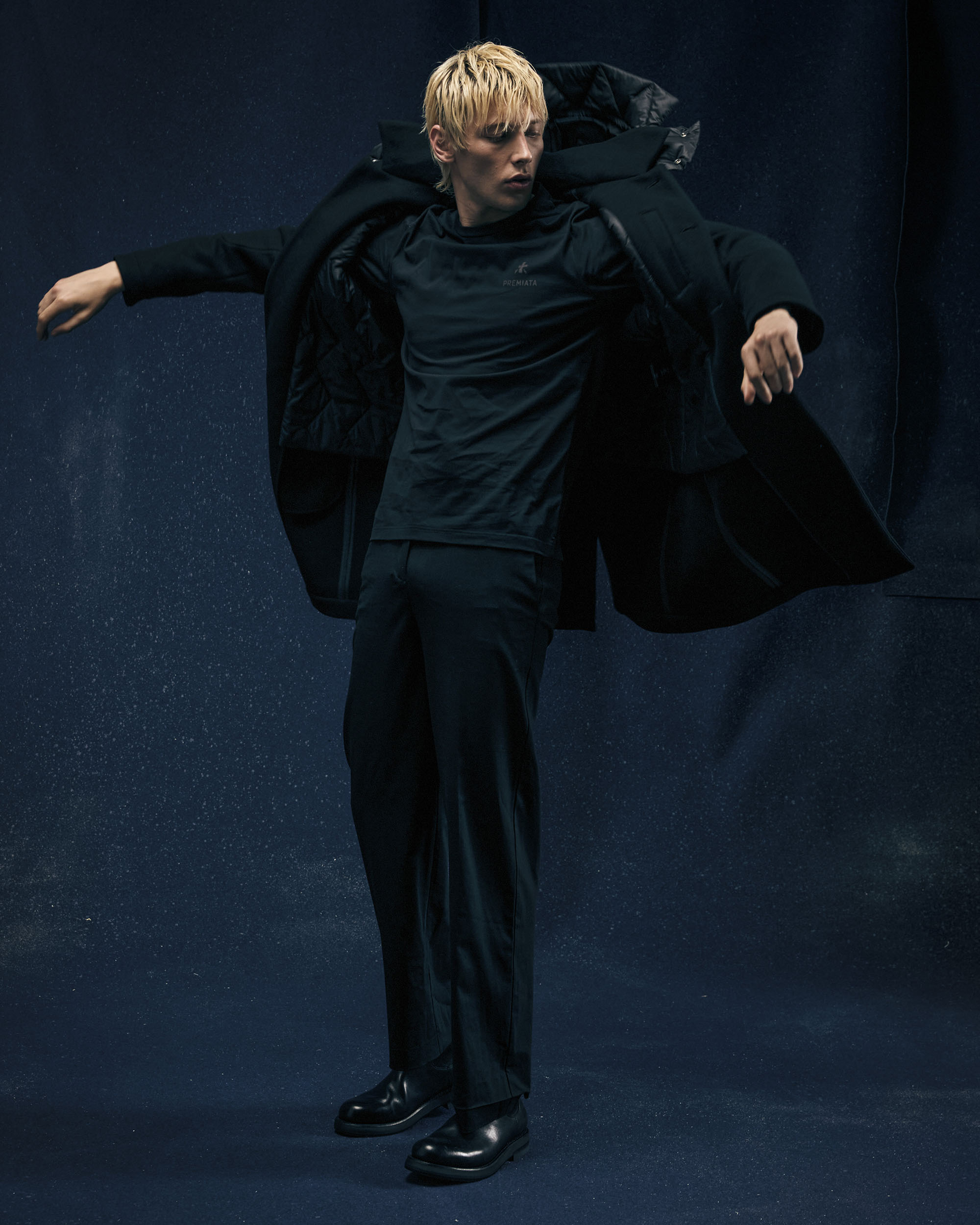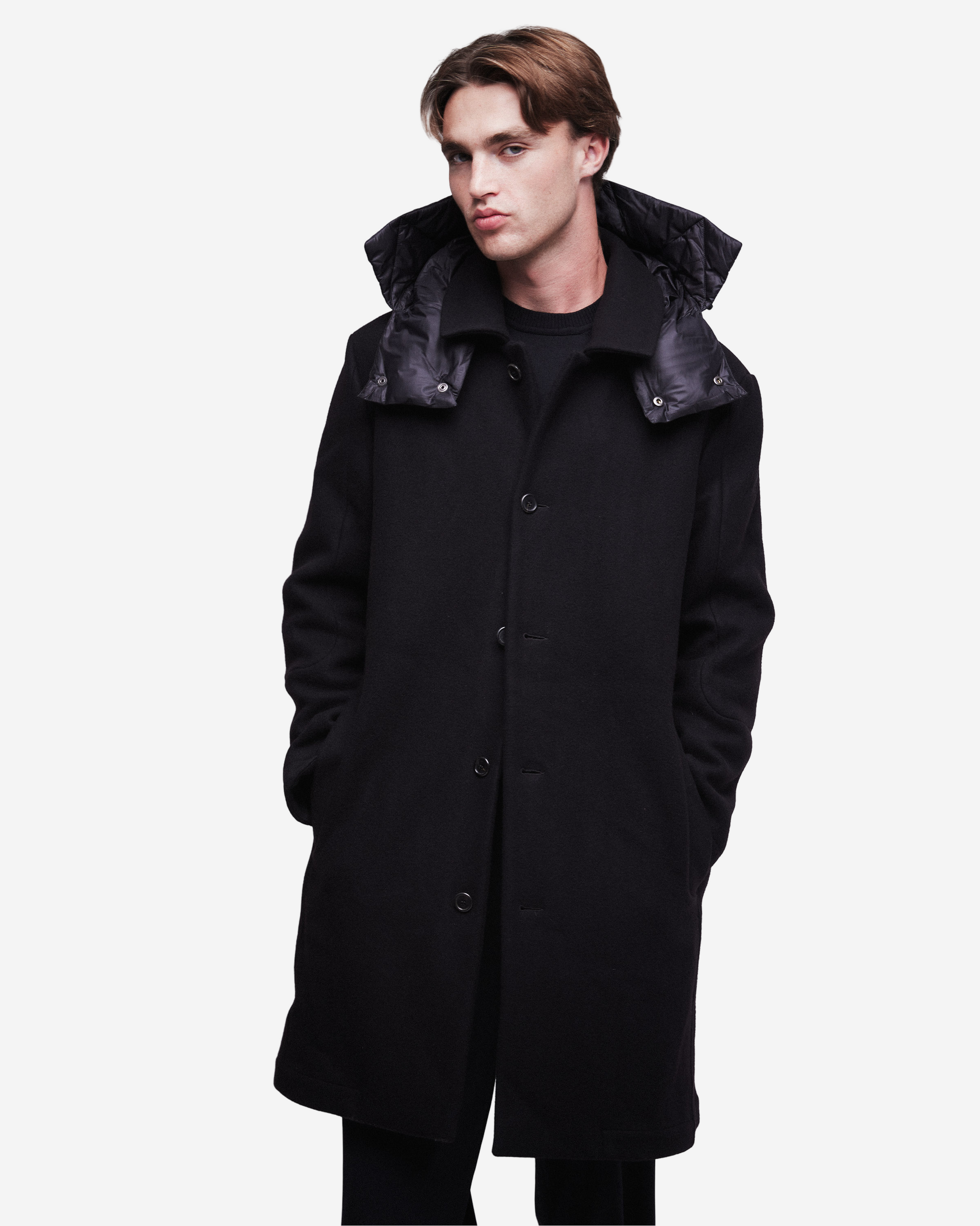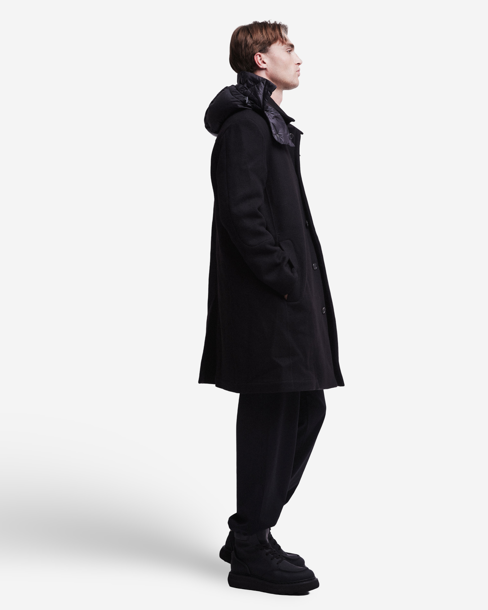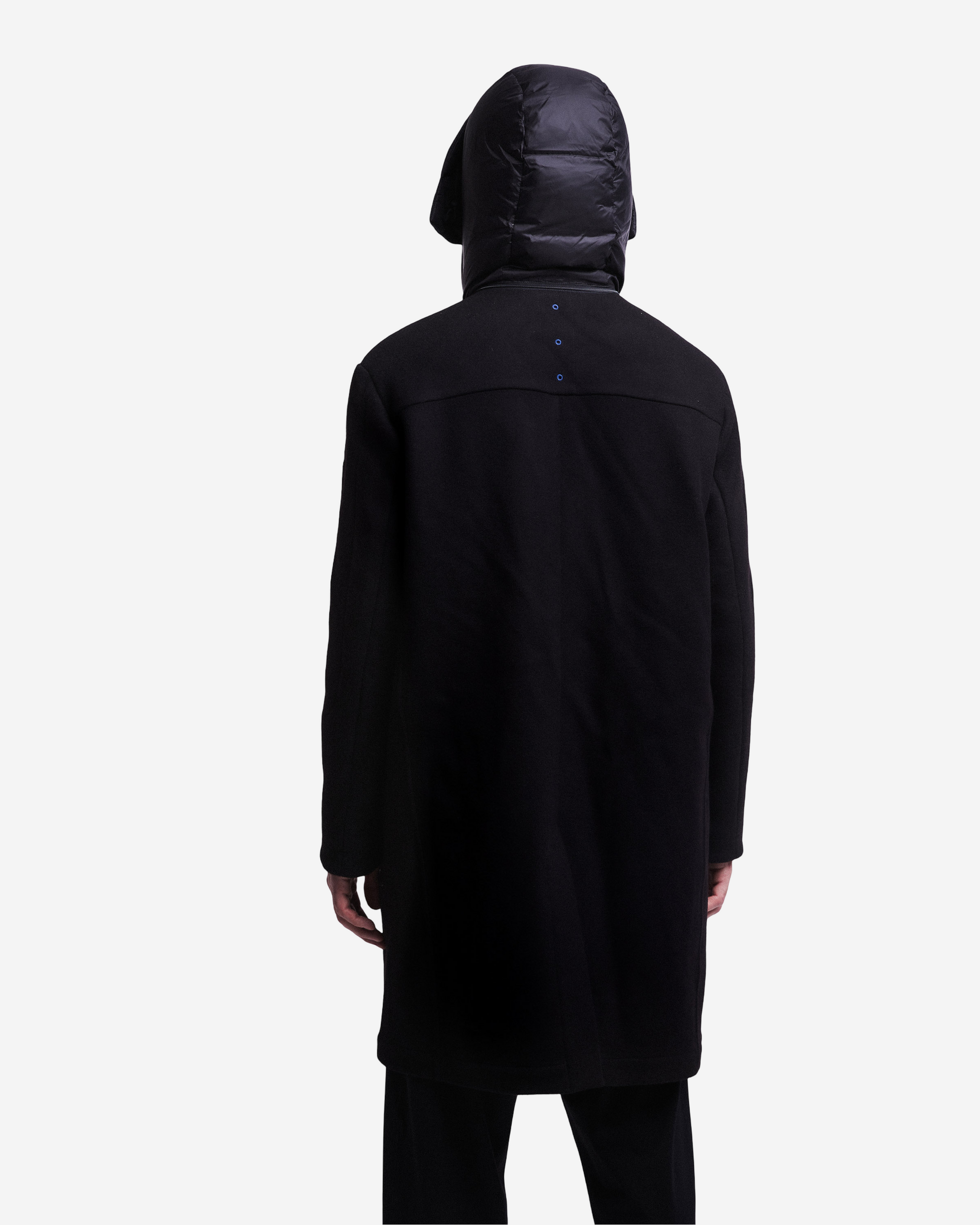 - Cappuccio staccabile con motivo visiera in nylon Fury imbottito in piuma e chiuso da automatici in metallo gommato nero personalizzati con logo.