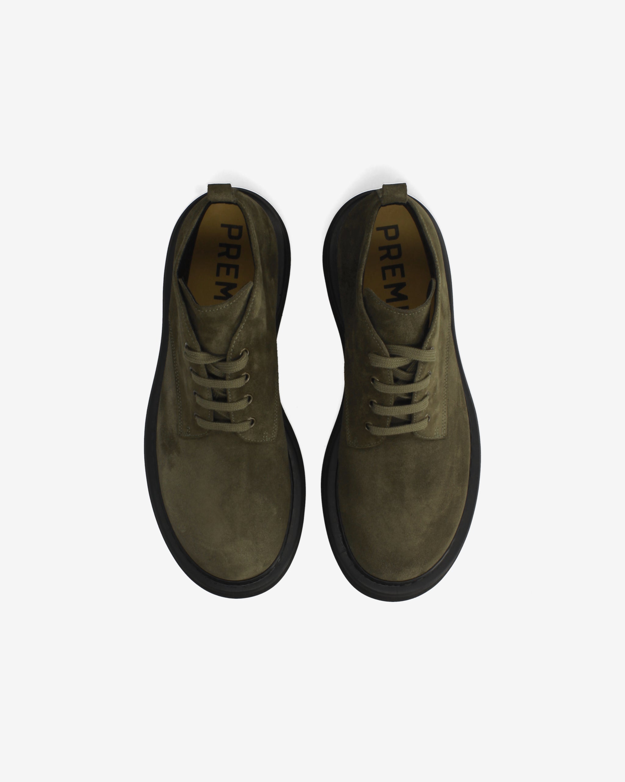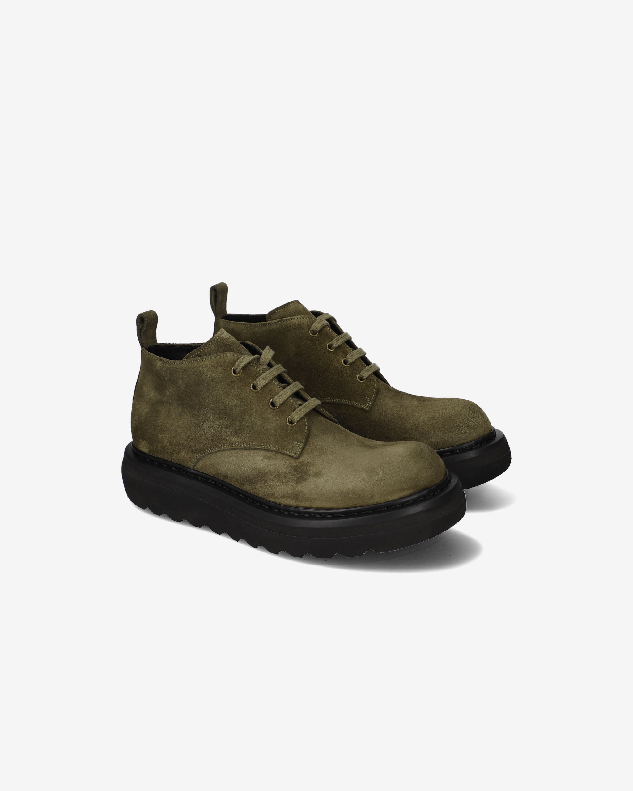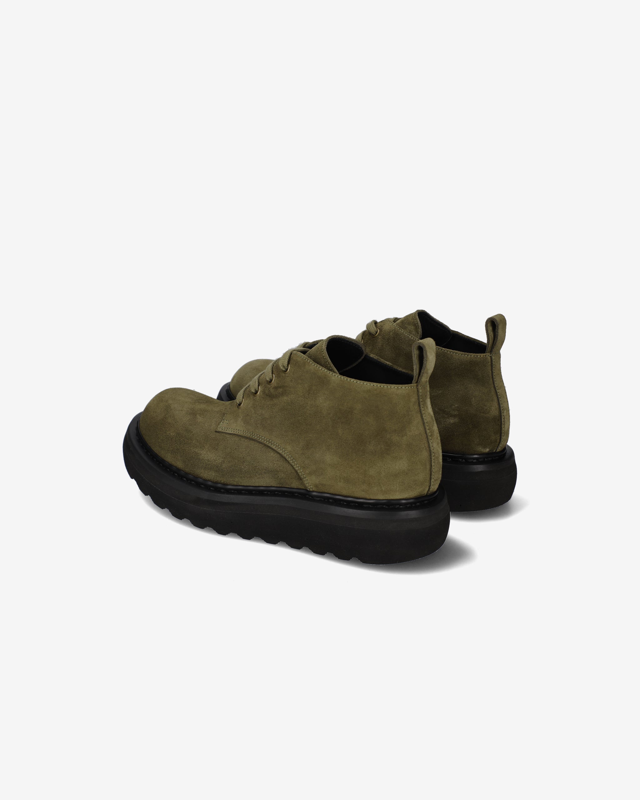 Polacchini d’ispirazione Clark reinterpretati in chiave contemporanea. La tomaia in pelle scamosciata e la suola in Eva assicurano comfort e leggerezza, mentre la lavorazione Goodyear e le cuciture Paraboot ne evidenziano la qualità artigianale.