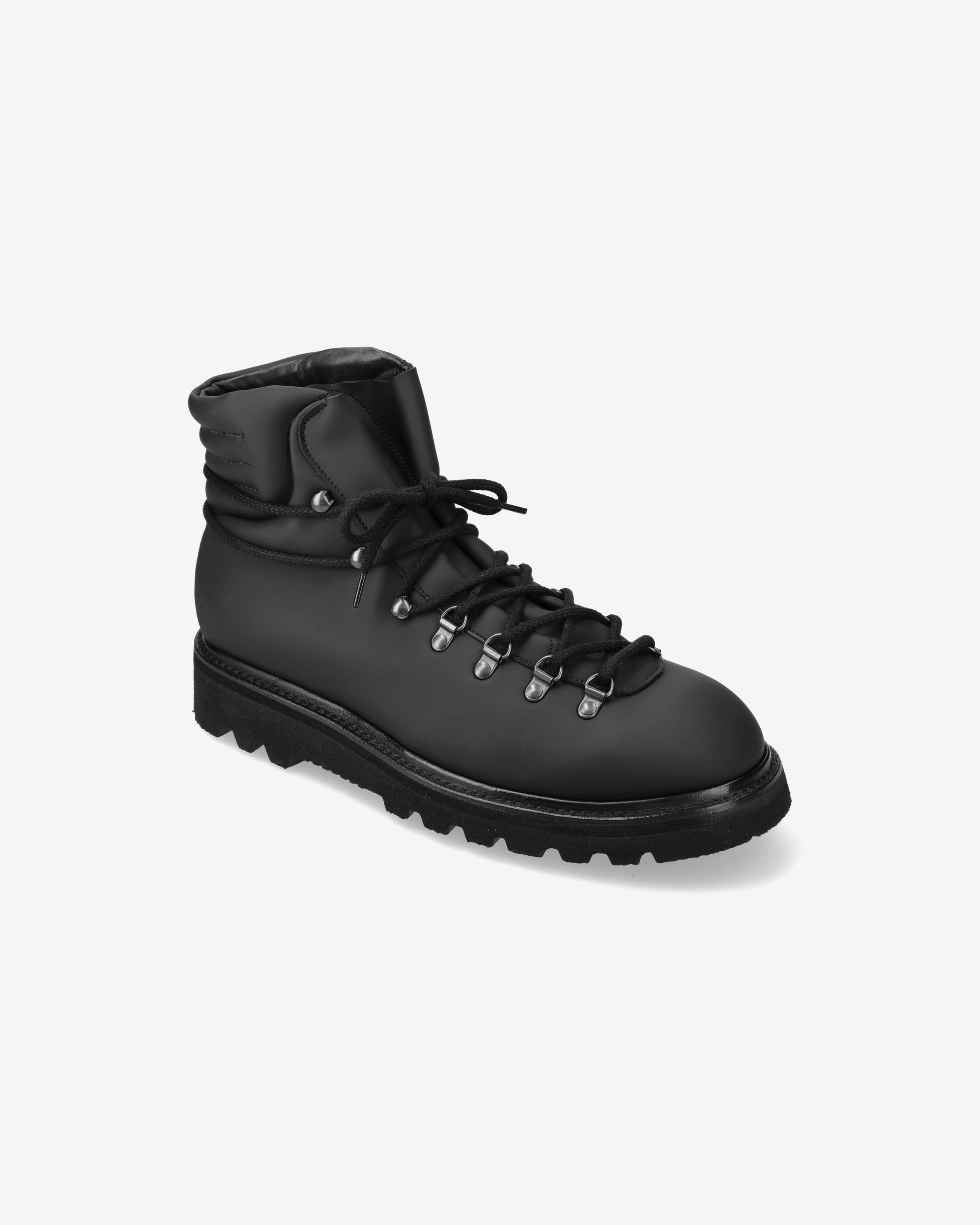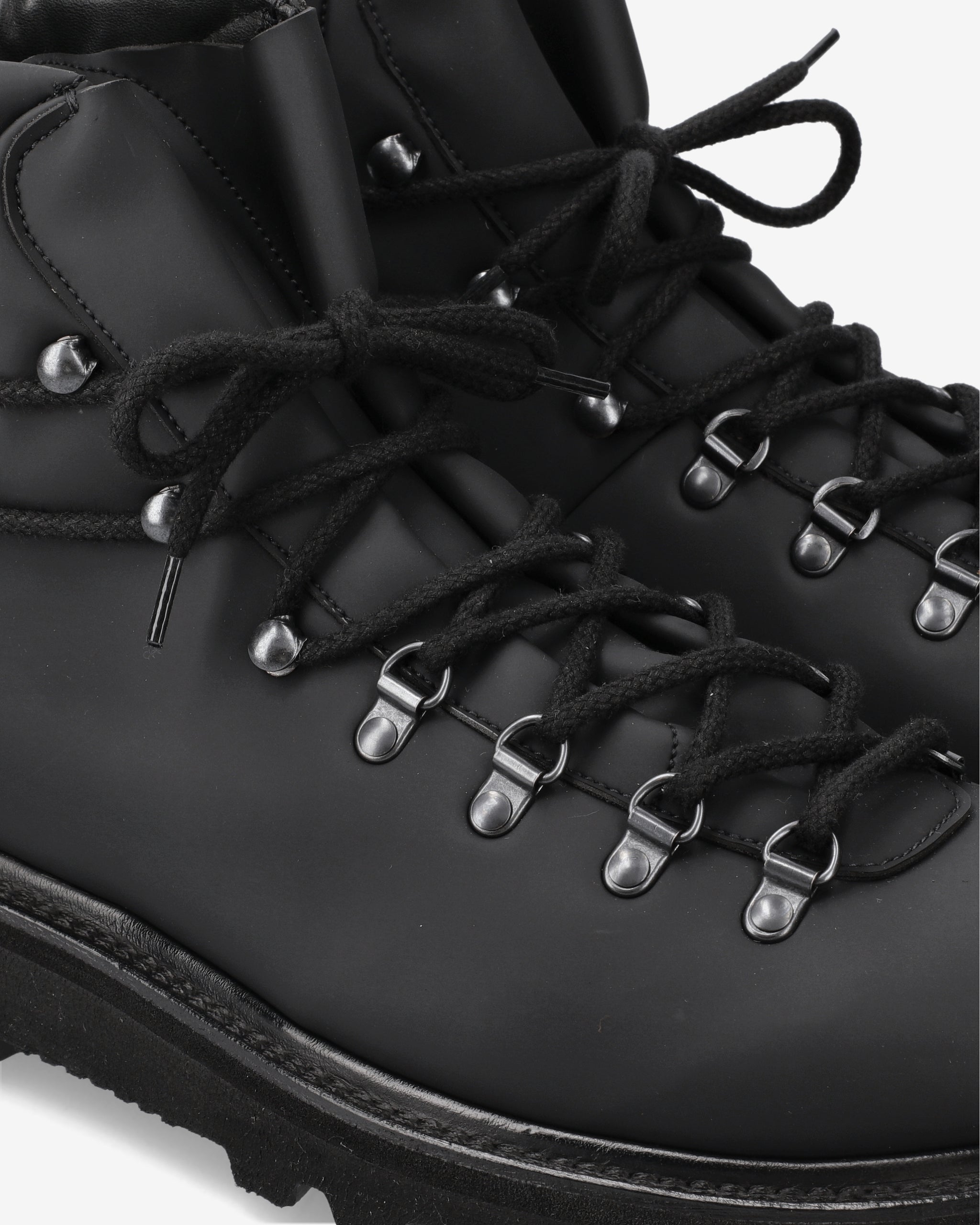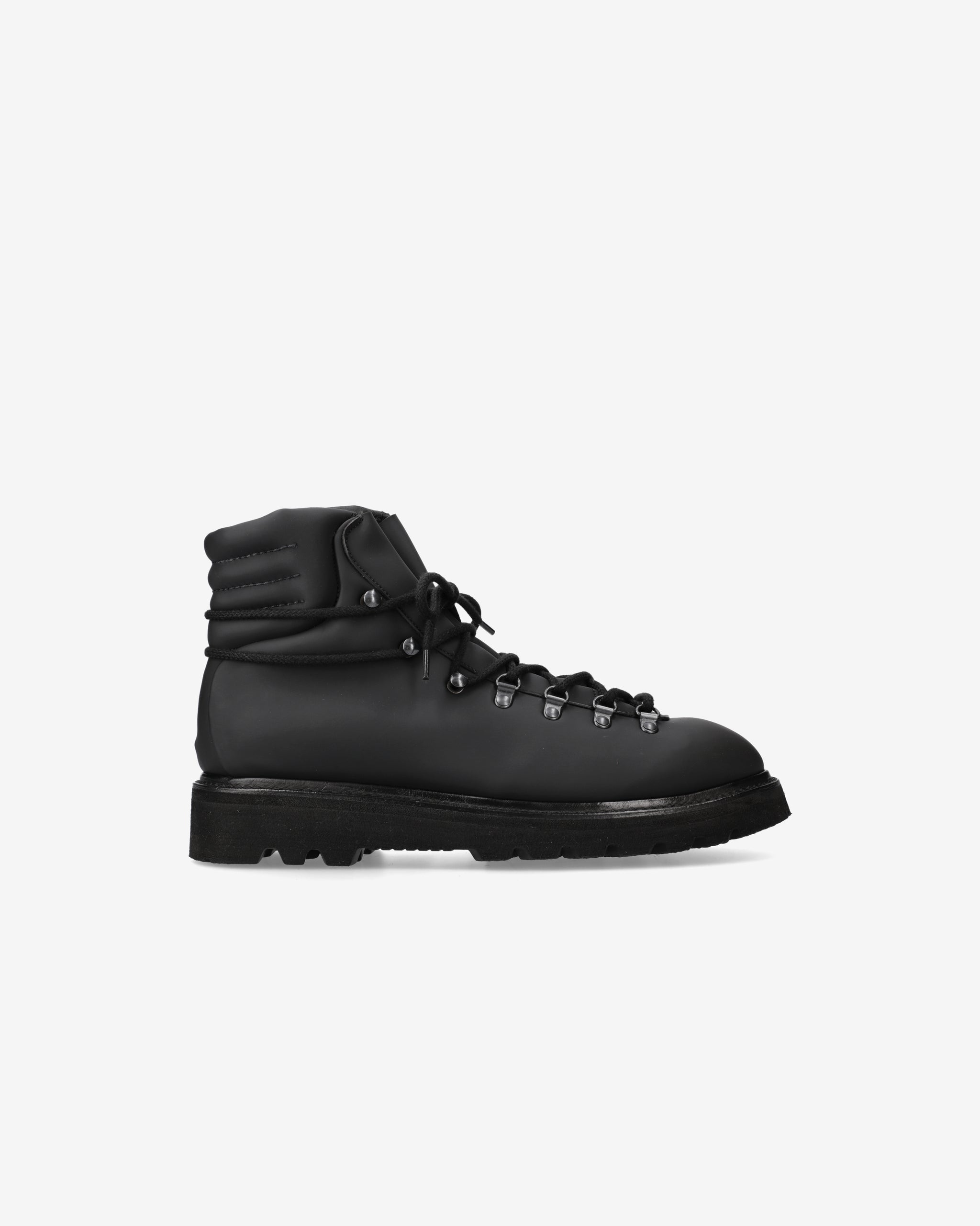 Questi stivaletti incarnano l'anima ibrida di Premiata. Realizzati in custo, un tessuto industriale da tempo legato al marchio, si caratterizzano per il mix di materiali, lo stile e per il design che ricorda quello di una pedula da montagna con fondo in Vibram.