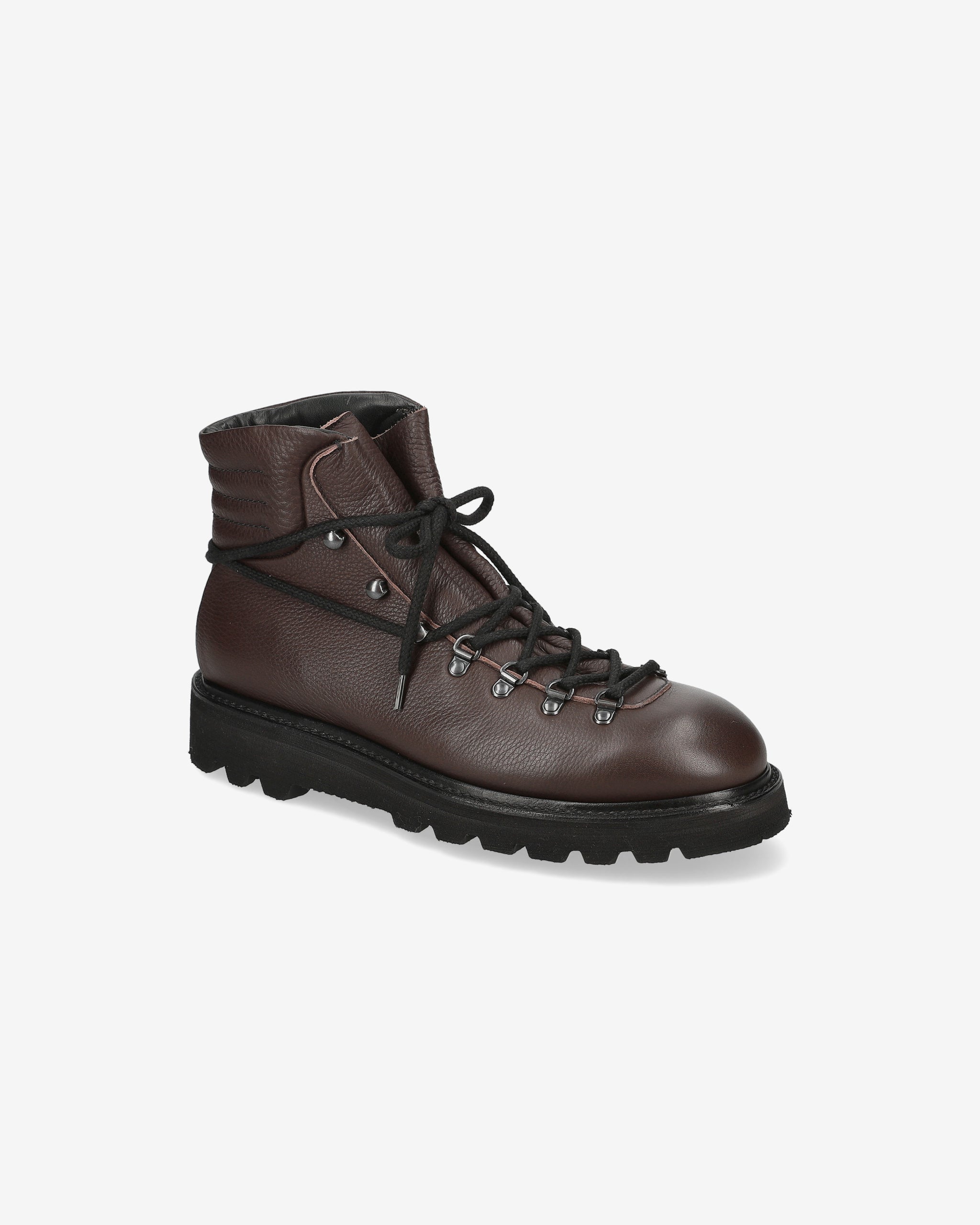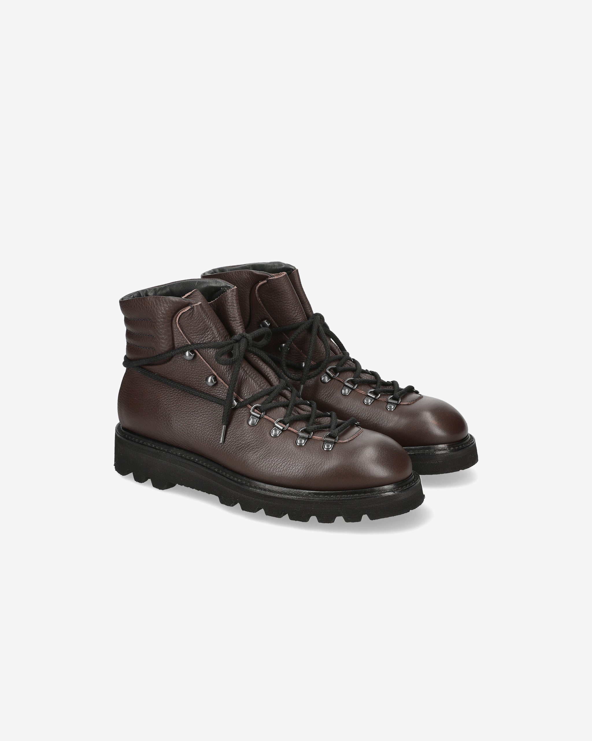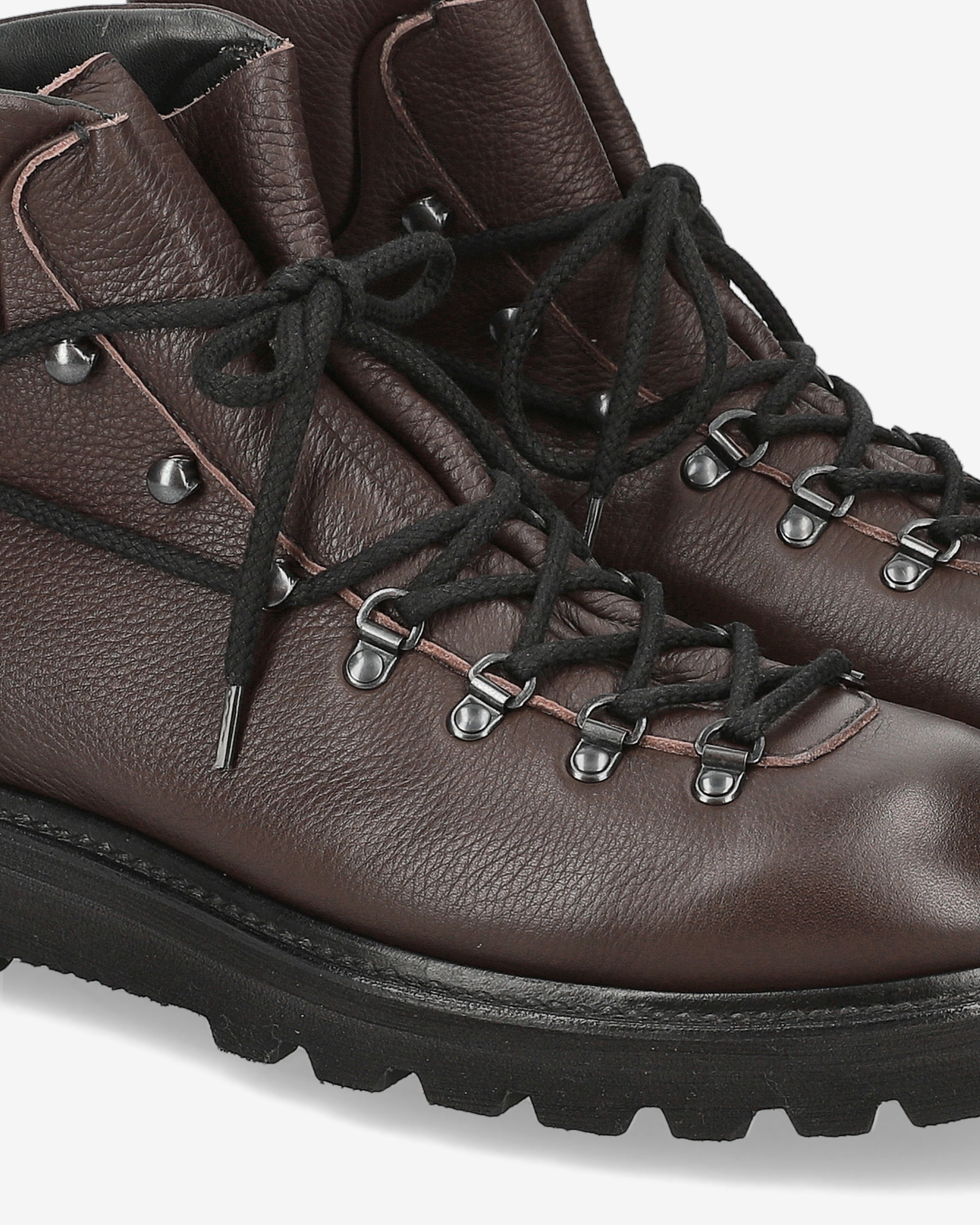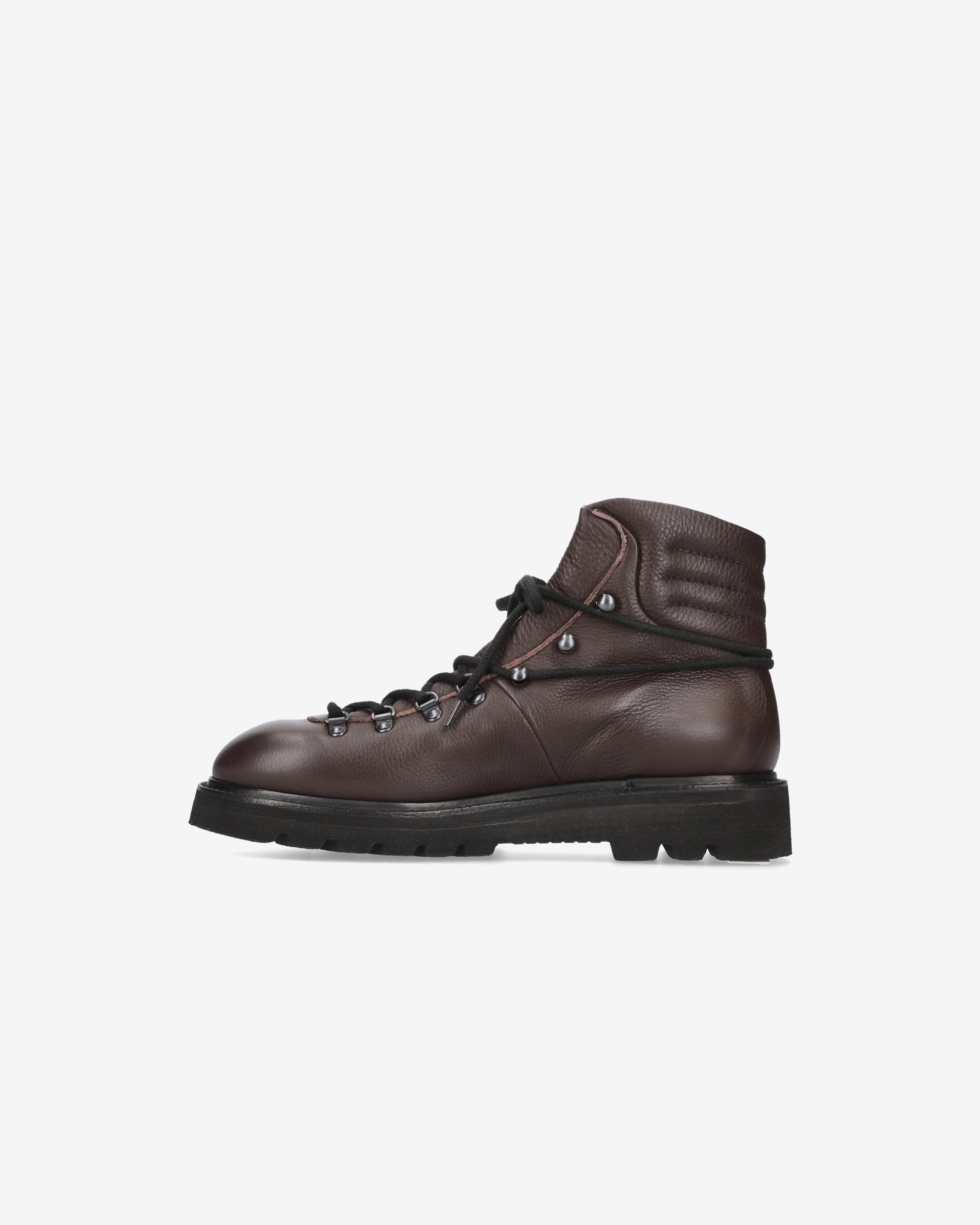 Questi stivaletti incarnano l'anima ibrida di Premiata. Realizzati in pelle, si caratterizzano per il mix di materiali, lo stile e per il design che ricorda quello di una pedula da montagna con fondo Vibram.