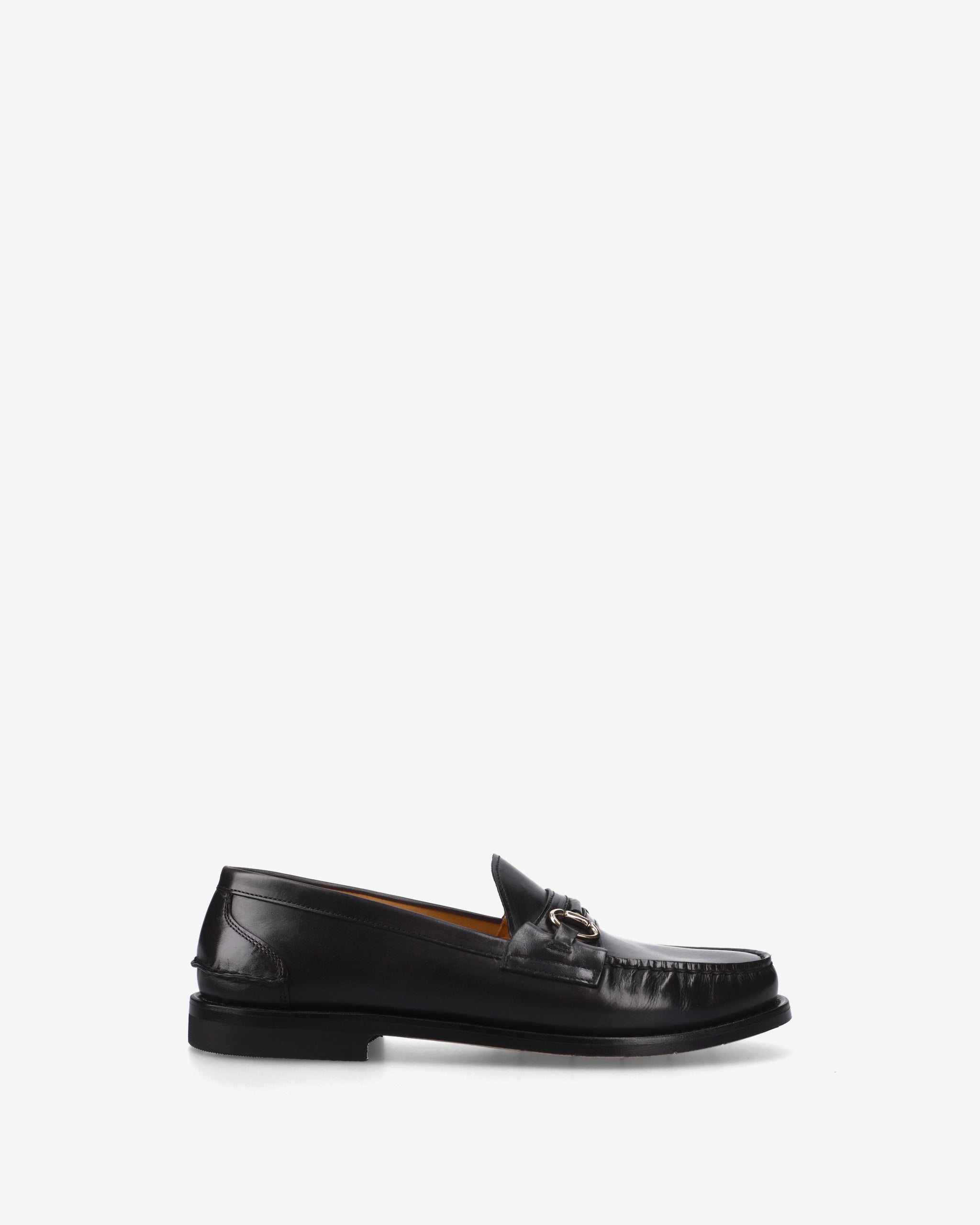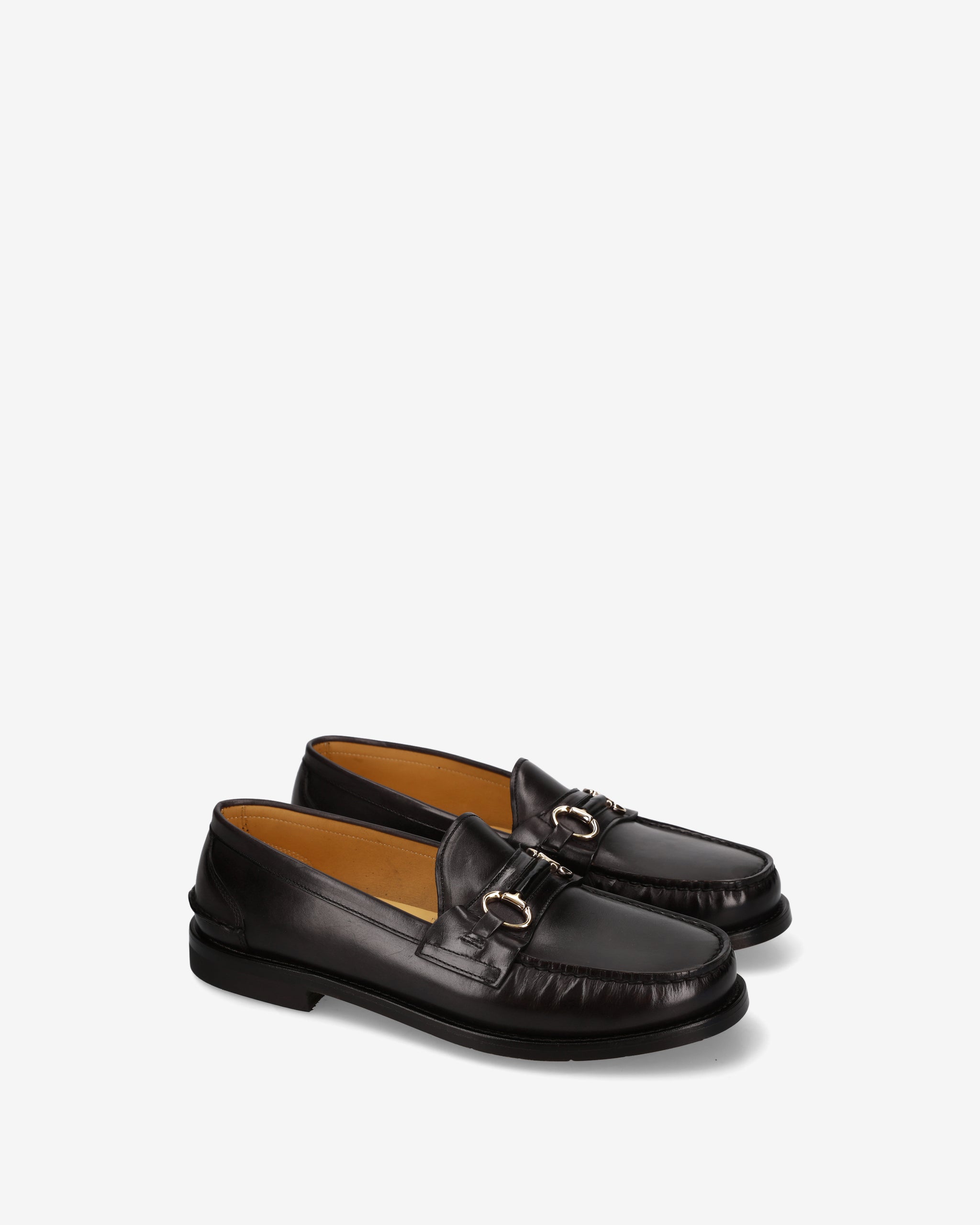 Elegante mocassino in pelle caratterizzato da un design sofisticato e dettagli metallici discreti. La tonalità scura e la texture pulita lo rendono un elemento distintivo del guardaroba maschile contemporaneo