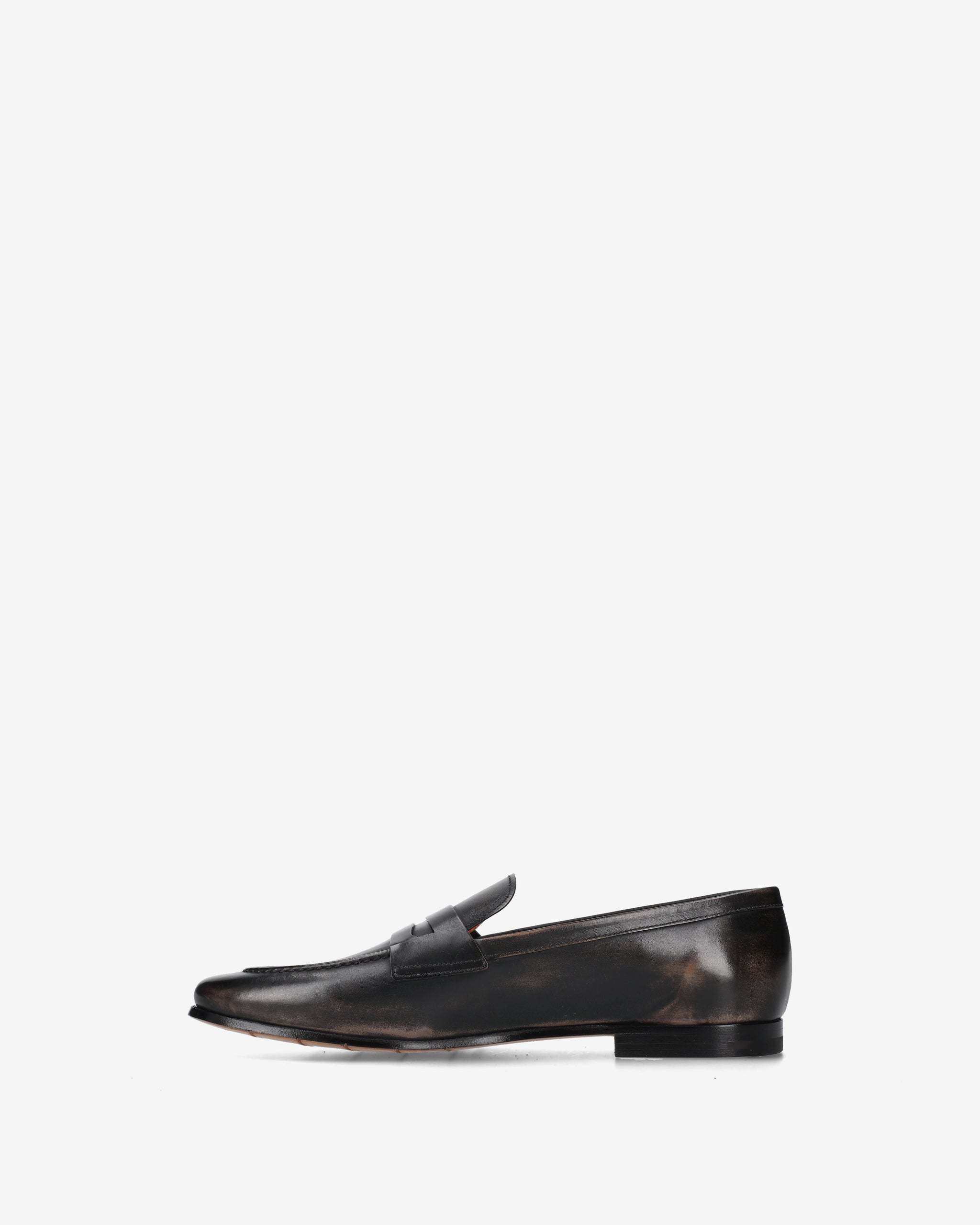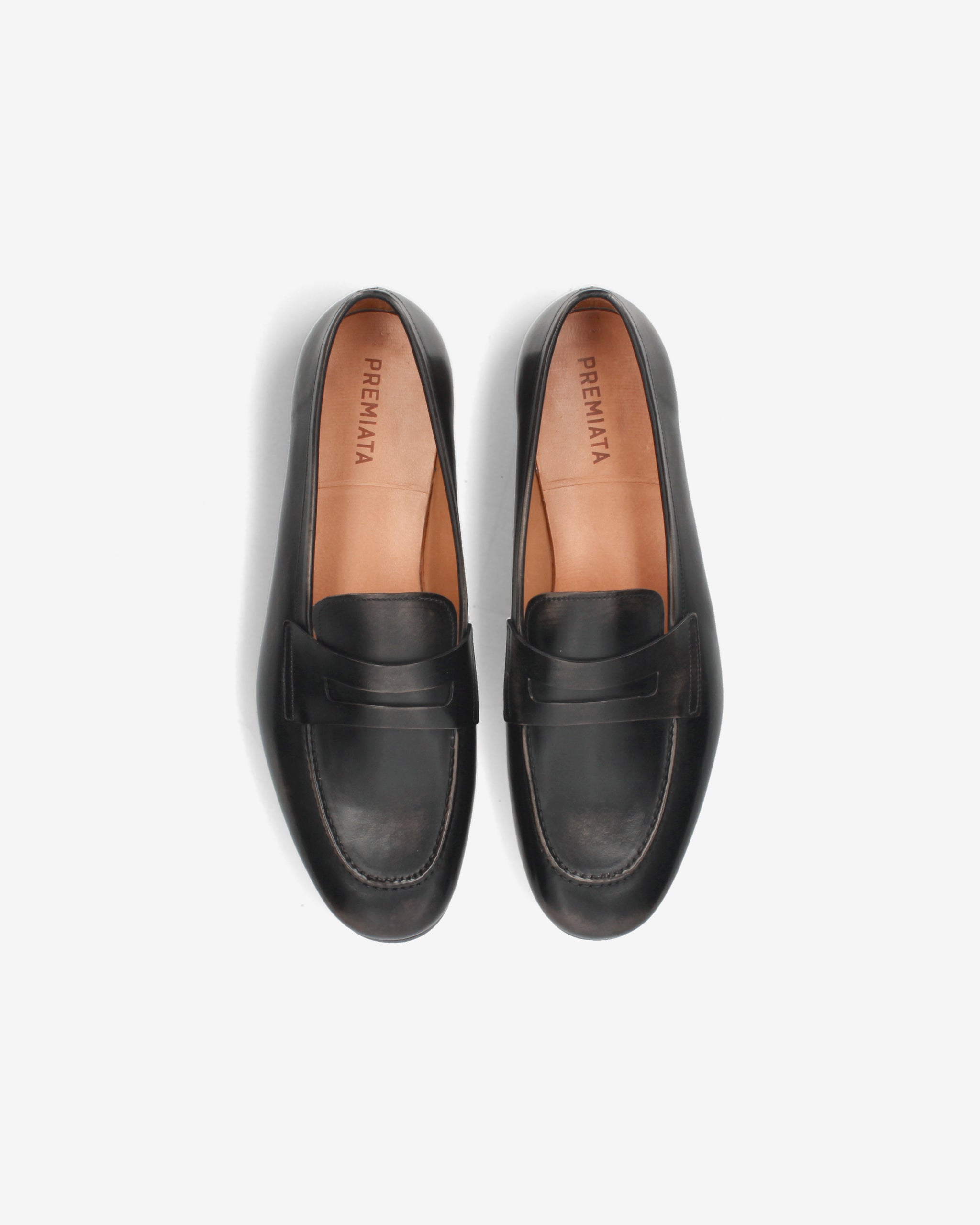 Un mocassino "Penny Loafer" dall'estetica essenziale e destrutturata, che reinterpreta un grande classico maschile privilegiando la leggerezza e la morbidezza dei materiali. La silhouette affusolata e la finitura sfumata ne esaltano il carattere artigianale contemporaneo