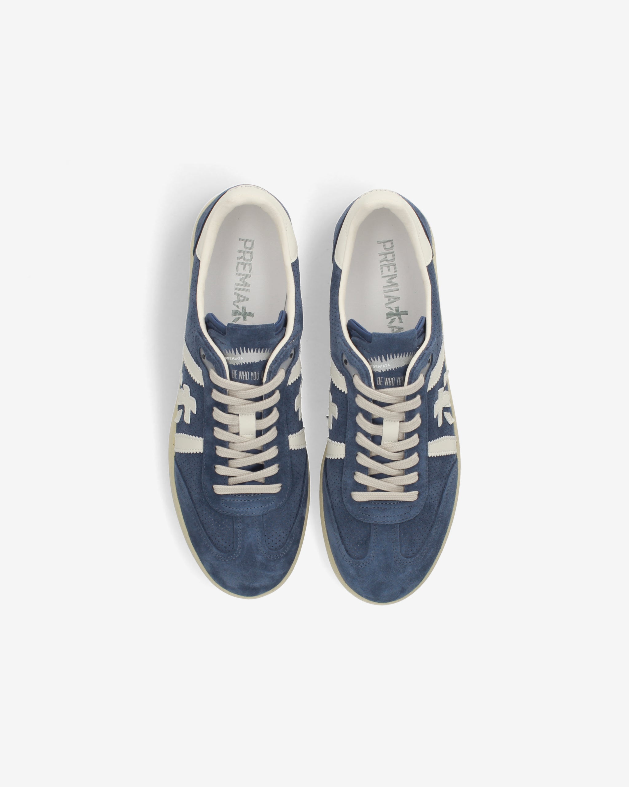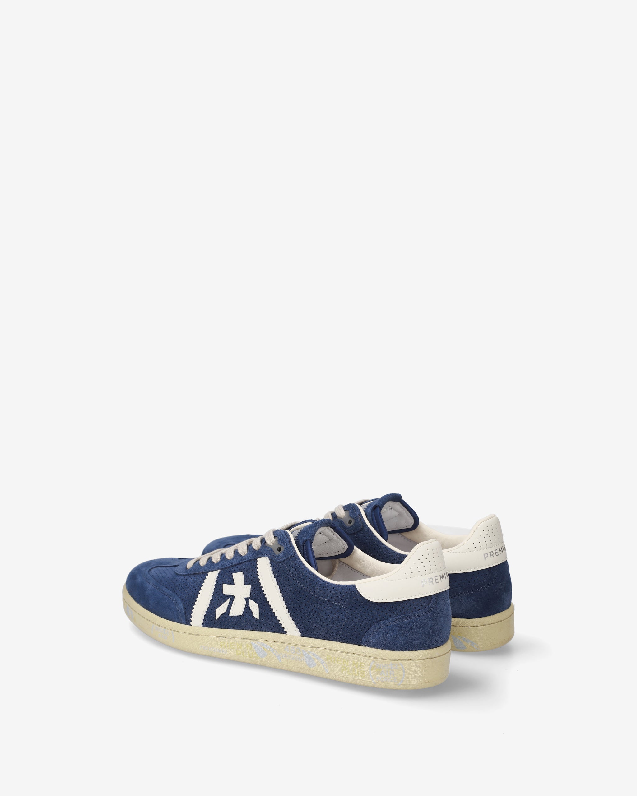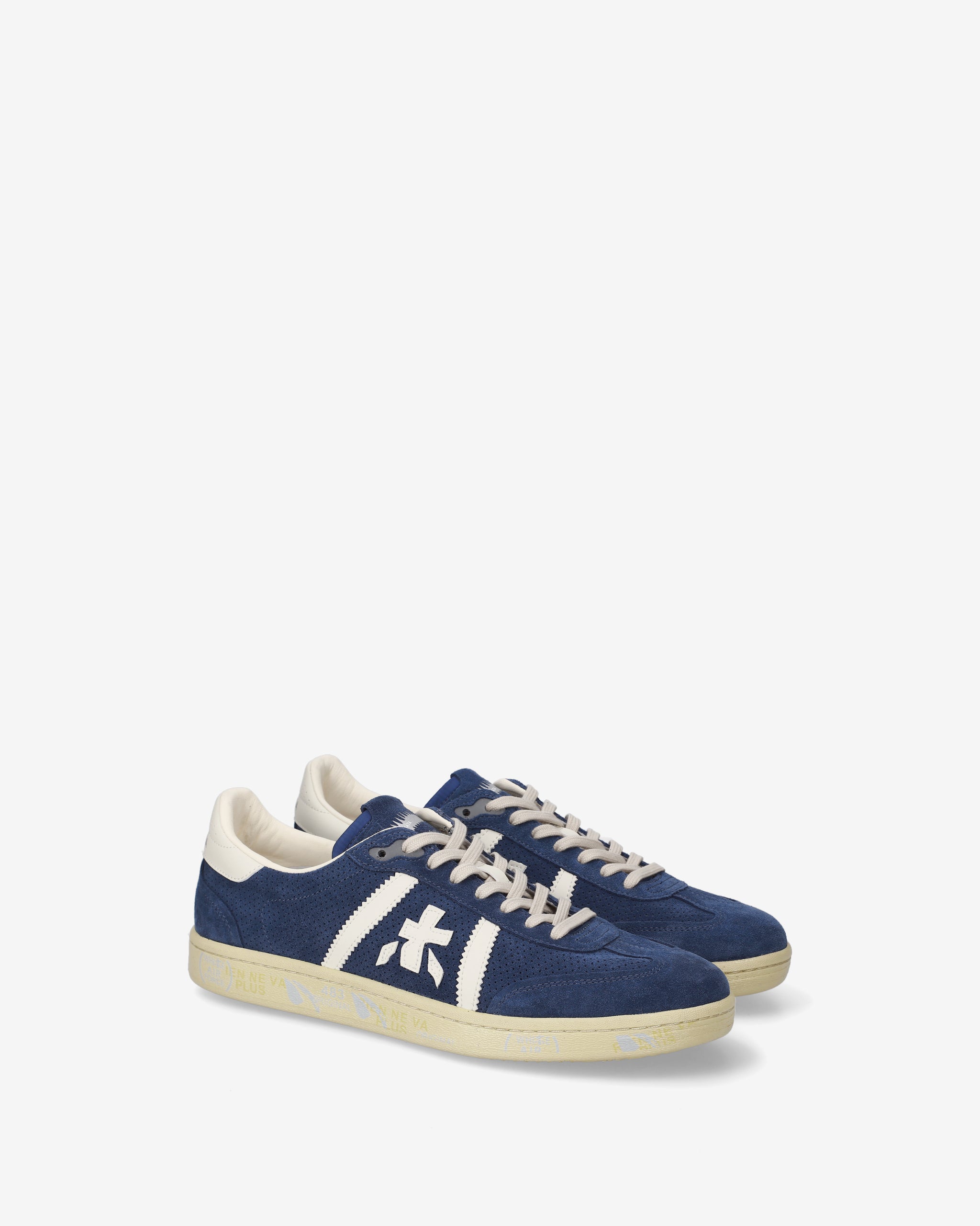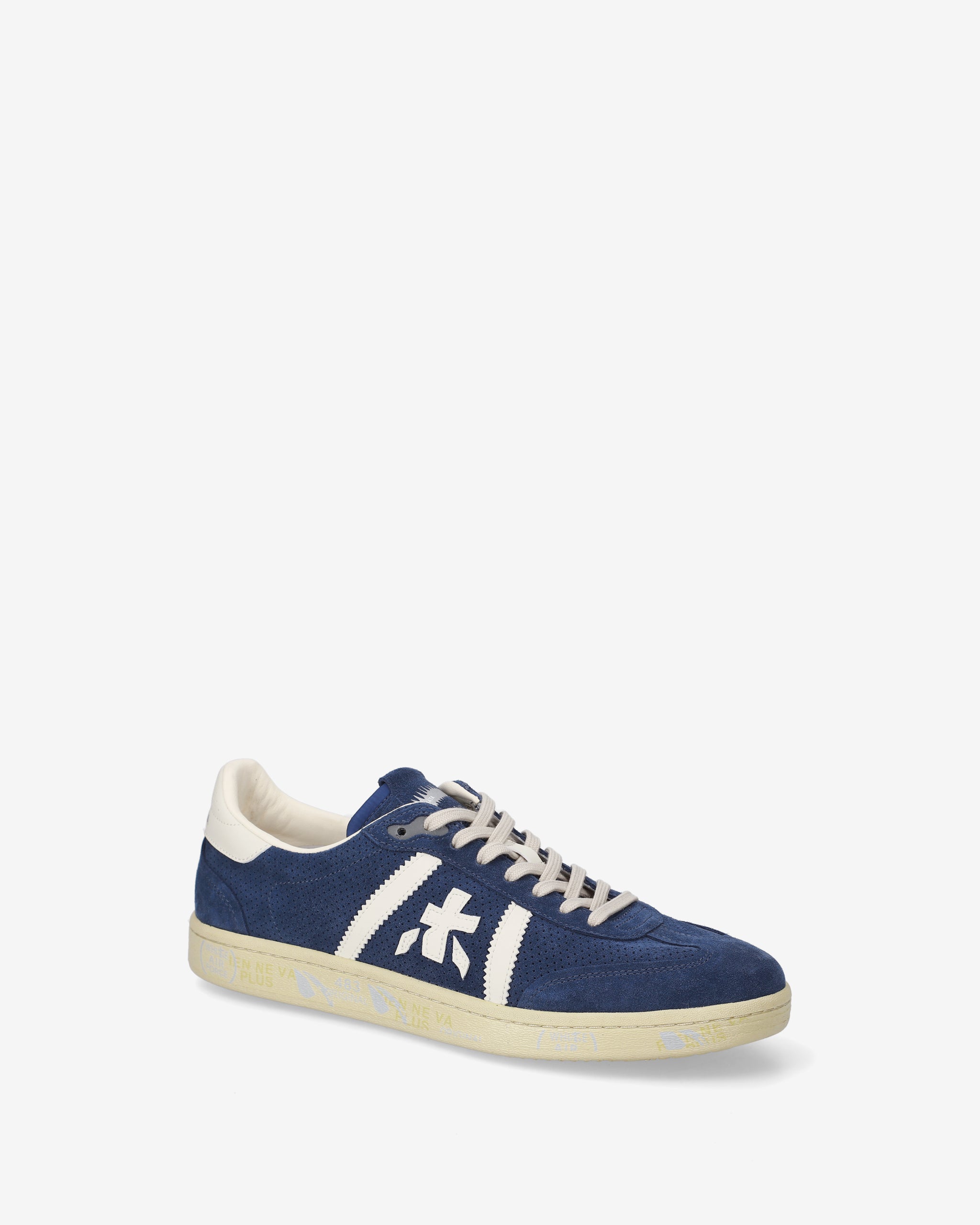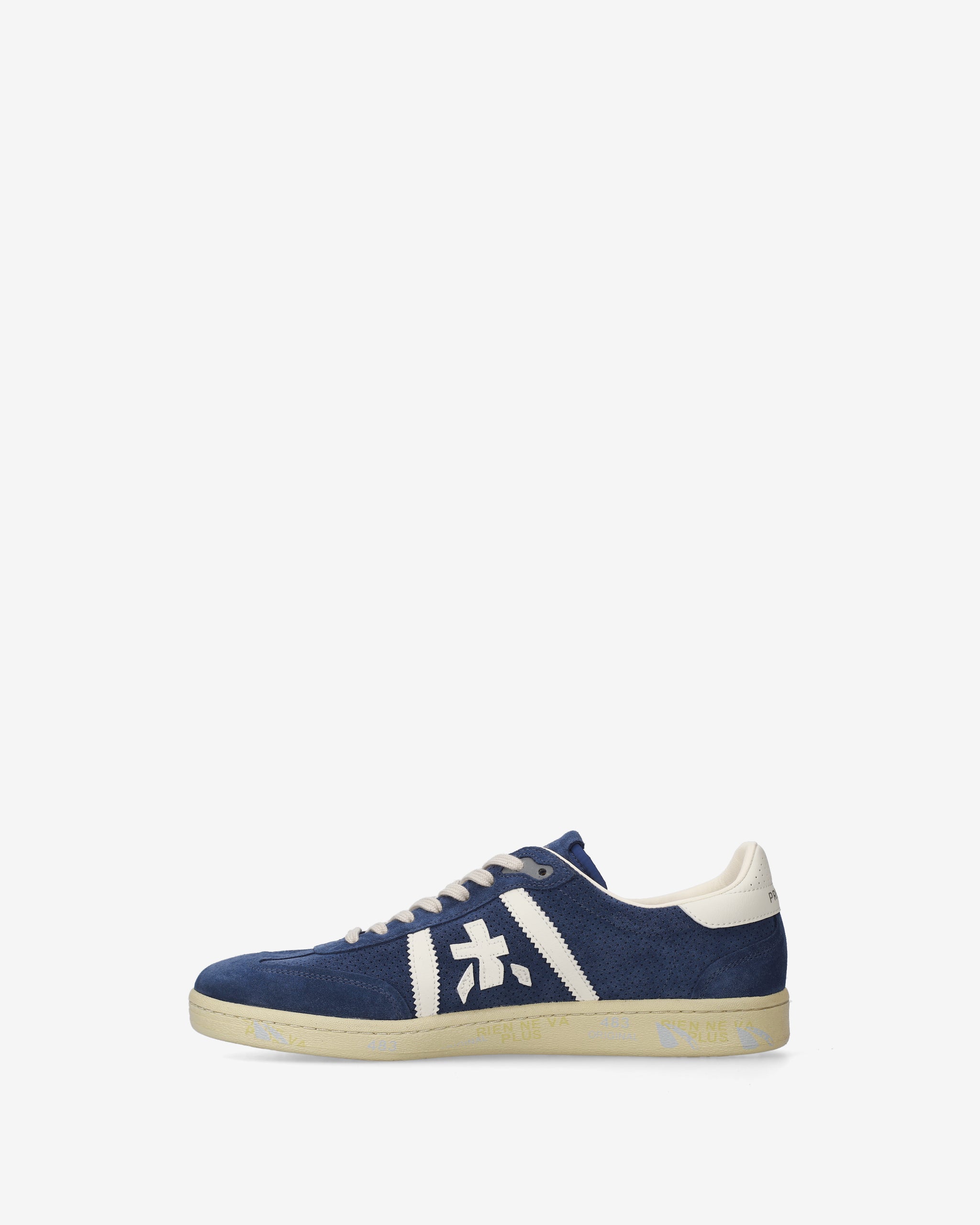 Bonnie con tomaia in suede blu, dettagli bianchi a contrasto e suola off white. Un mix di colori classici per un’estetica pulita e sofisticata.