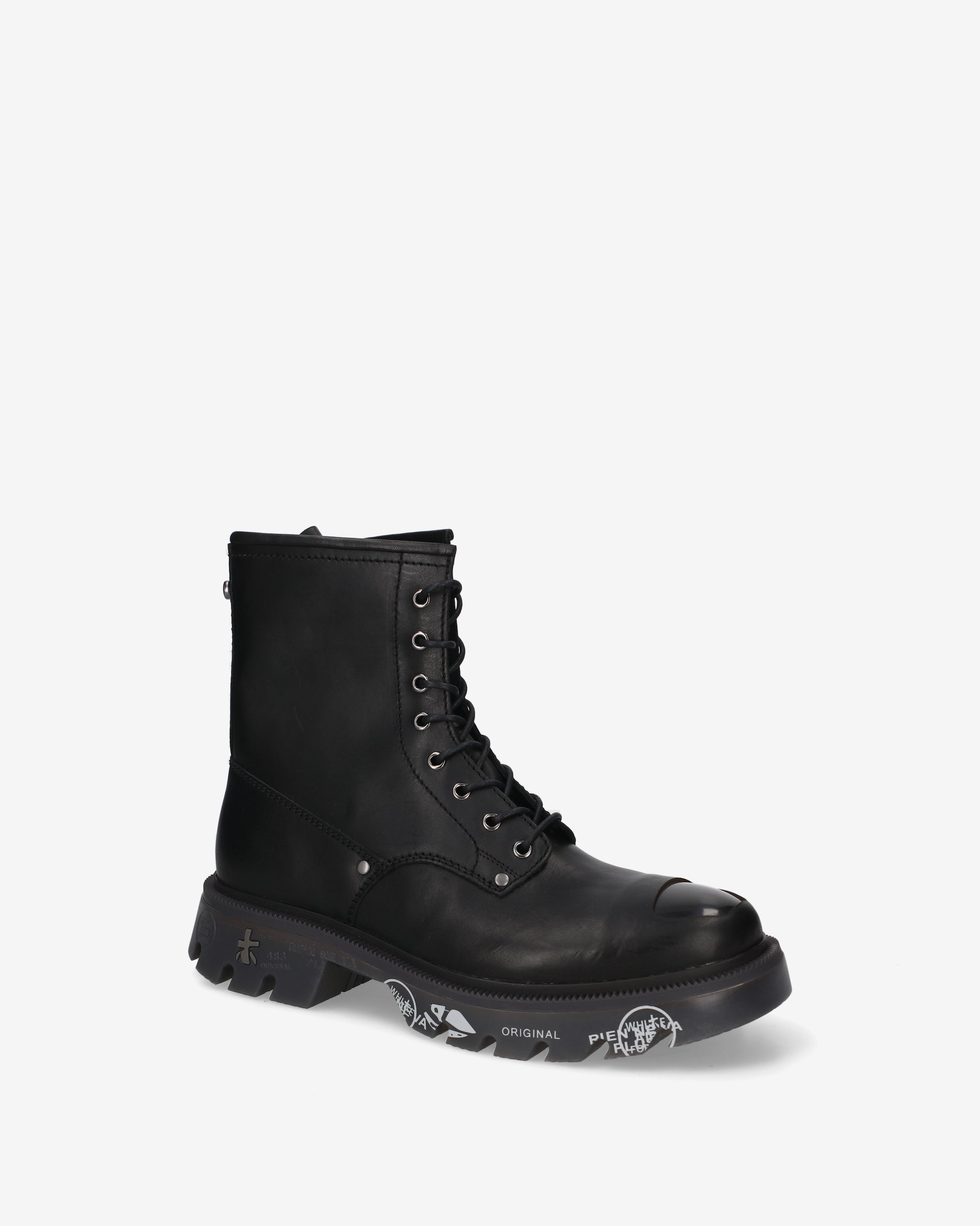 Anfibio in vitello spazzolato nero con puntale in ABS e guardolo verde militare abbinato a fondo nero. Un mix di eleganza e carattere, ispirato al mondo underground londinese.