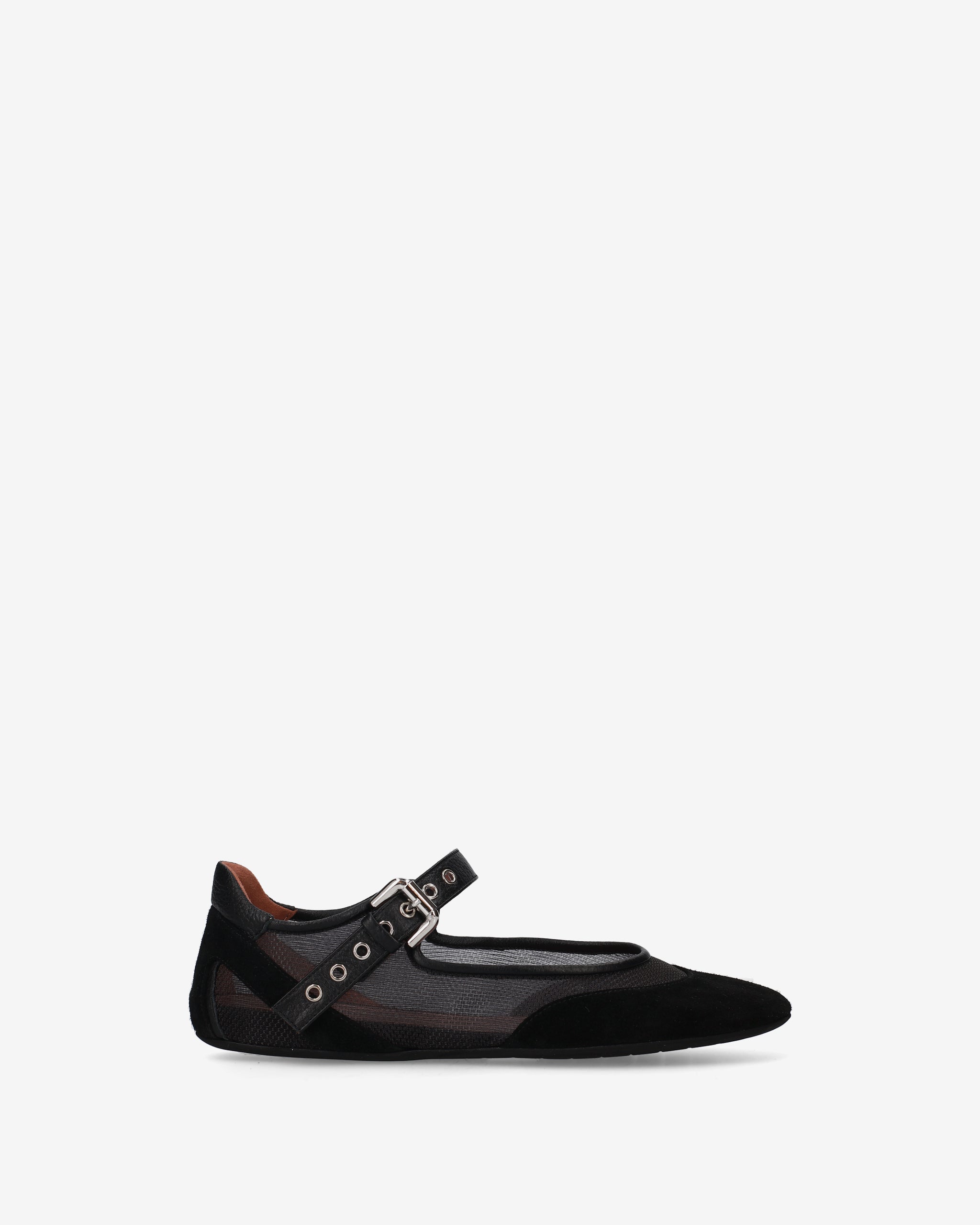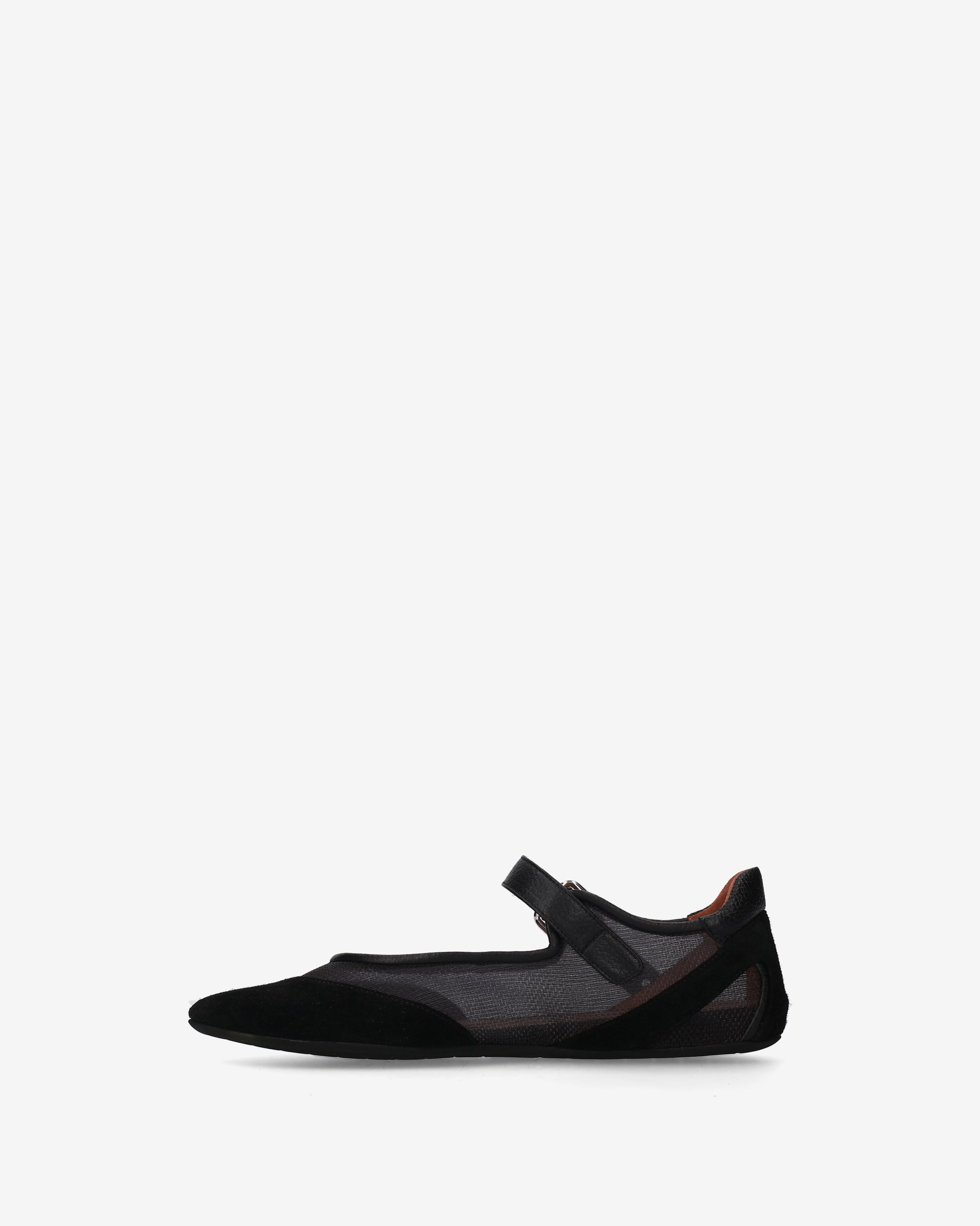 Una calzatura flat che combina l'eleganza classica della Mary Jane con un'estetica tecnica e futuristica. Il gioco di trasparenze e l'accostamento di materiali diversi creano un design dinamico e ultra-leggero