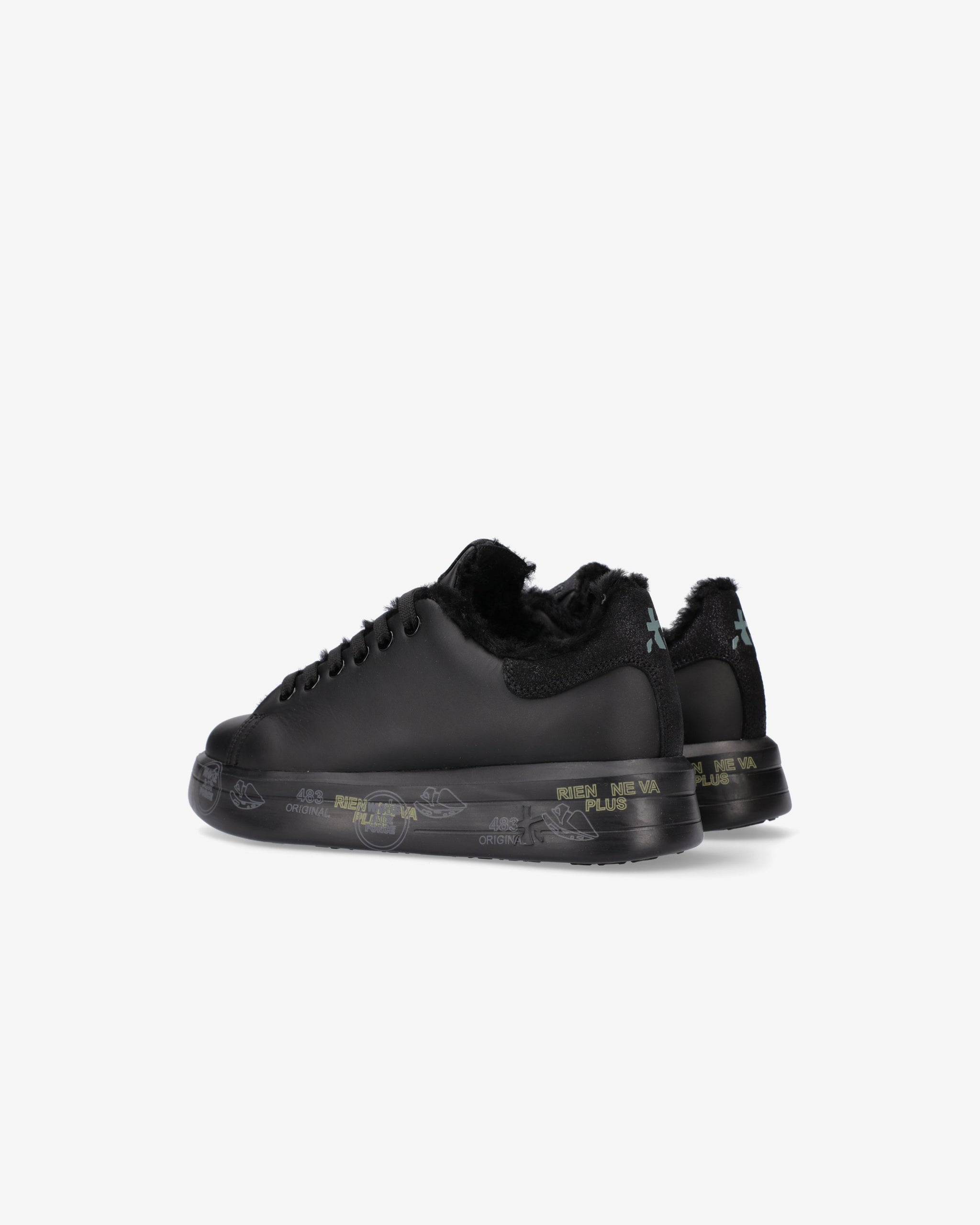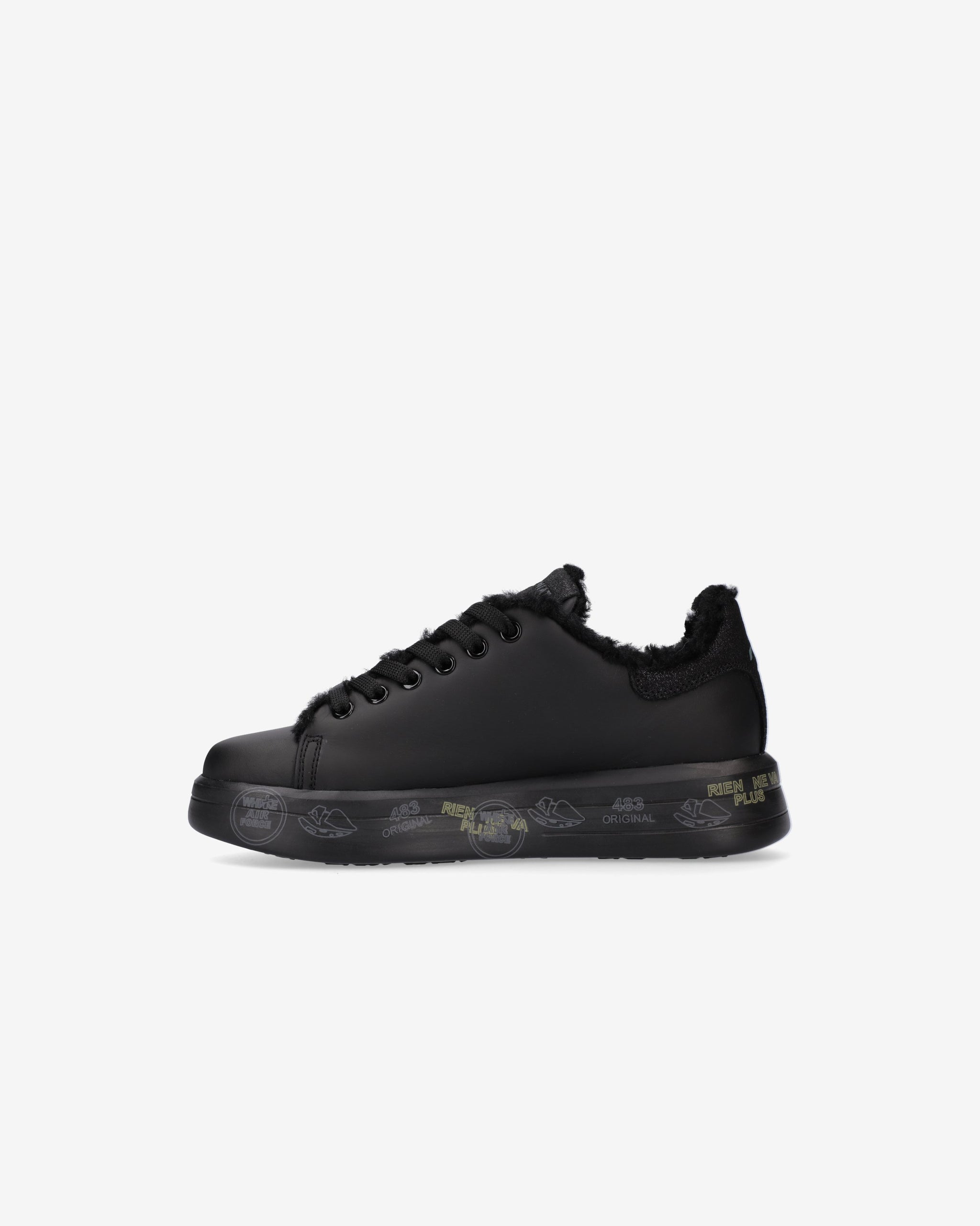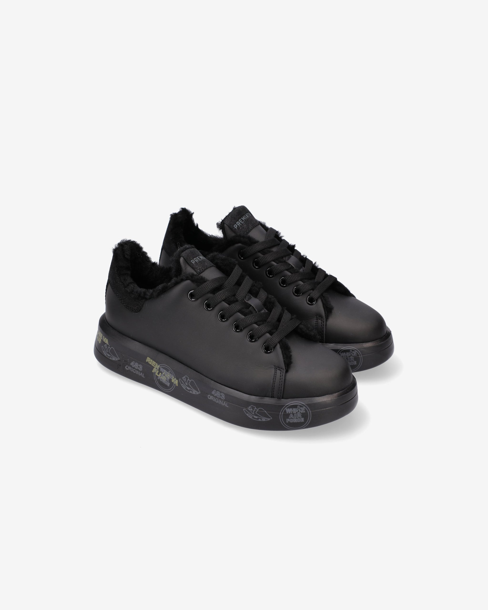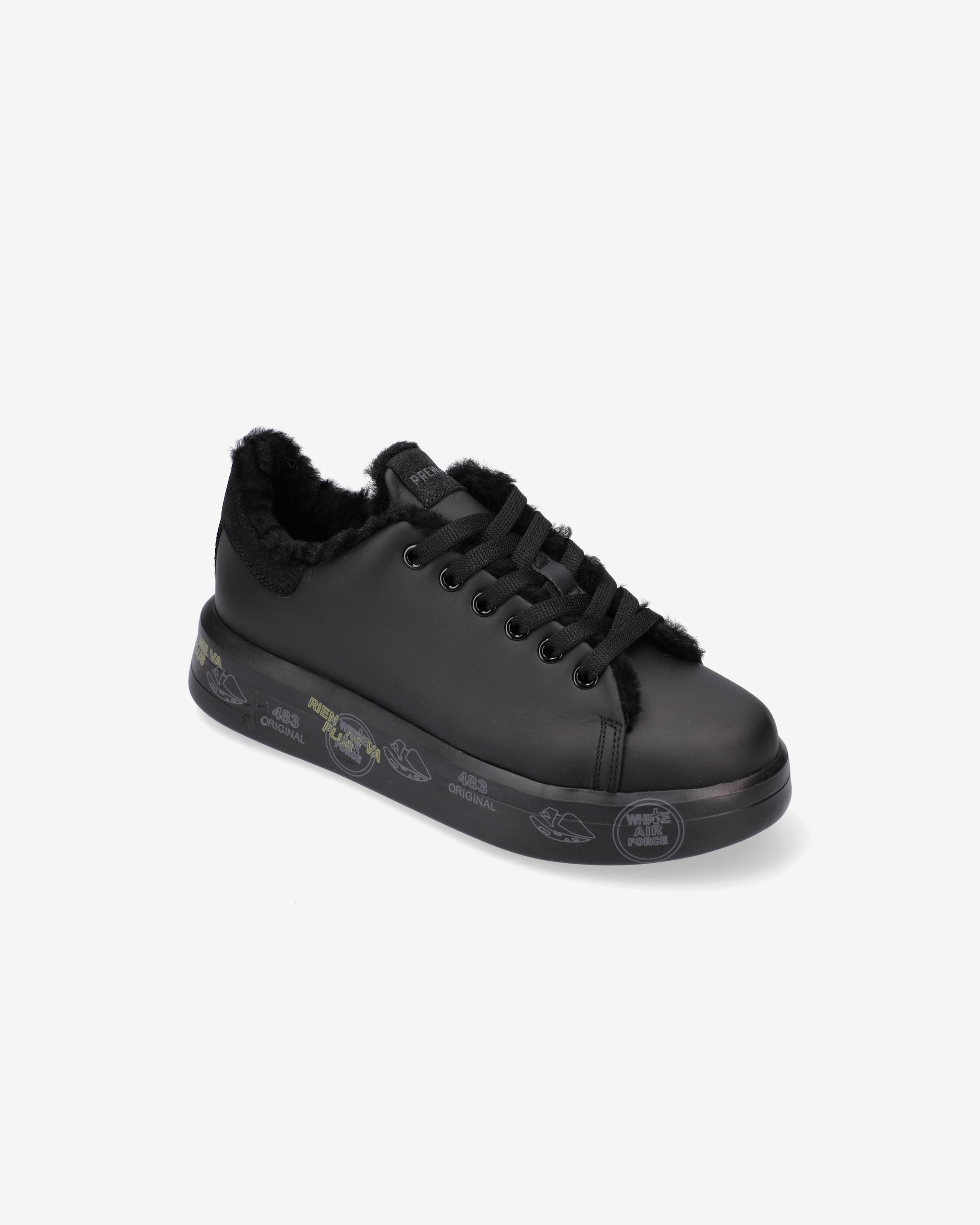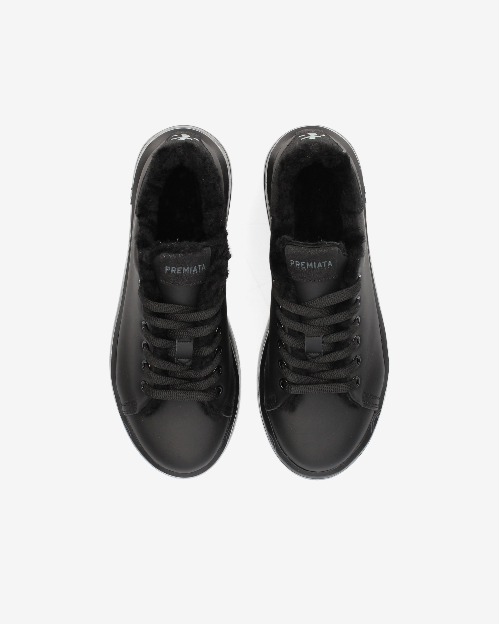 Sneakers in pelle nera foderate in montone con punta arrotondata e dettaglio ton sur ton. Logo Premiata sulla linguetta e sul tallone. Suola oversize in gomma caratterizzata dai leggendari timbri che contraddistinguono l'unicità del Brand.