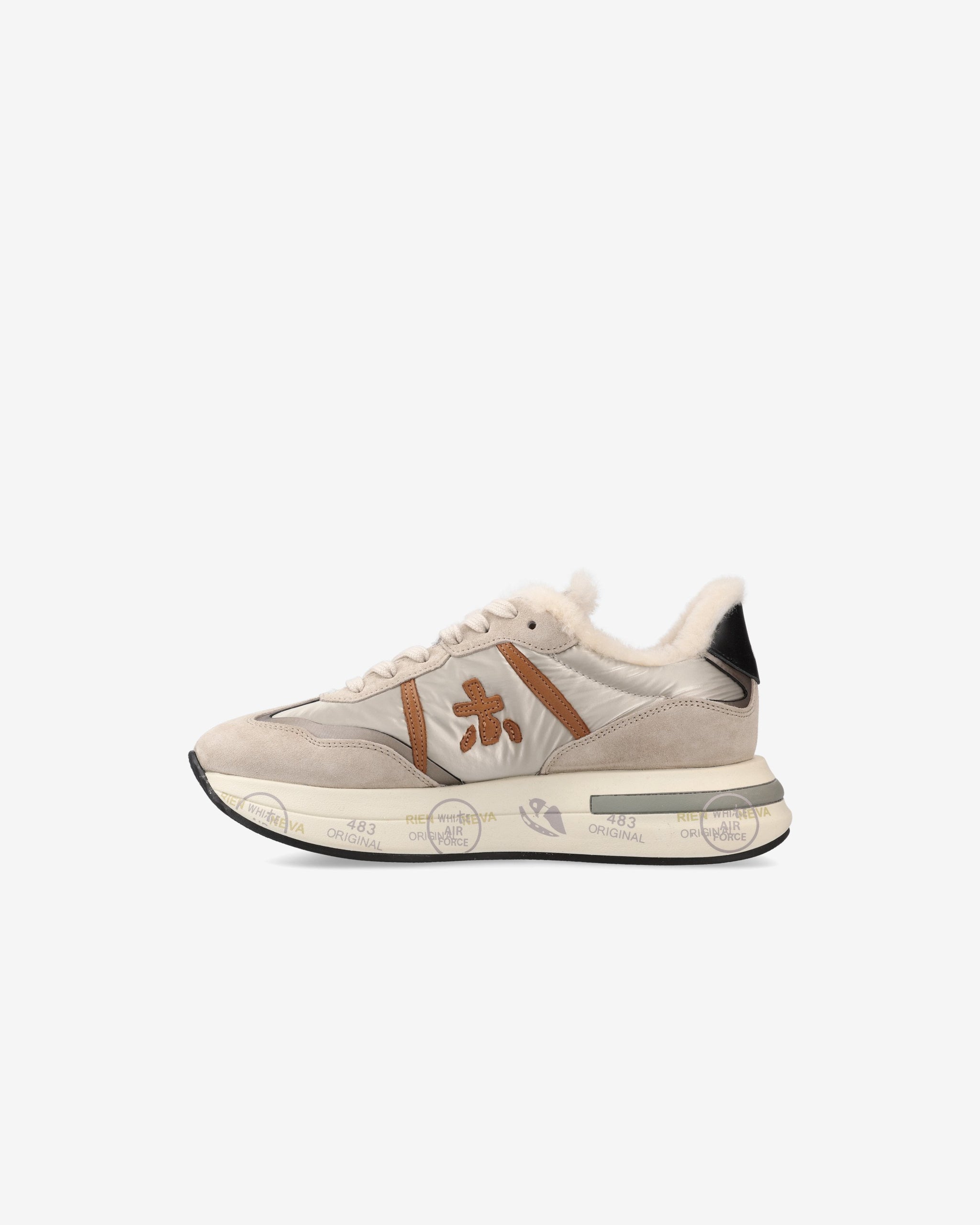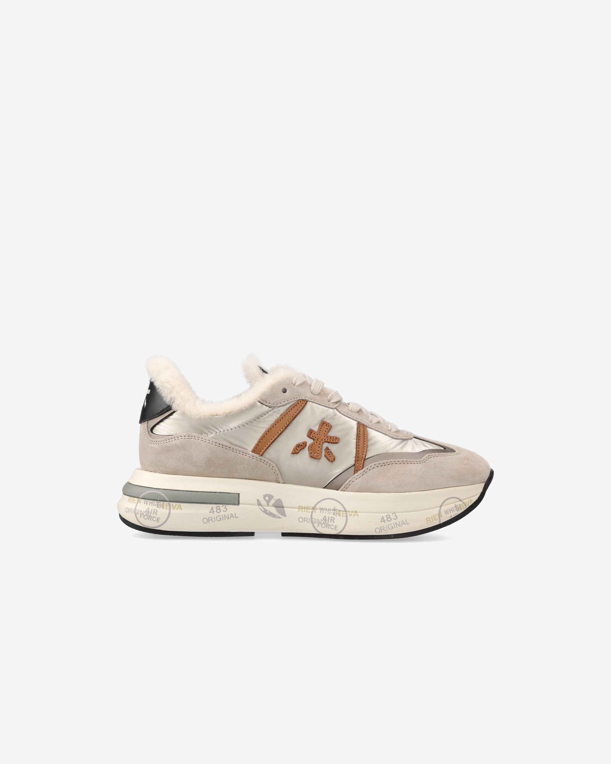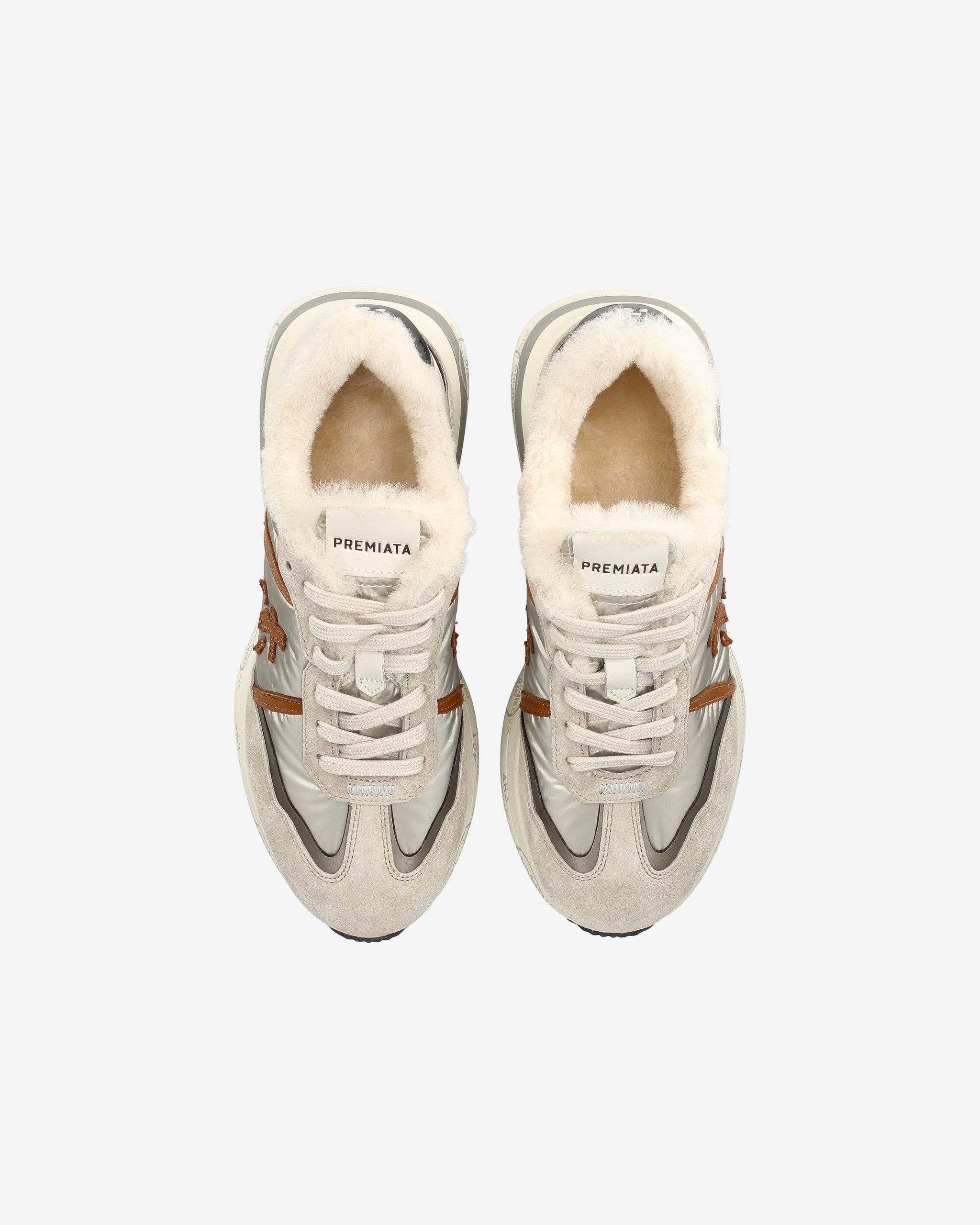 Sneaker Premiata in pelle scamosciata con tonalità grigie. Logo laterale a croce stilizzata, lacci in tinta e suola bianca con i distintivi timbri del brand. Design tecnico e contemporaneo, perfetto per uno stile urbano ricercato.