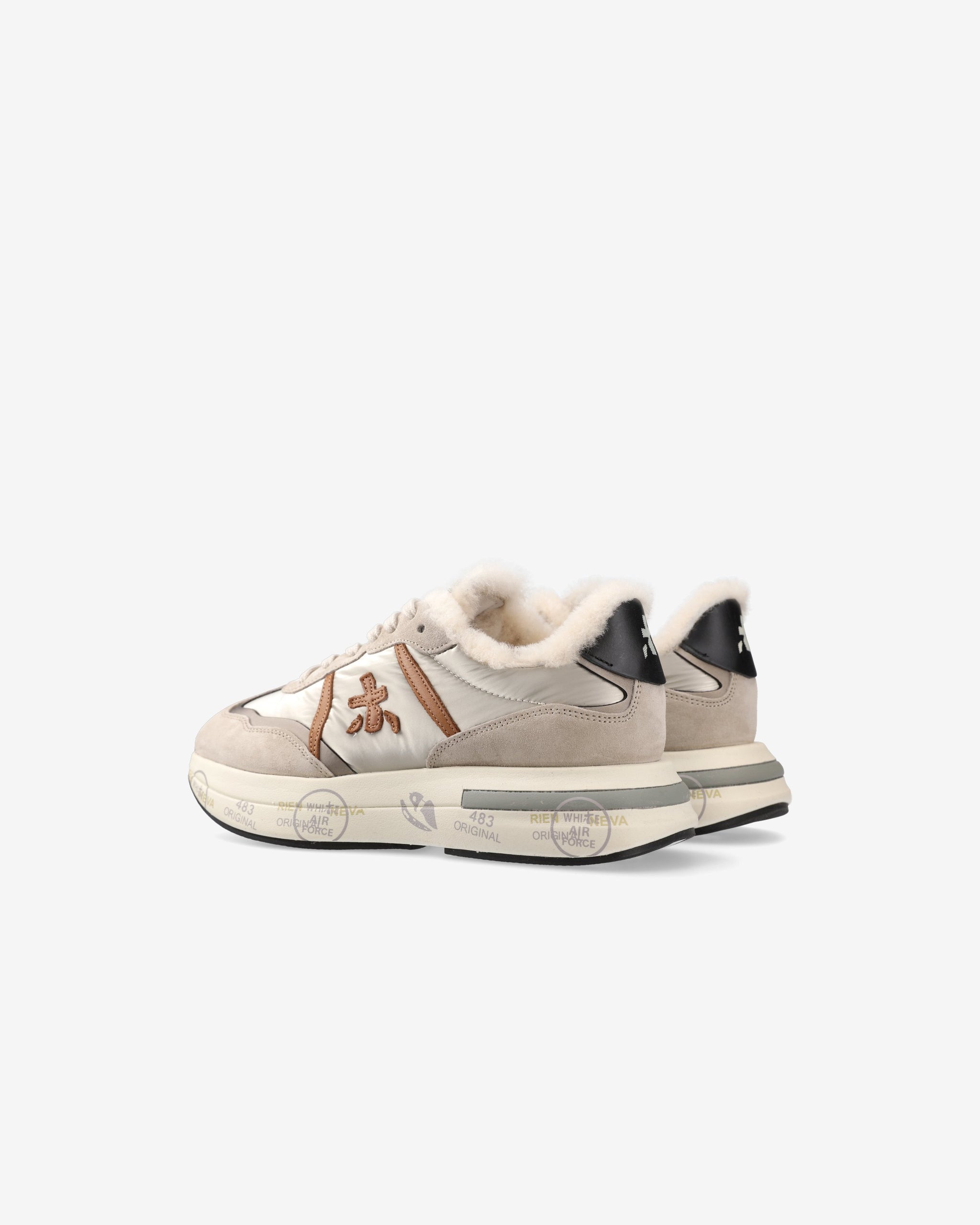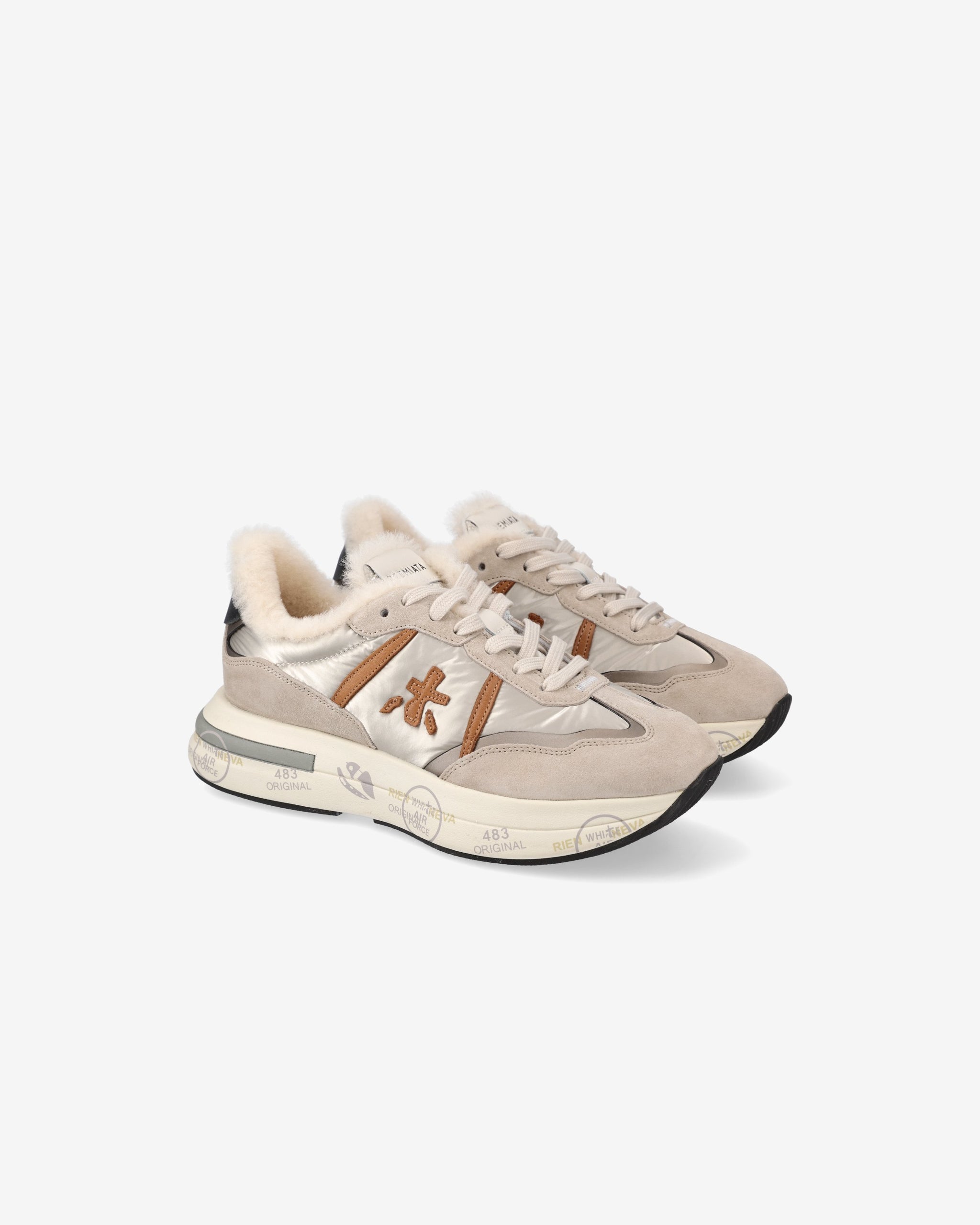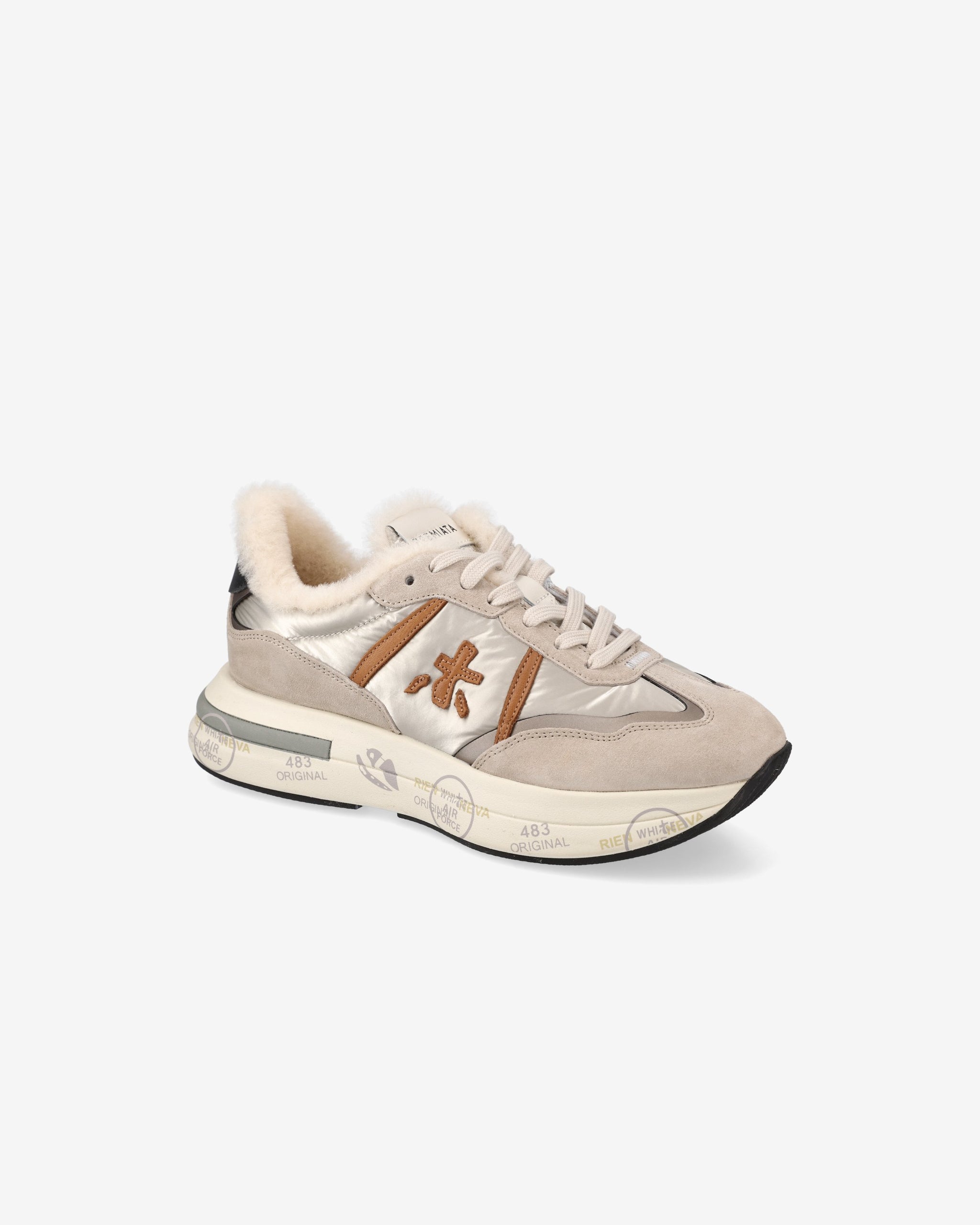 Sneaker Premiata in pelle scamosciata con tonalità grigie. Logo laterale a croce stilizzata, lacci in tinta e suola bianca con i distintivi timbri del brand. Design tecnico e contemporaneo, perfetto per uno stile urbano ricercato.