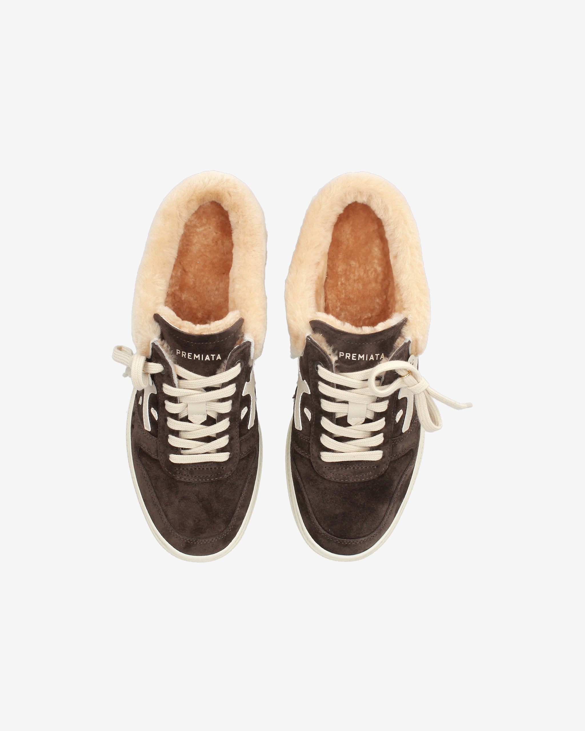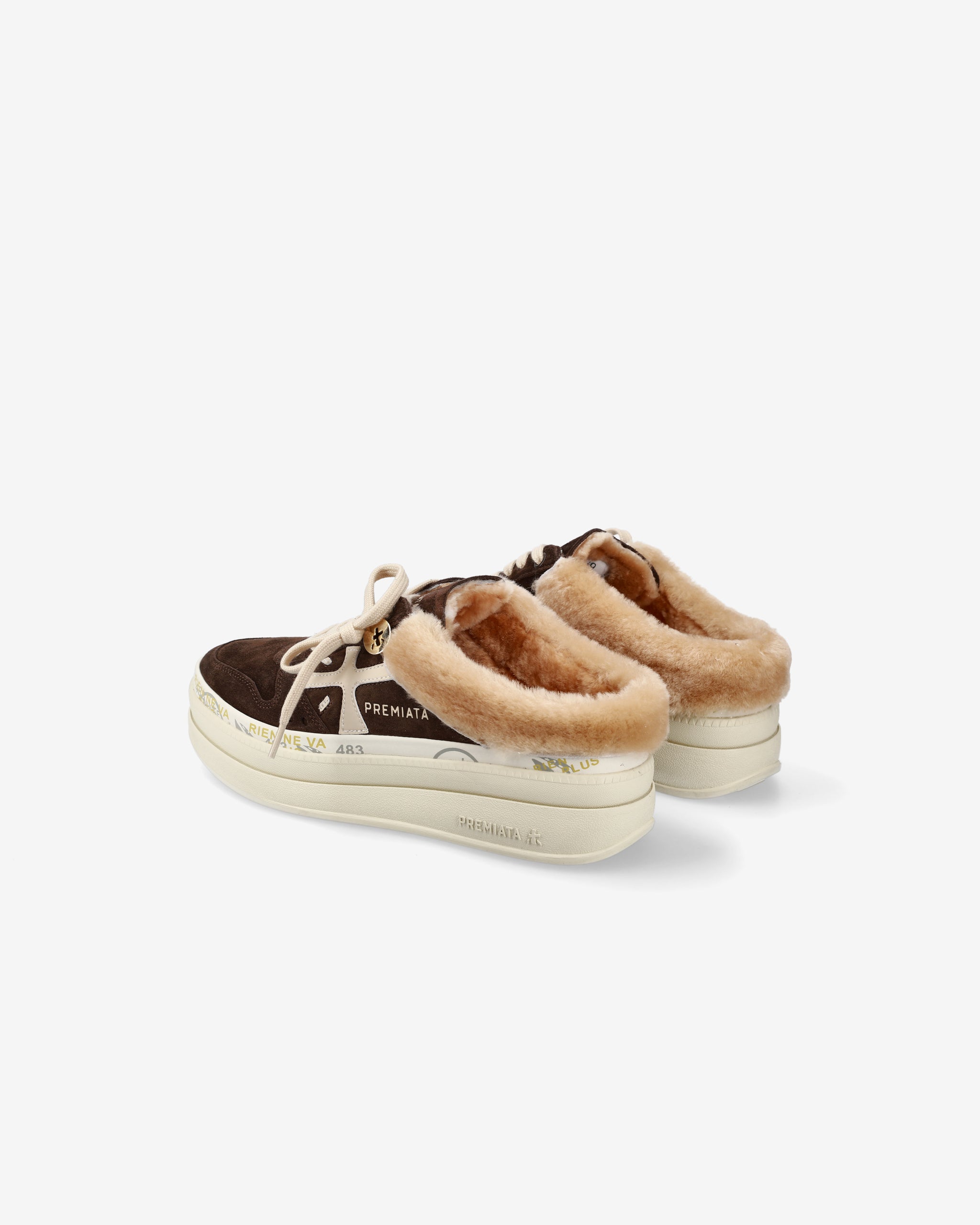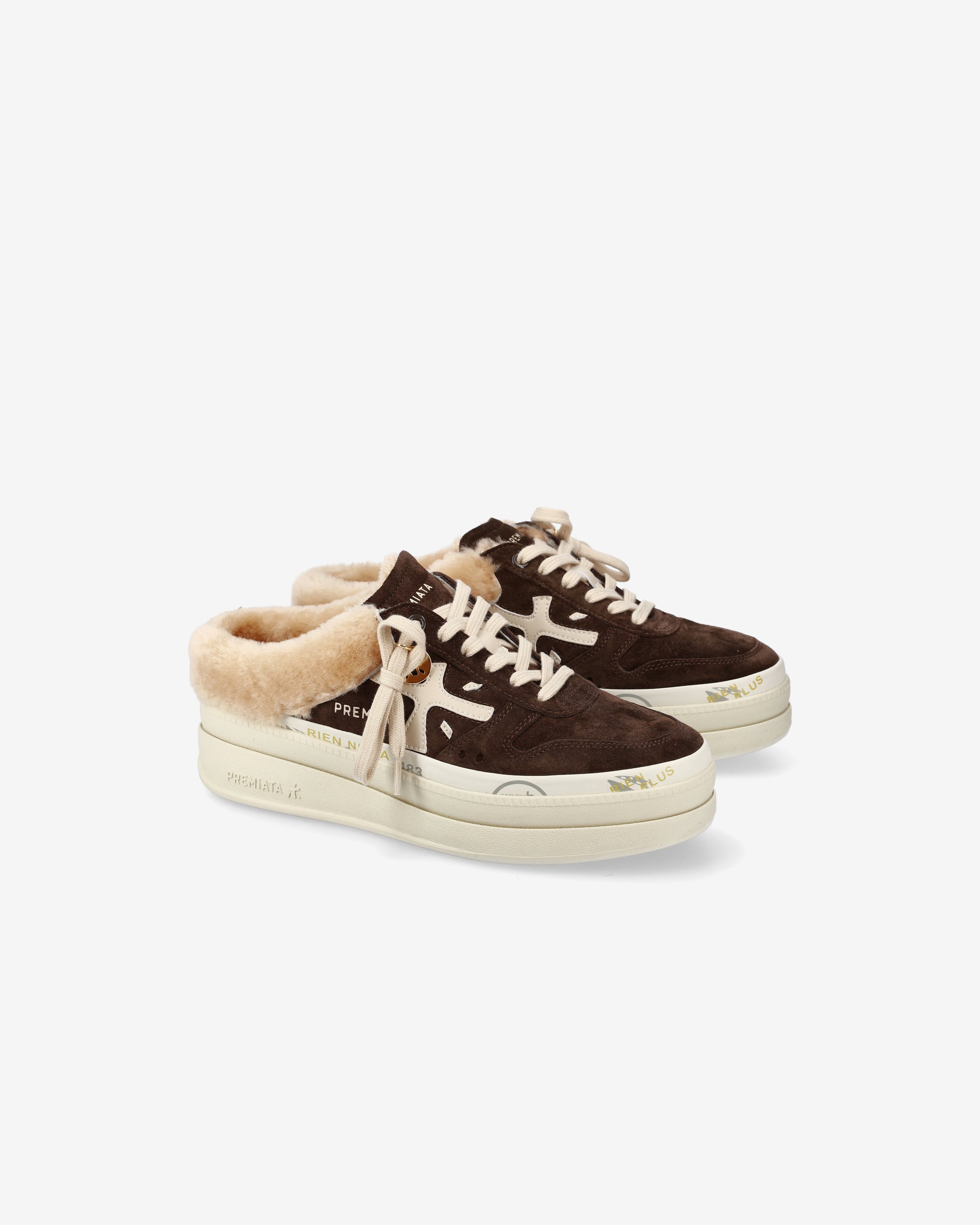 Tra i nuovi must have di Premiata. Lo stile raggiunge nuove vette, unendo design come la suola platform doppio strato con un’intersuola impreziosita dagli iconici timbri del brand e l'interno foderato in montone.