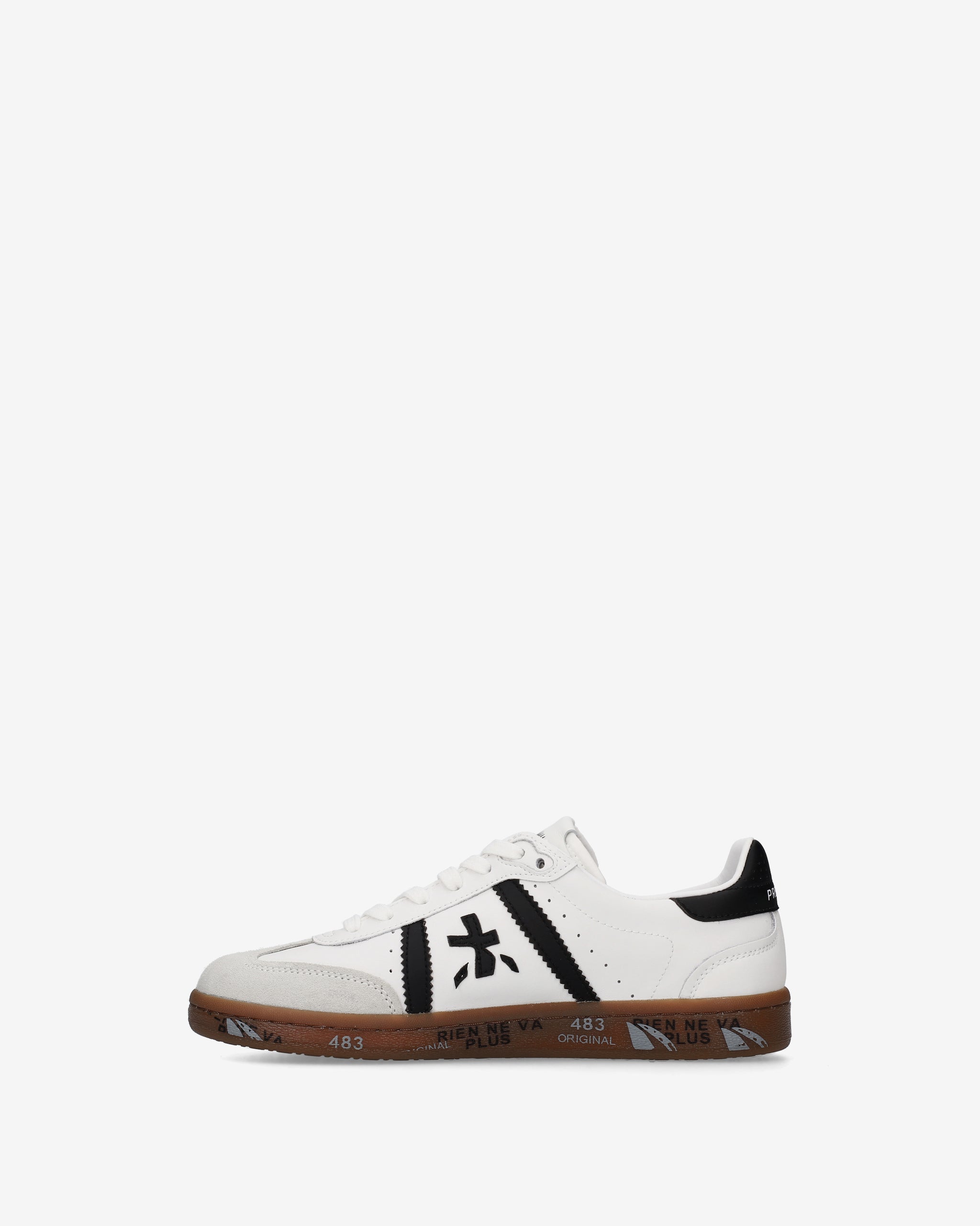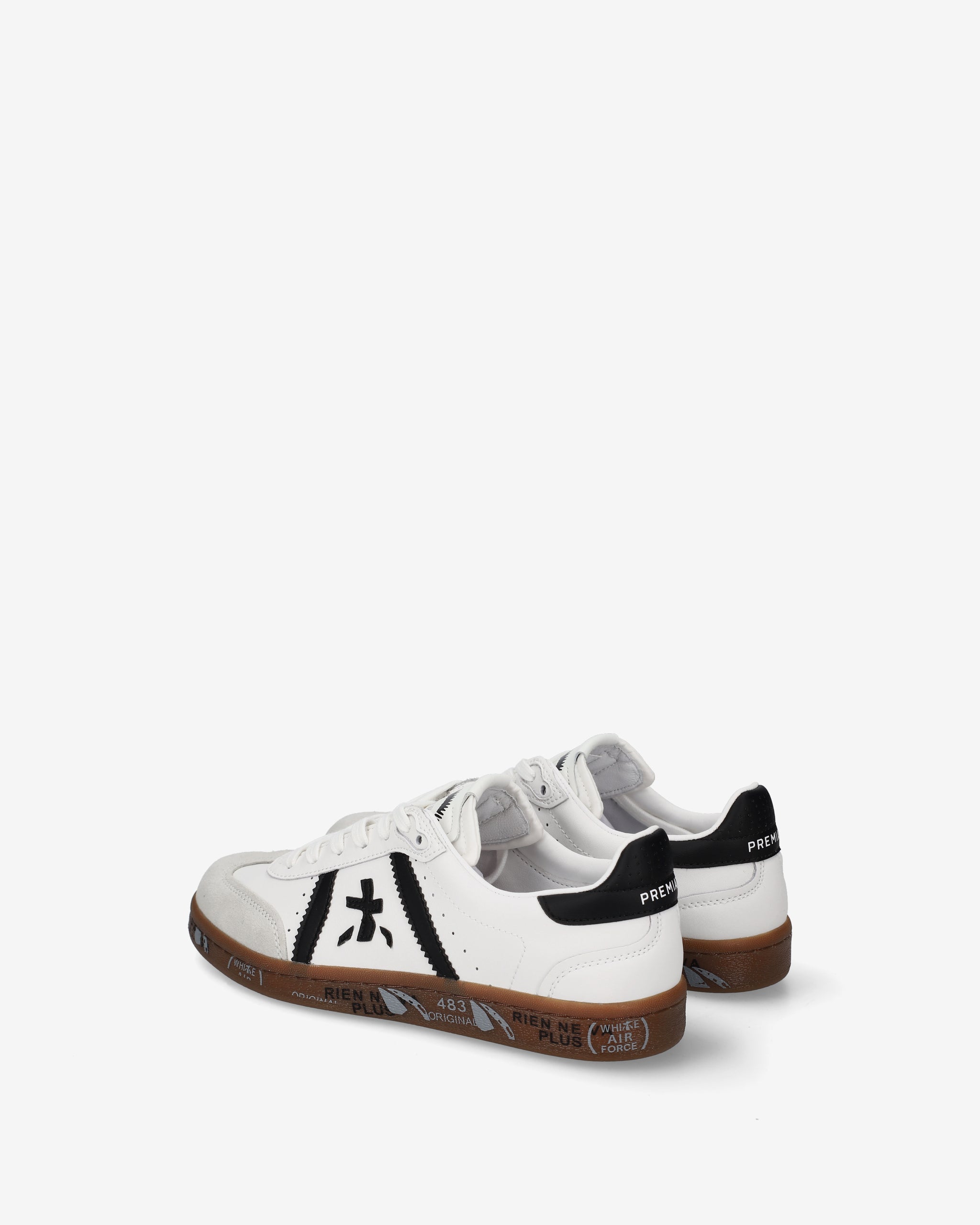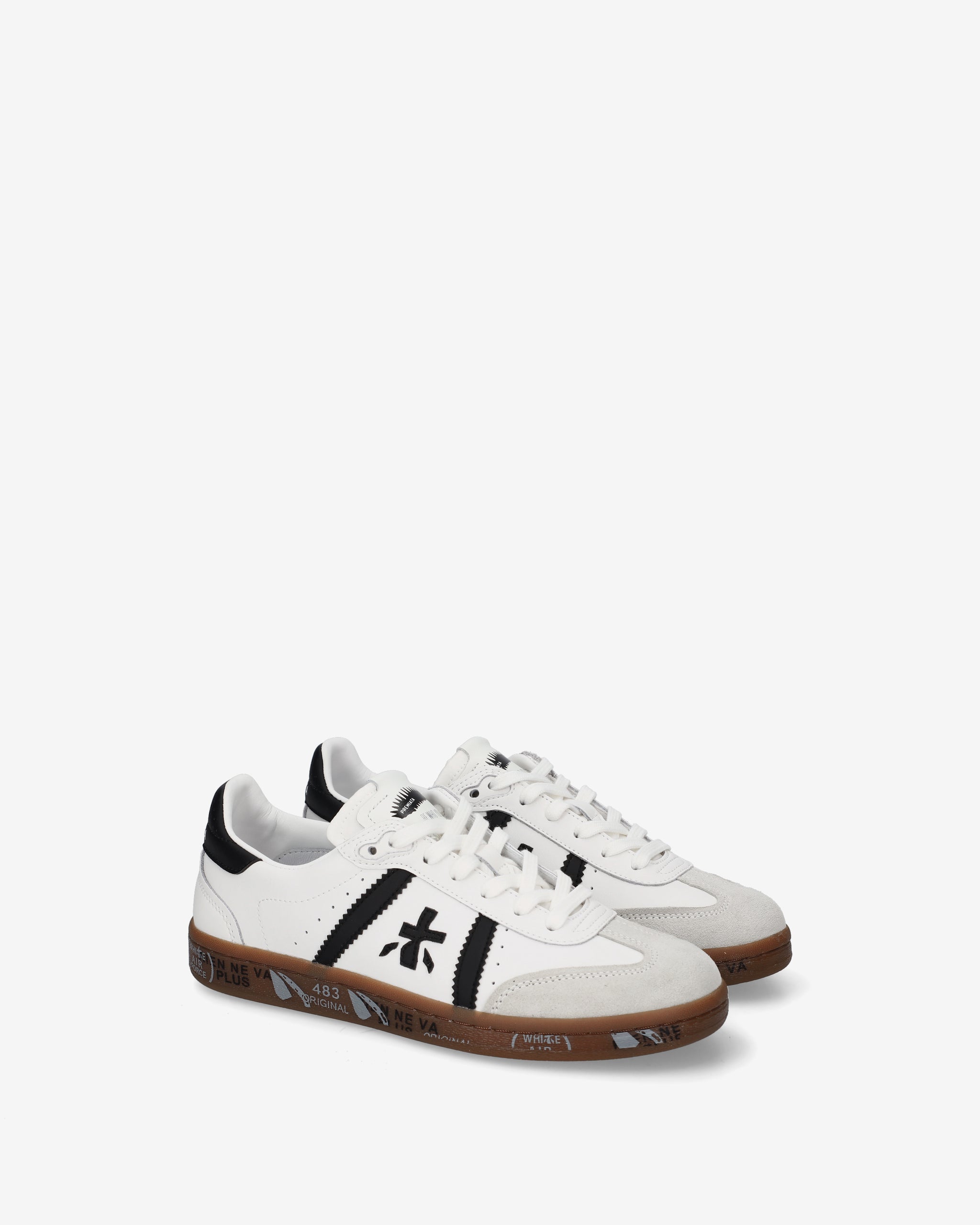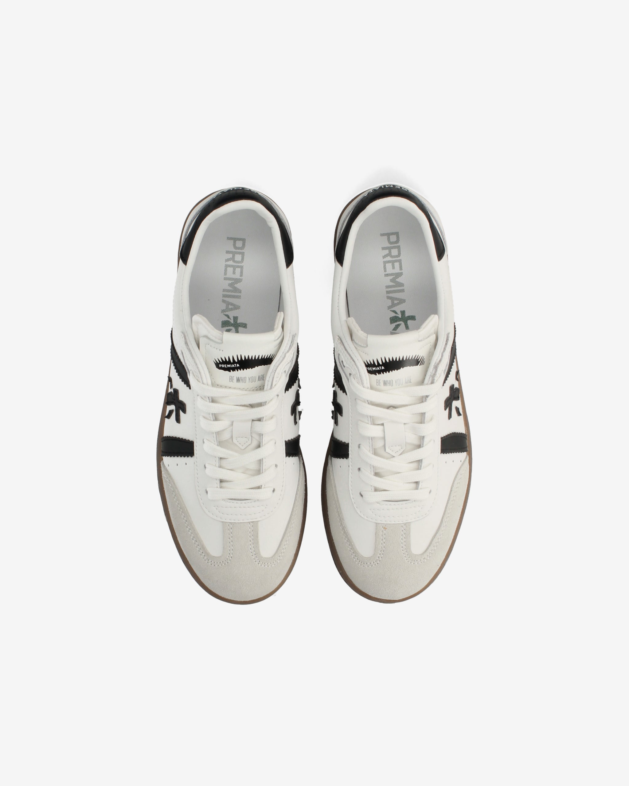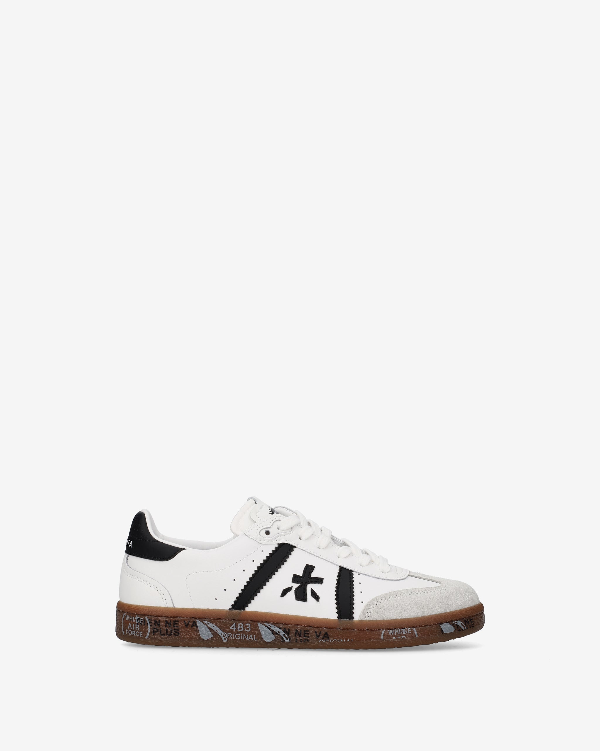Bonnie con tomaia in pelle bianca, dettagli neri a contrasto e suola gum. Un mix di colori classici per un’estetica pulita e sofisticata.