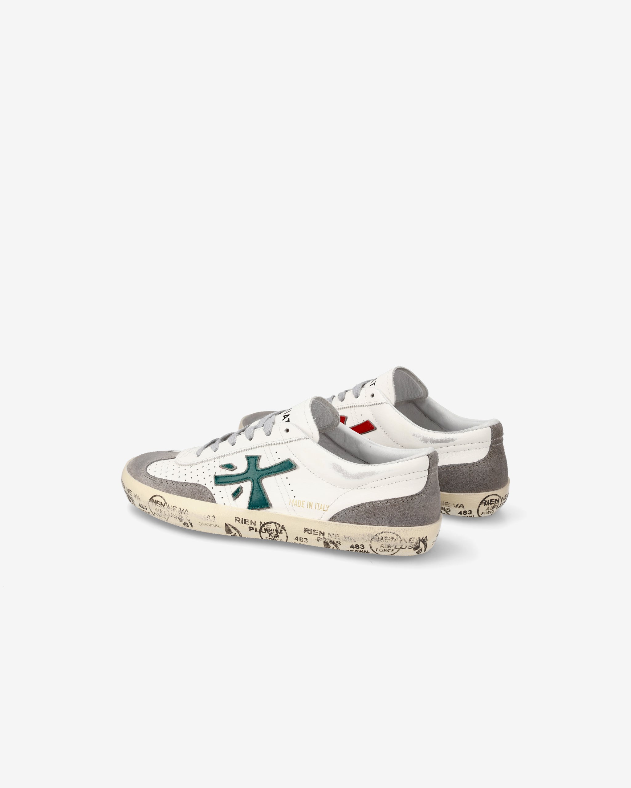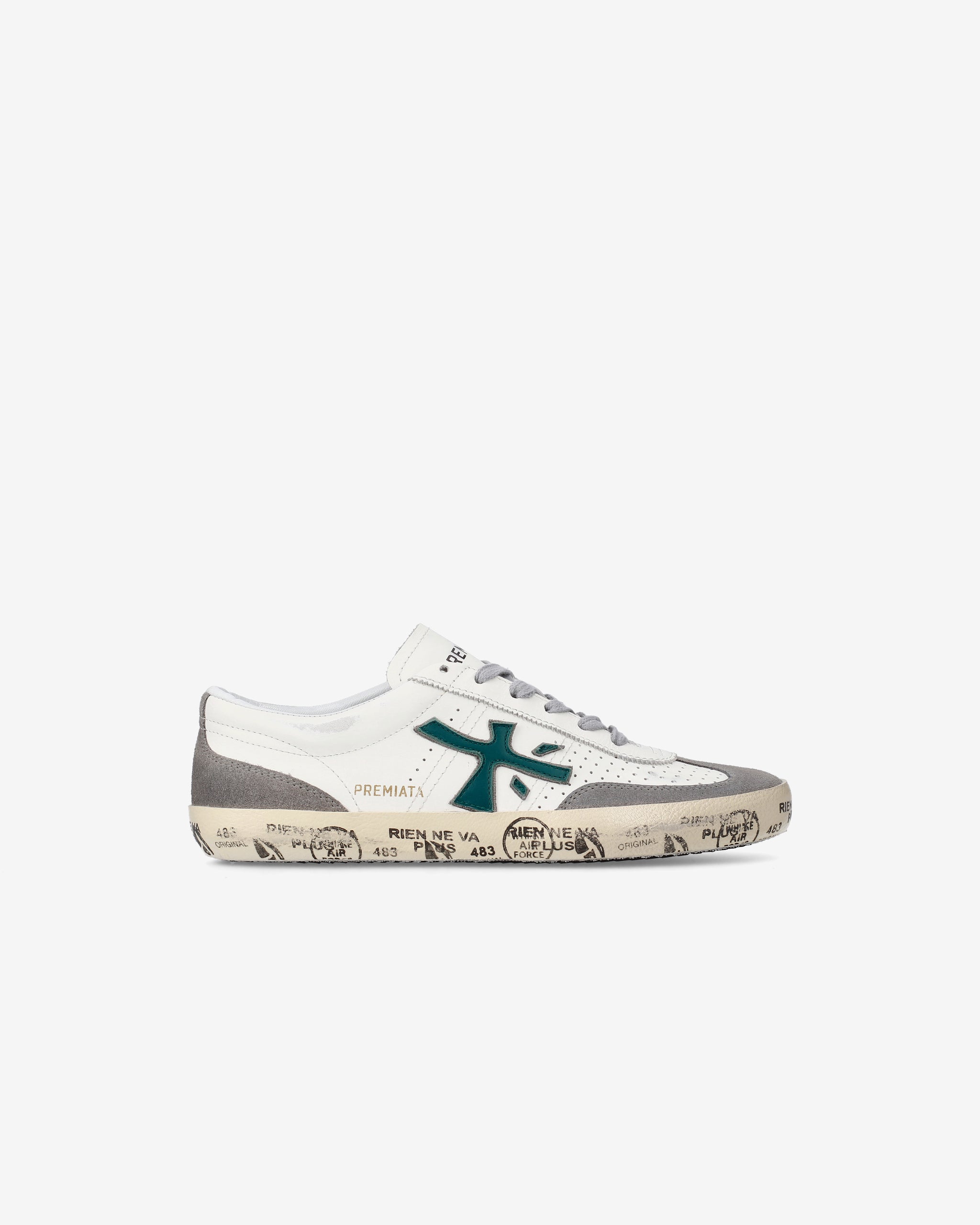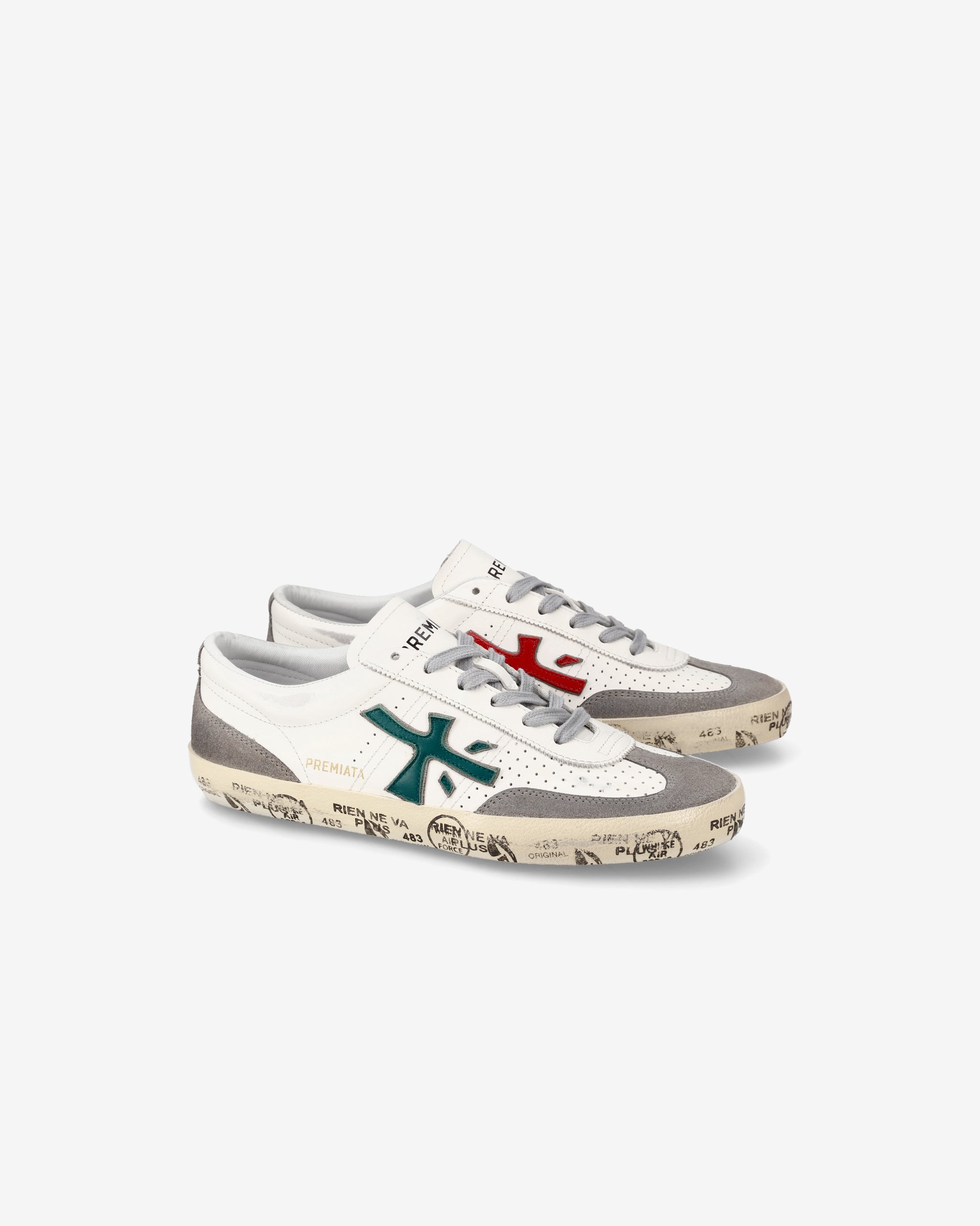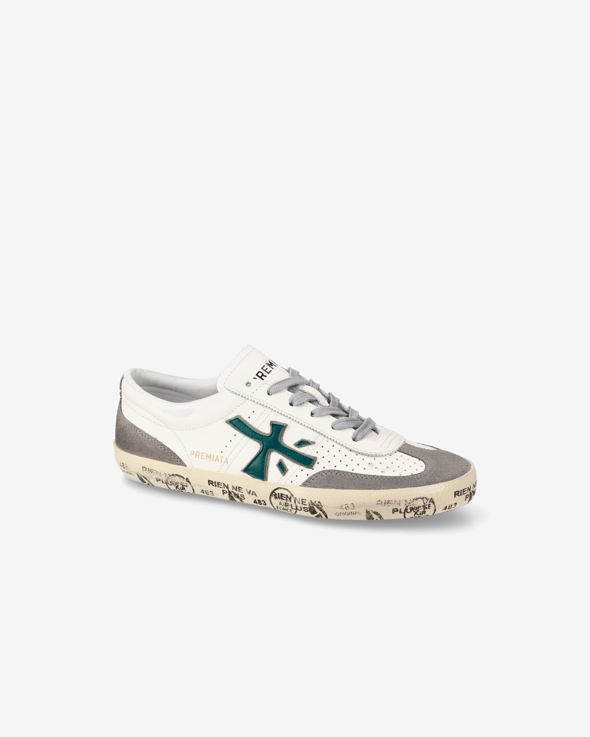 Sneakers dallo stile urbano con tomaia in pelle e pelle scamosciata, logo laterale verde scuro e suola in gomma con timbri decorativi. I lacci grigi completano il look casual e raffinato, perfetta per ogni giorno.