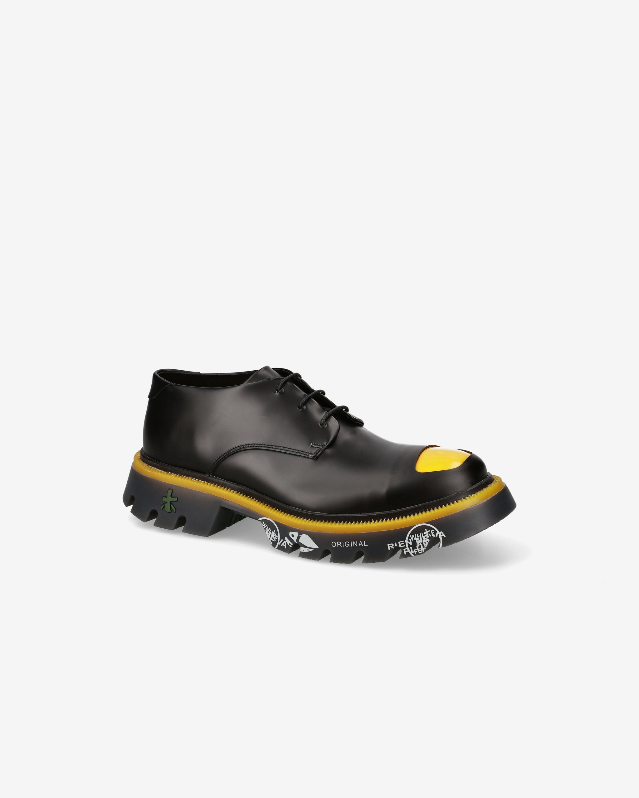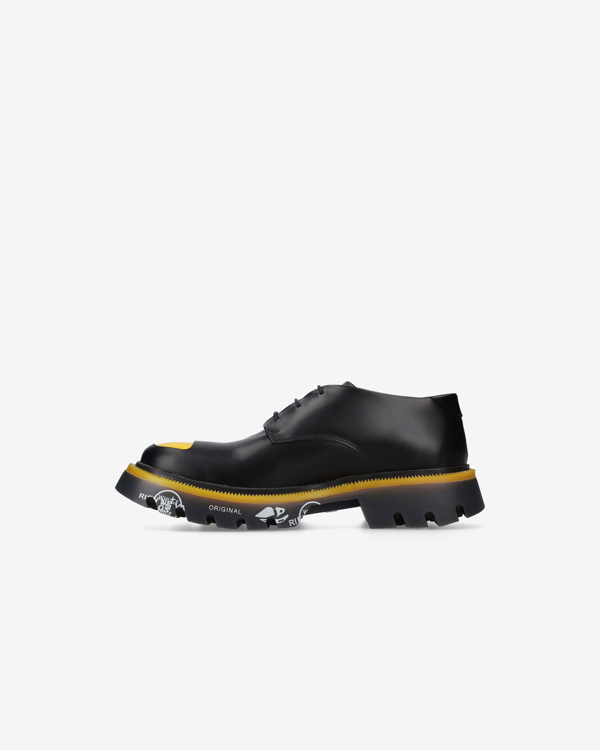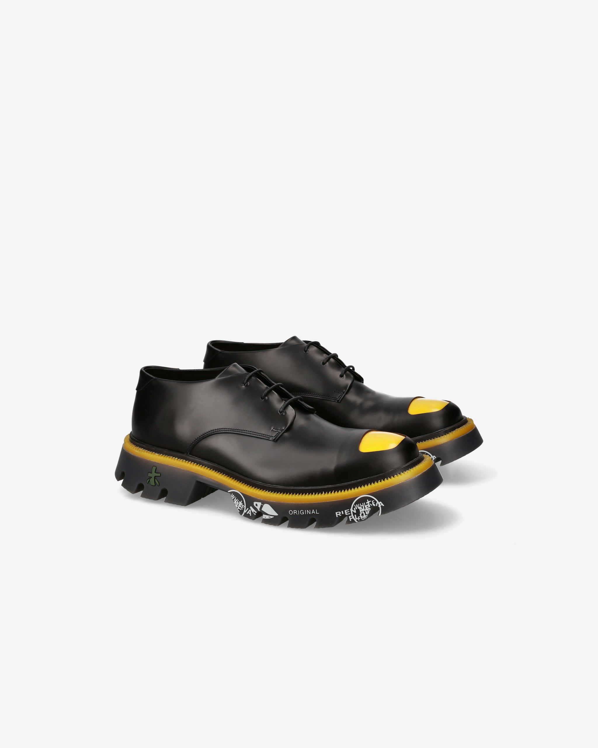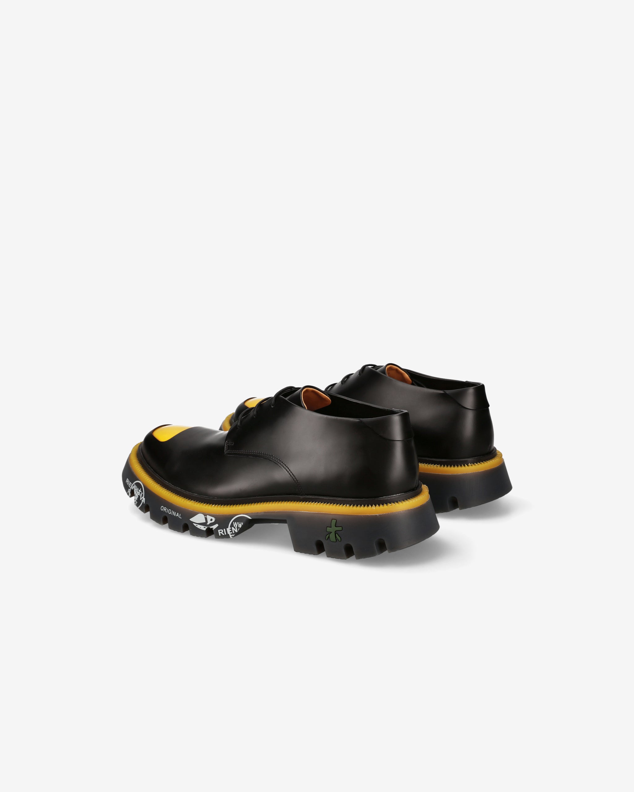 Derby in vitello con puntale in ABS, guardolo in contrasto color girasole e fondo traslucido nero con logo verde olive. Un mix audace di dettagli classici e accenti contemporanei, ispirato allo stile underground londinese.
