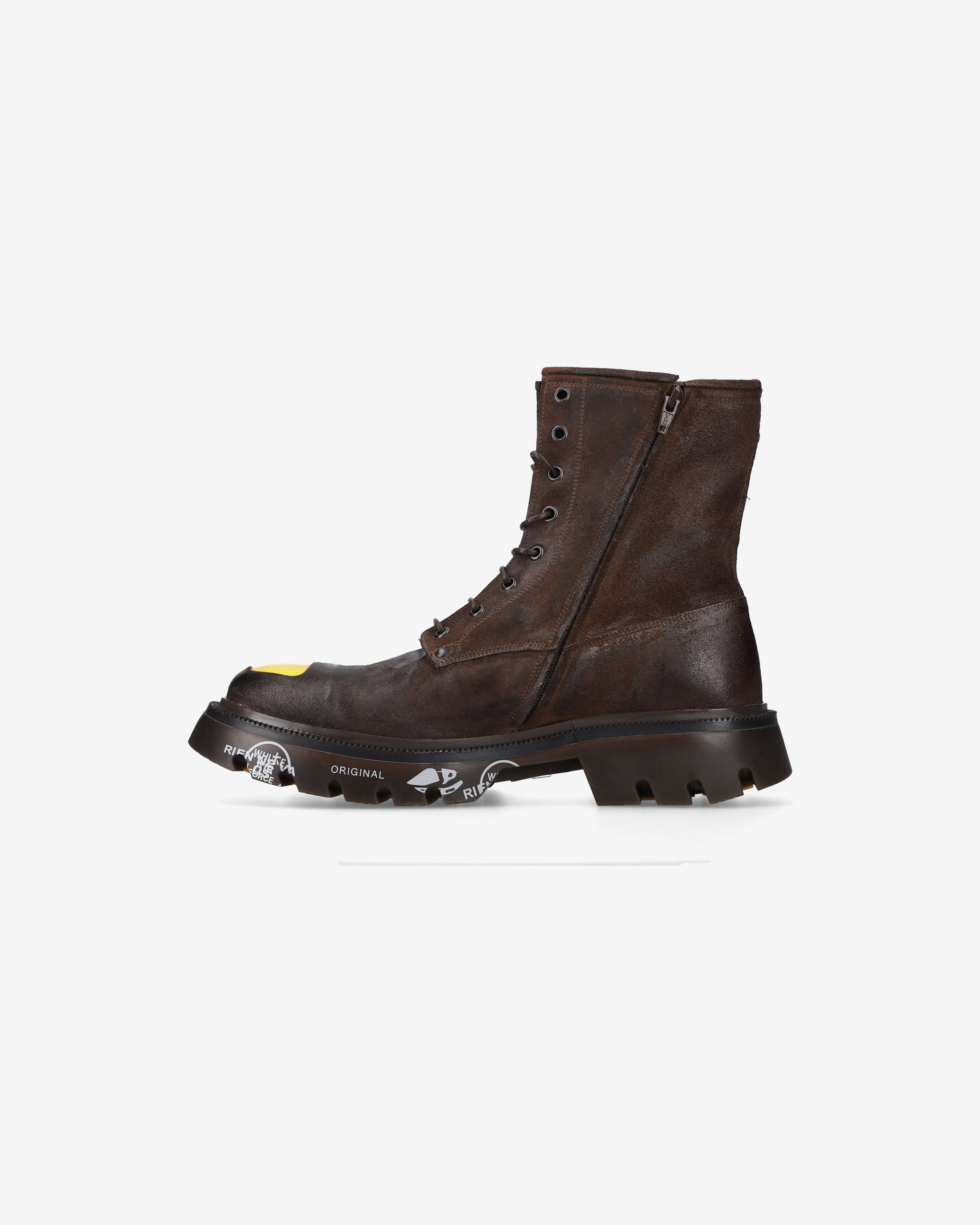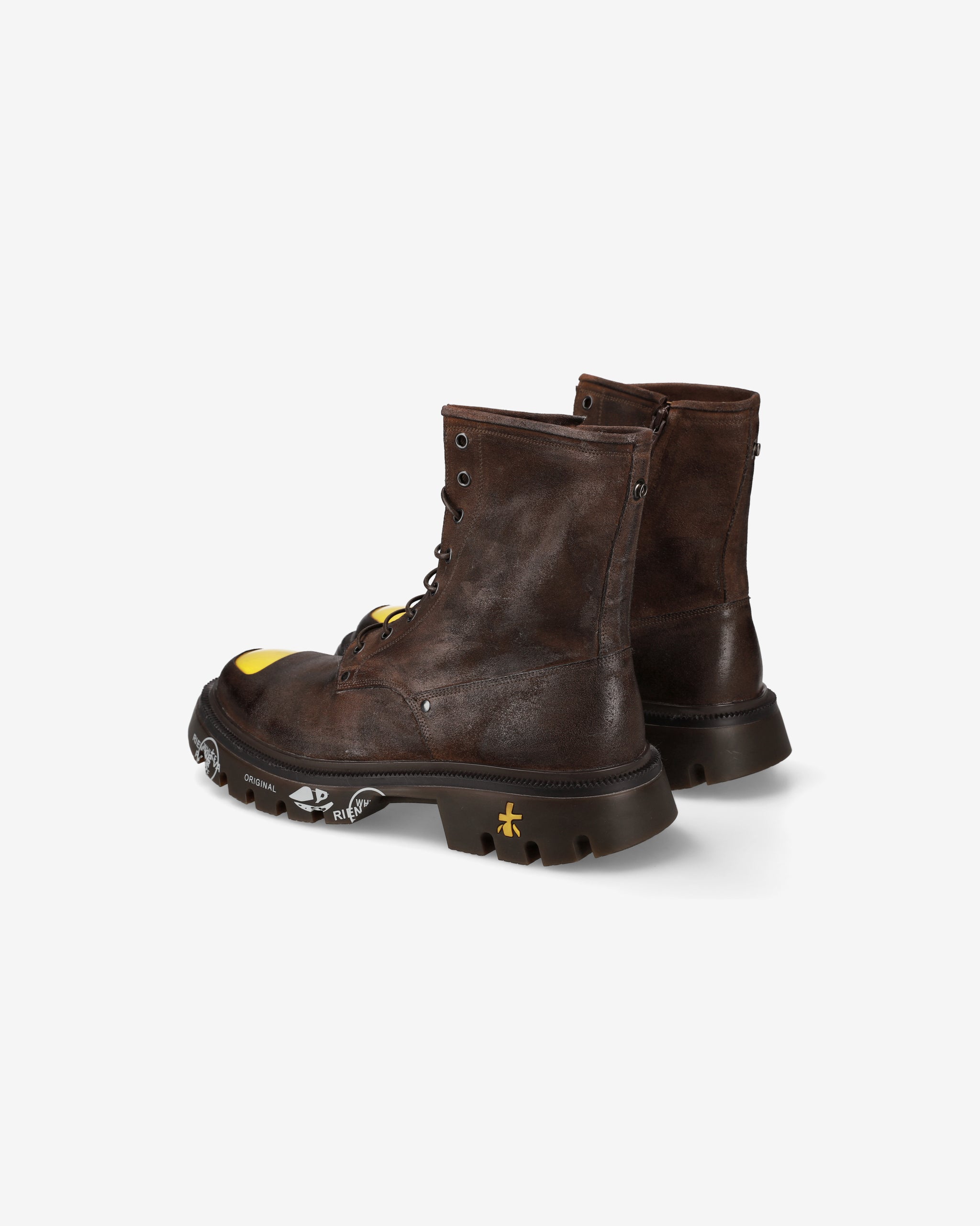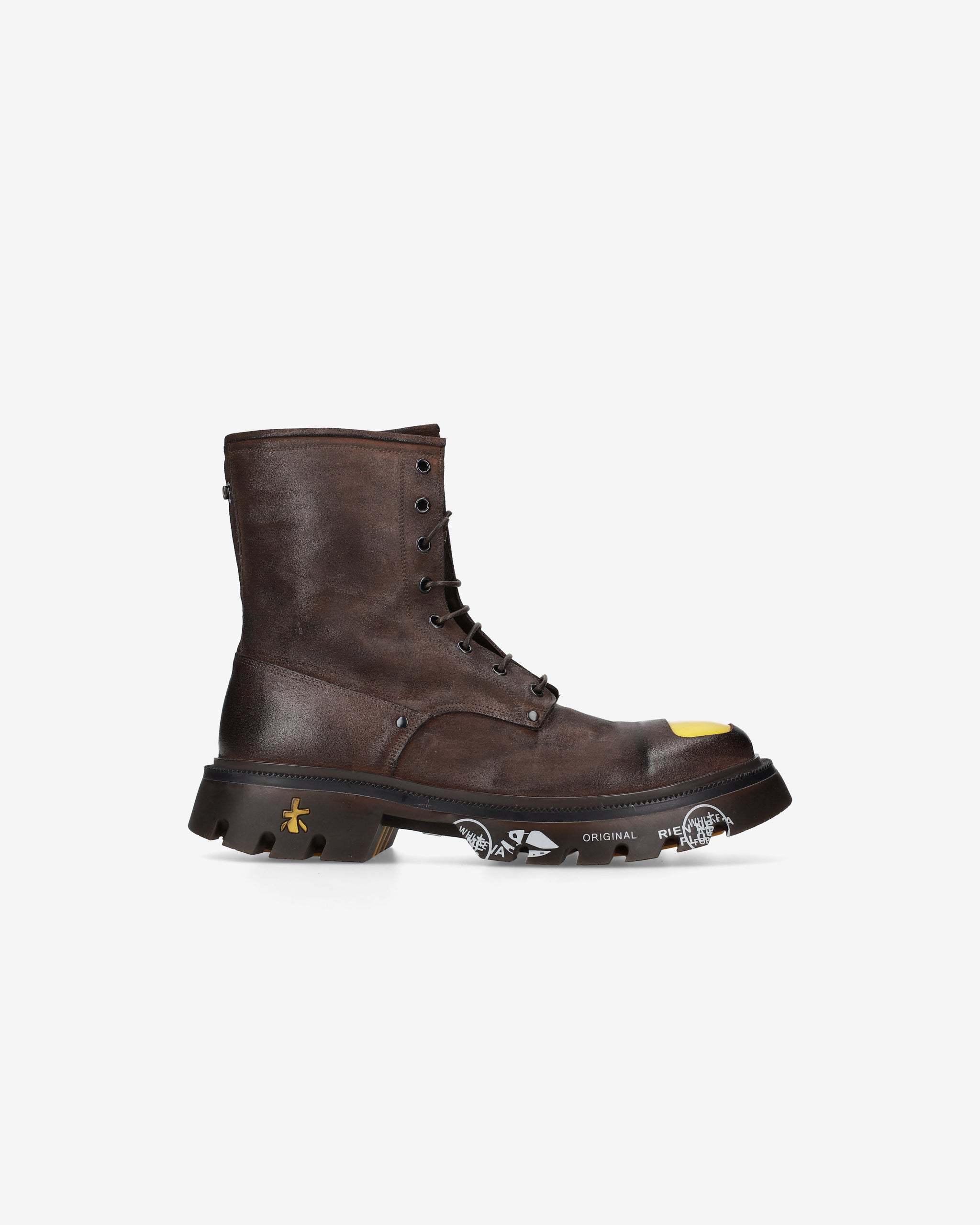 Greased crust leather amphibian with contrasting sunflower-colored toe cap and logo, translucent dark brown rubber bottom. A bold and distinctive design inspired by London's underground aesthetic.