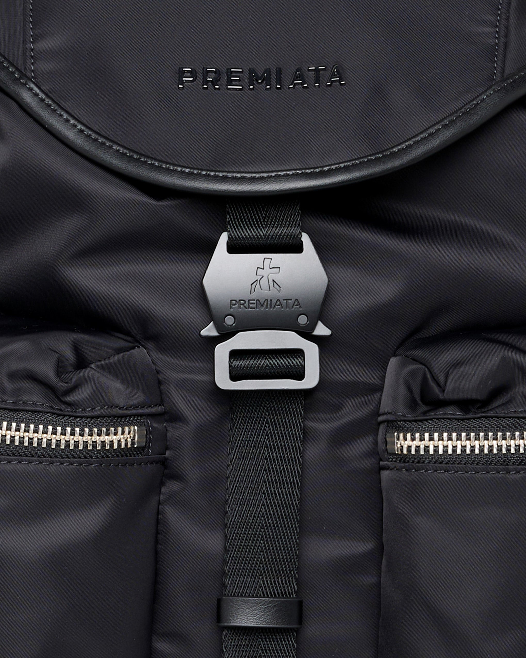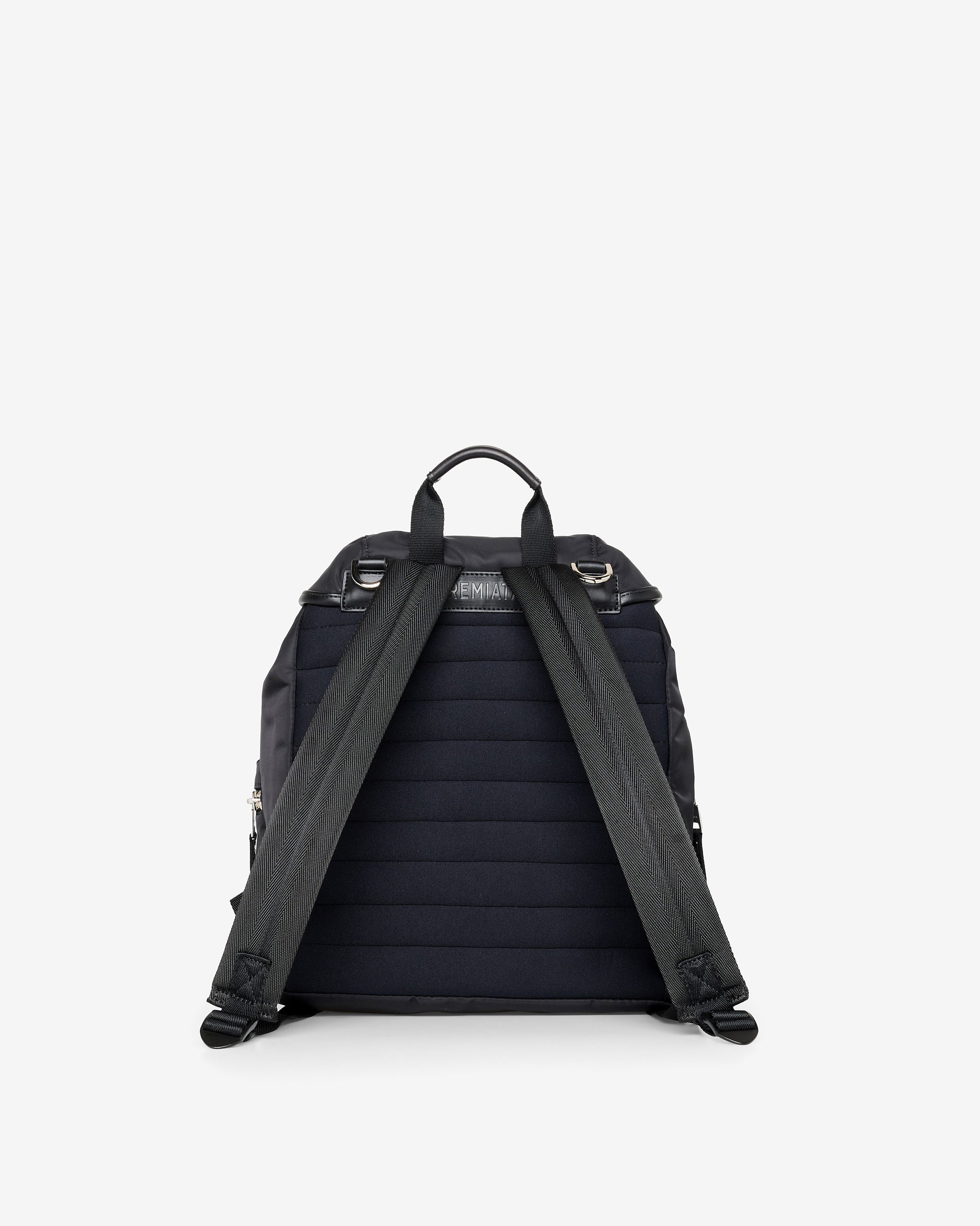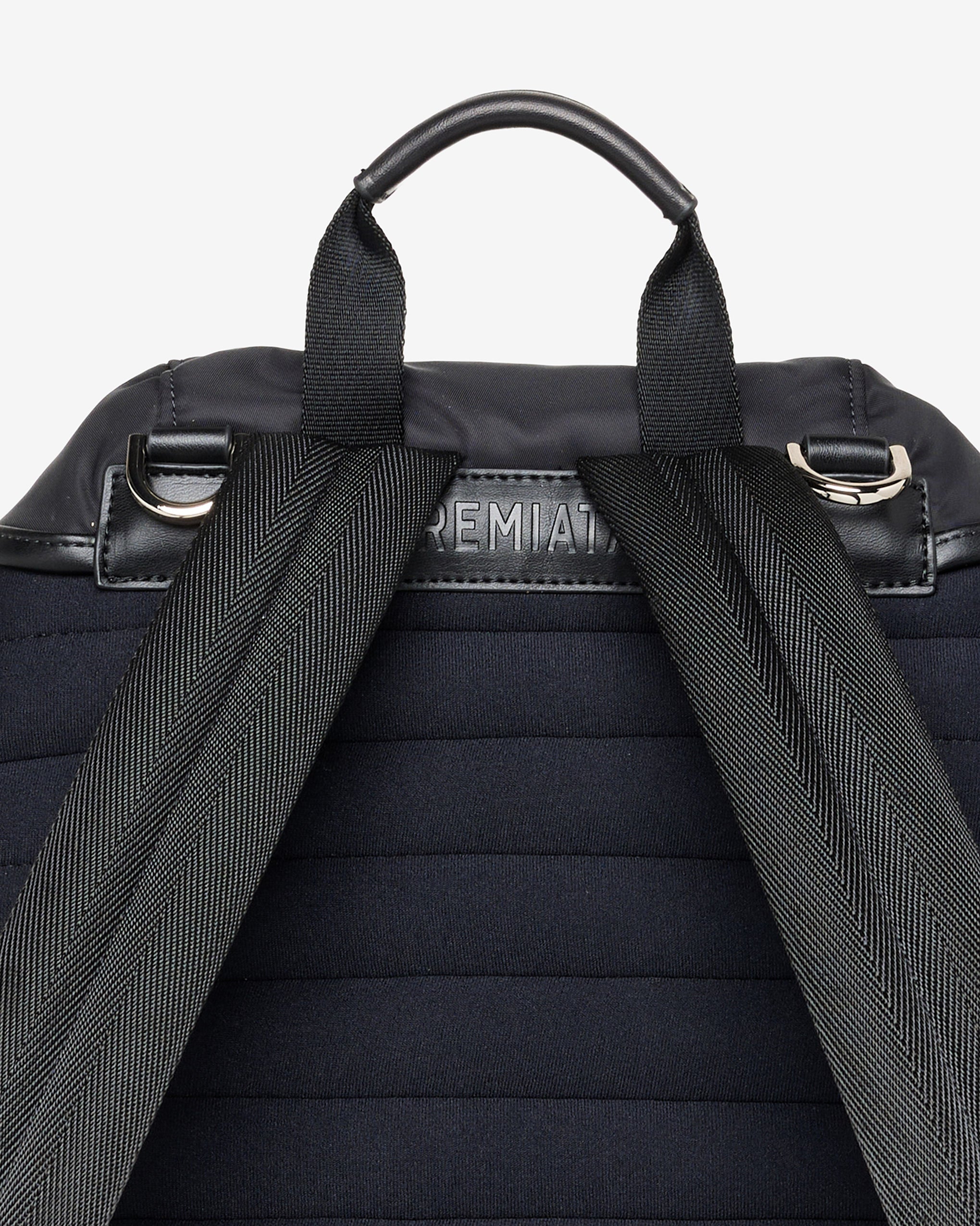 A spacious and versatile model in soft, high-quality rubberized fabric. EVA-padded back and shoulder straps for greater comfort. Side pockets with calfskin leather trim and matte metal closures.